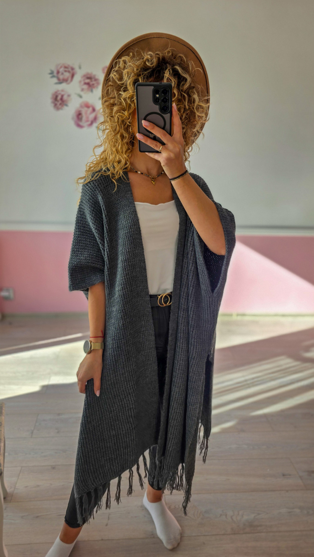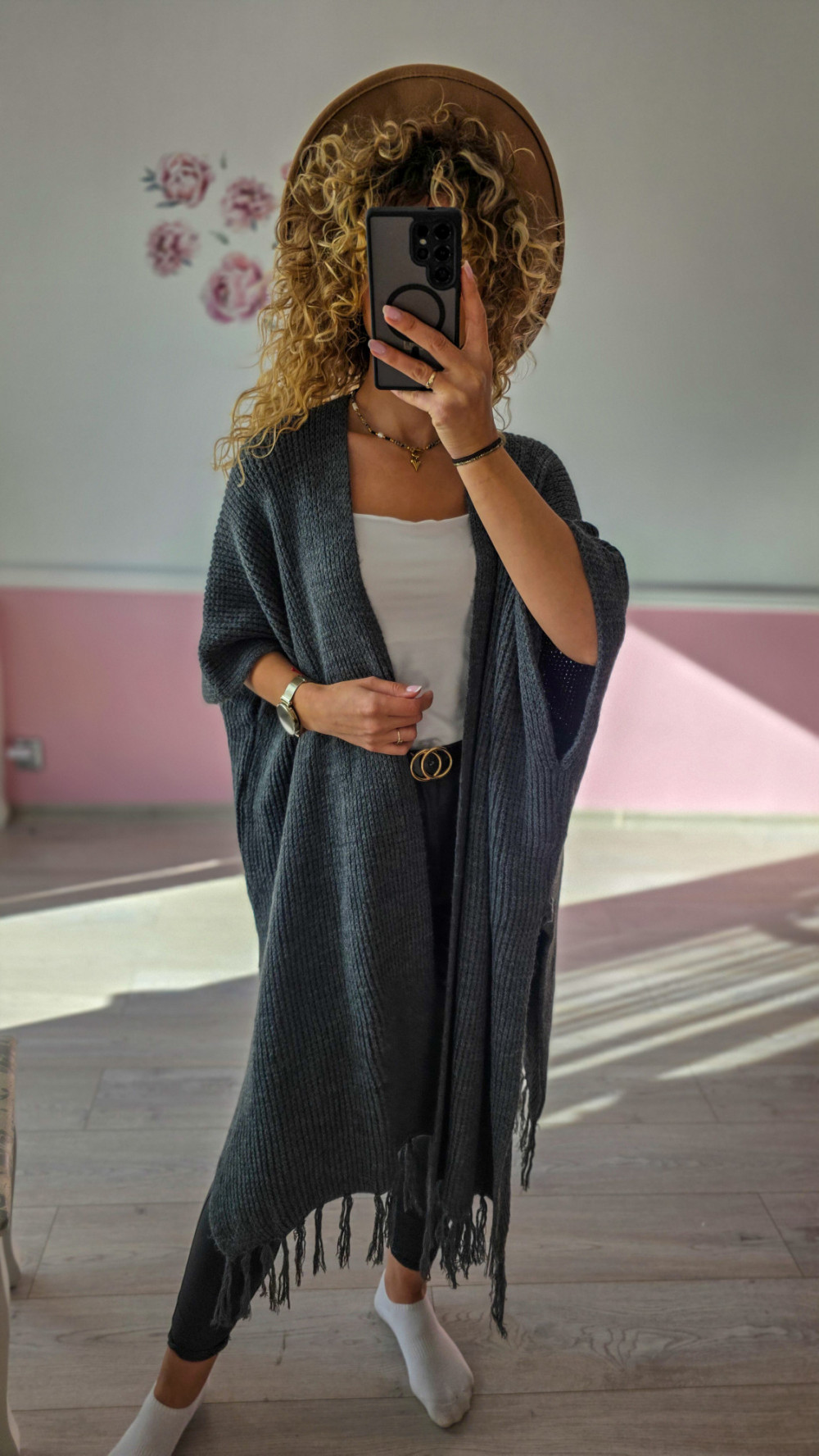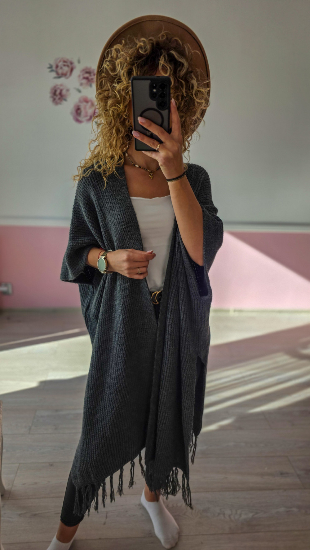 Postaw na styl i wygodę z szarym ponczo damskim z frędzlami, które łączy elegancję z casualowym luzem. Wykonane z miękkiej, ciepłej dzianiny, idealnie sprawdzi się w chłodniejsze dni. Swobodny krój pięknie układa się na sylwetce, a ozdobne frędzle nadają całości lekkości i wyjątkowego charakteru.