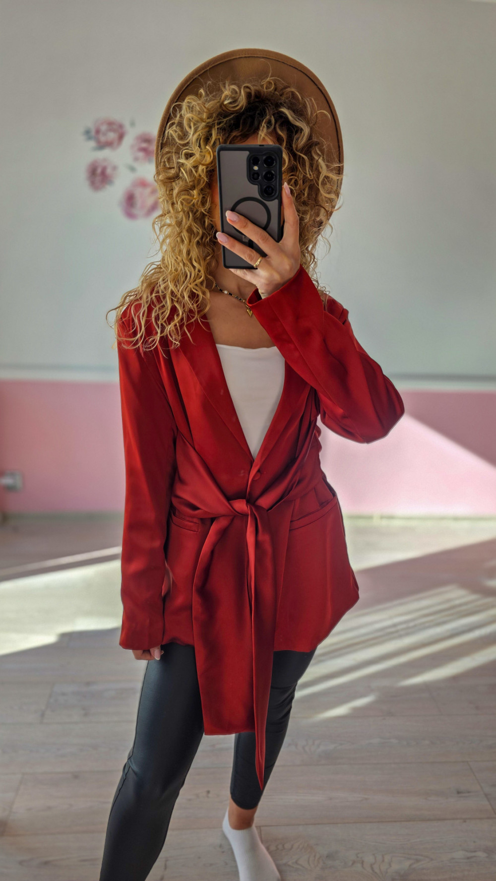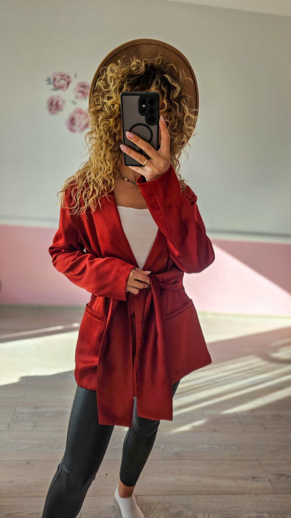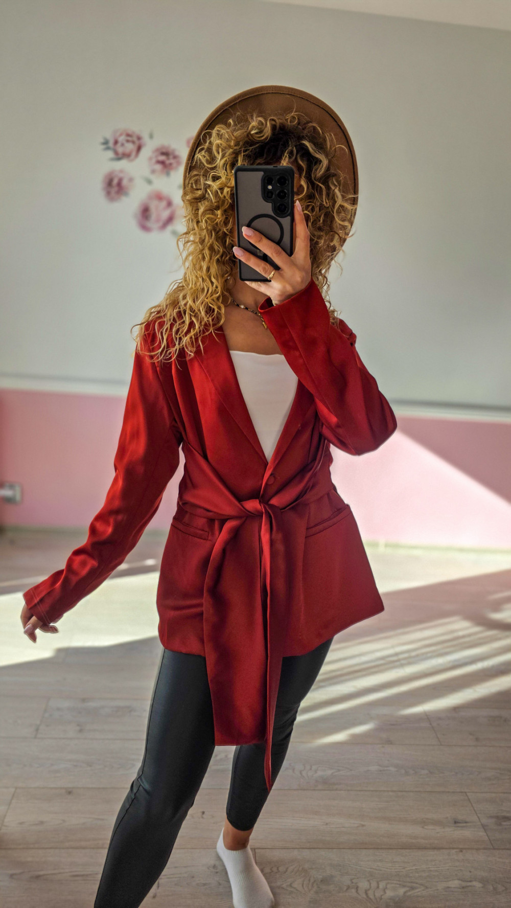 Wyrazisty i kobiecy czerwony żakiet damski z paskiem to idealna propozycja dla pań, które lubią podkreślać swój styl i sylwetkę. Miękki, przyjemny w dotyku materiał i klasyczny krój z wiązaniem w talii gwarantują elegancki wygląd oraz wygodę przez cały dzień.