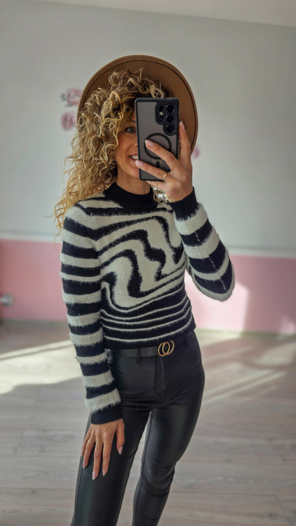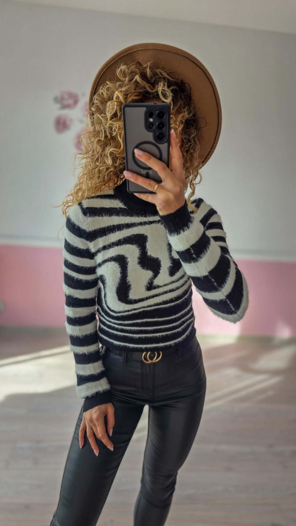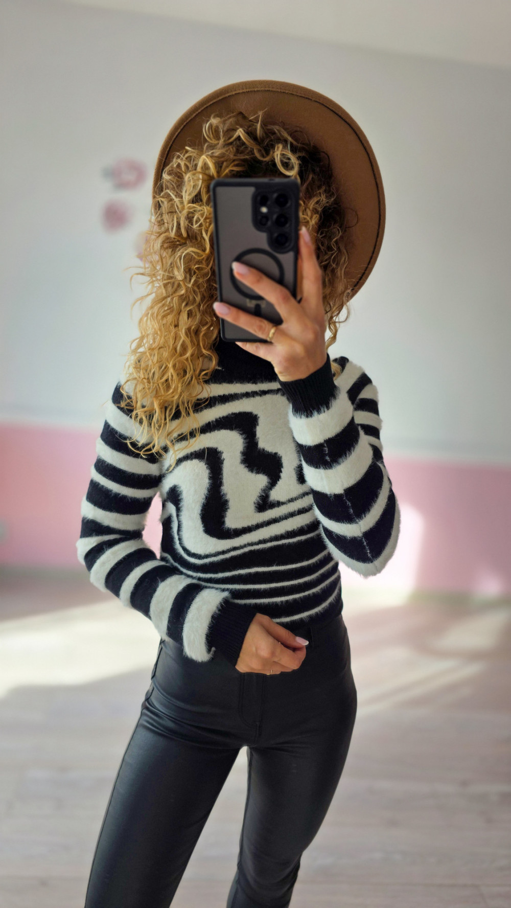 Modny wzór w stylu zebra dodaje charakteru każdej stylizacji, a dopasowany krój pięknie podkreśla sylwetkę. Idealny do jeansów, spodni z wysokim stanem lub spódnicy.