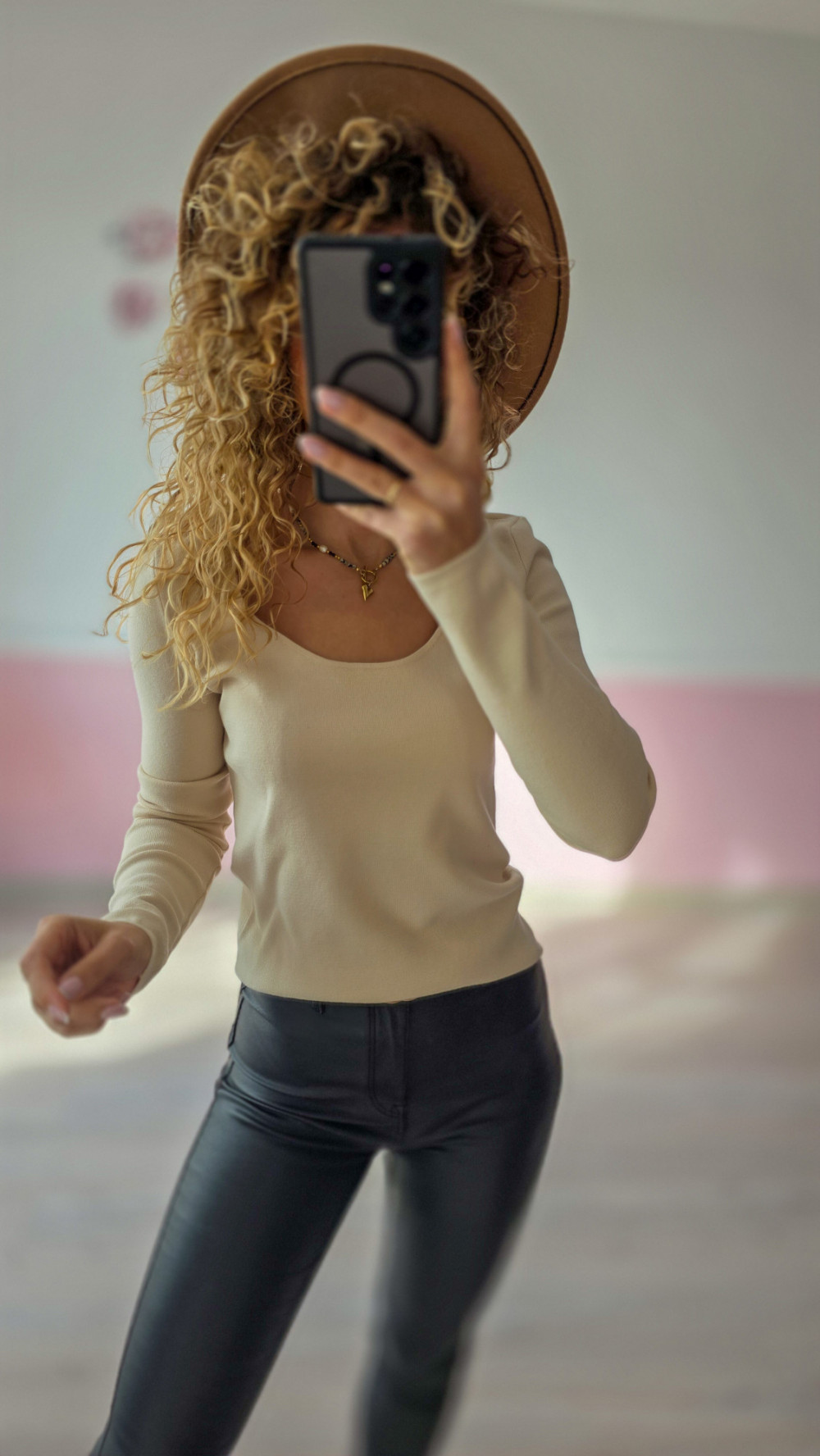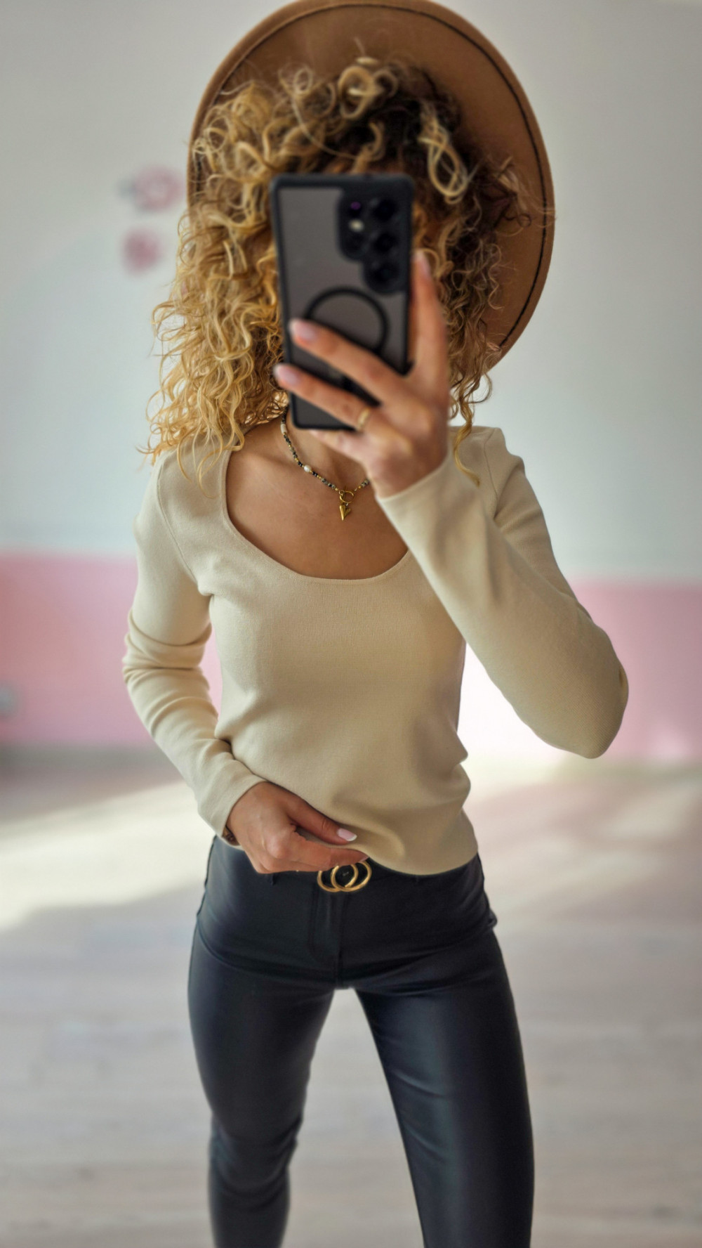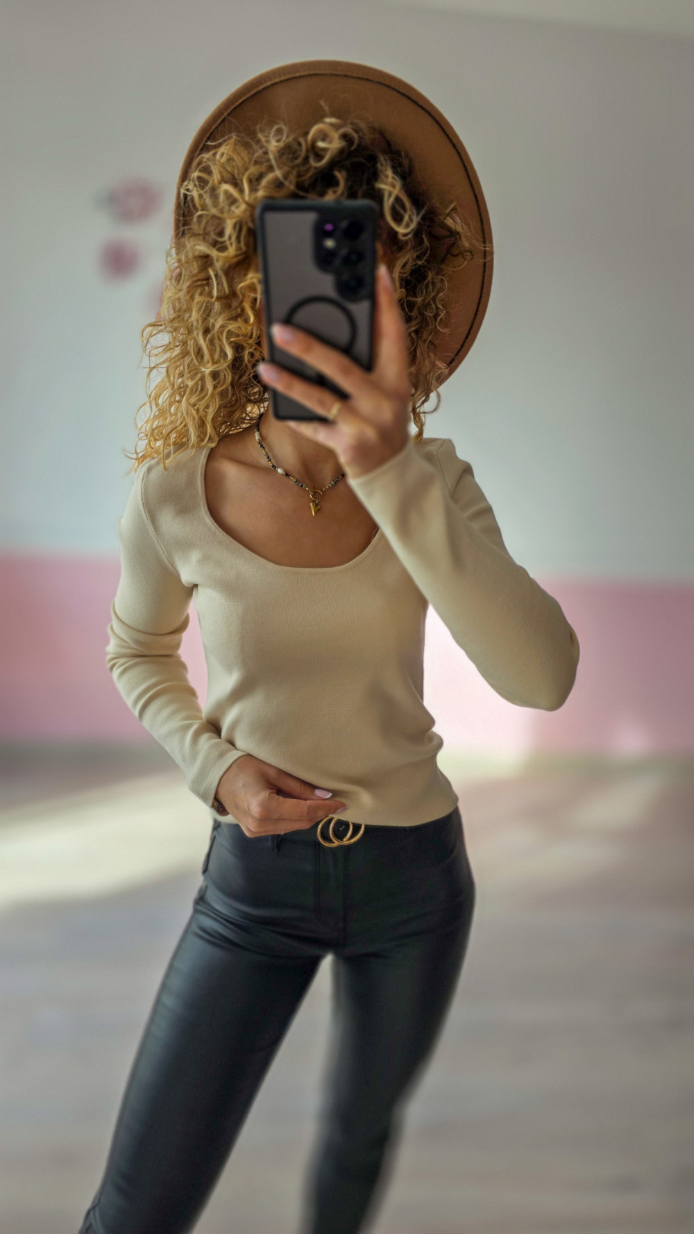 Uniwersalna i kobieca beżowa bluzka z dekoltem w serek to idealny element stylizacji na każdą okazję. Wykonana z miękkiego, elastycznego materiału, zapewnia komfort noszenia i doskonałe dopasowanie.