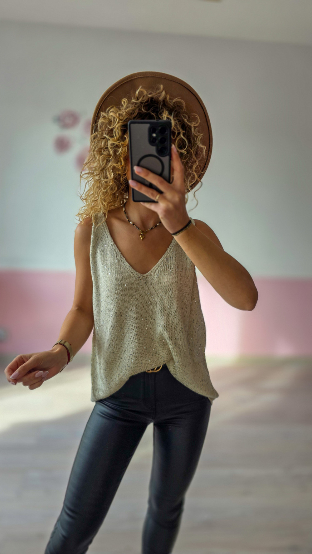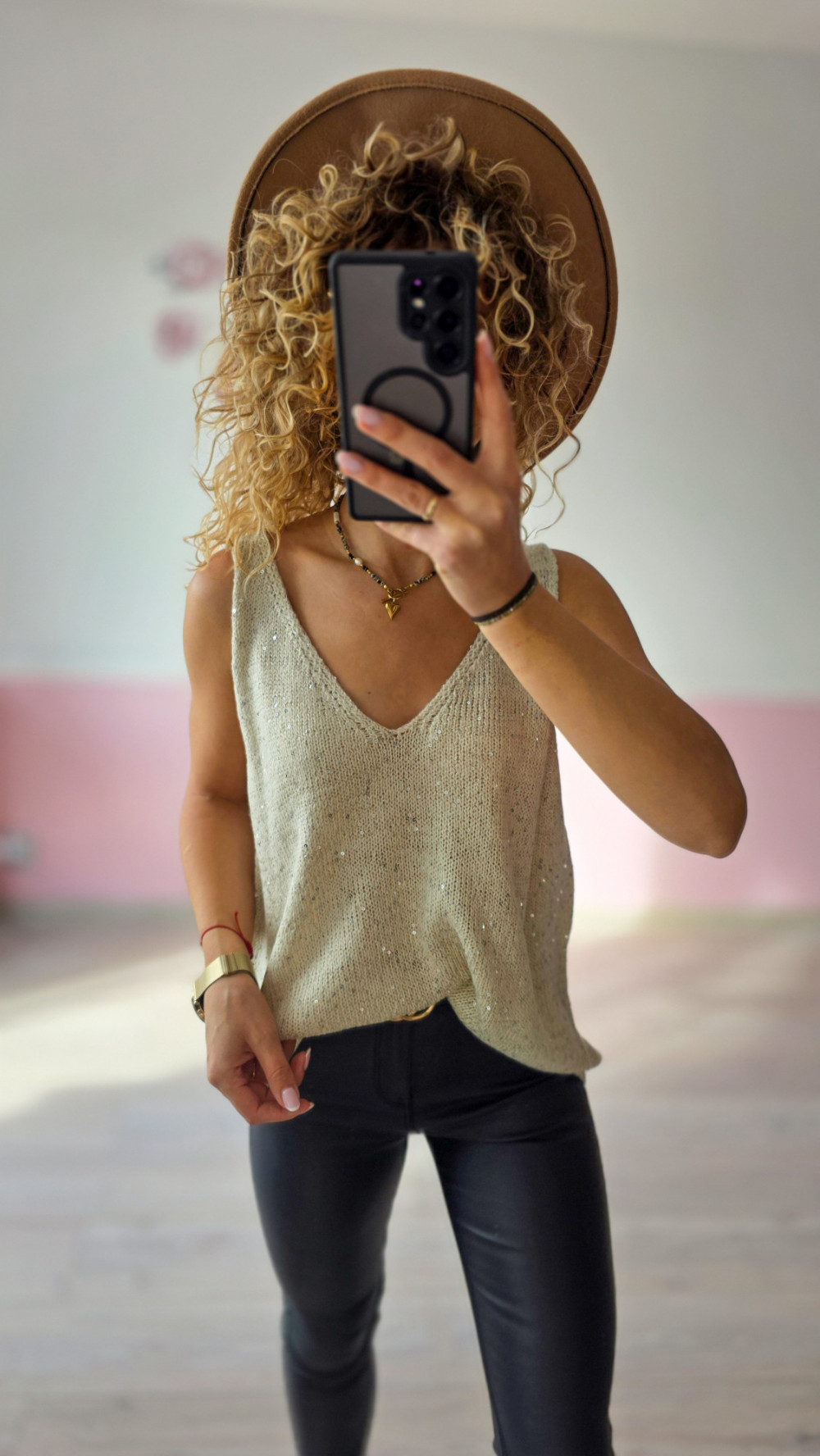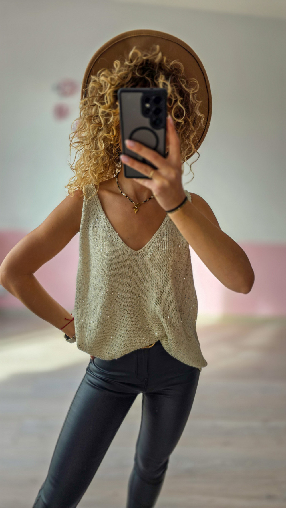 Olśnij subtelnym blaskiem! Beżowy top damski z połyskiem to idealna propozycja dla kobiet, które lubią połączenie elegancji i wygody. Wykonany z lekkiej, przewiewnej dzianiny z delikatnym połyskiem, pięknie układa się na ciele.