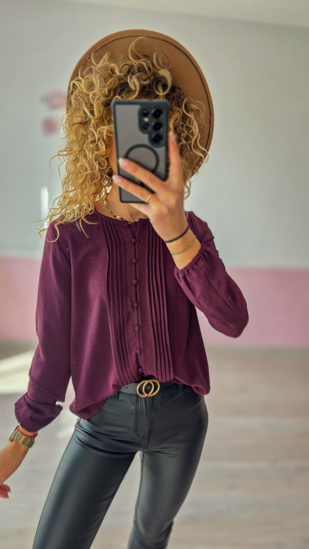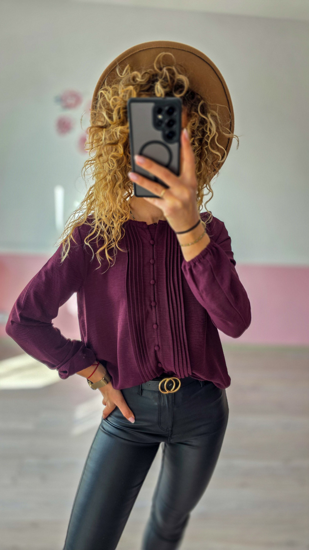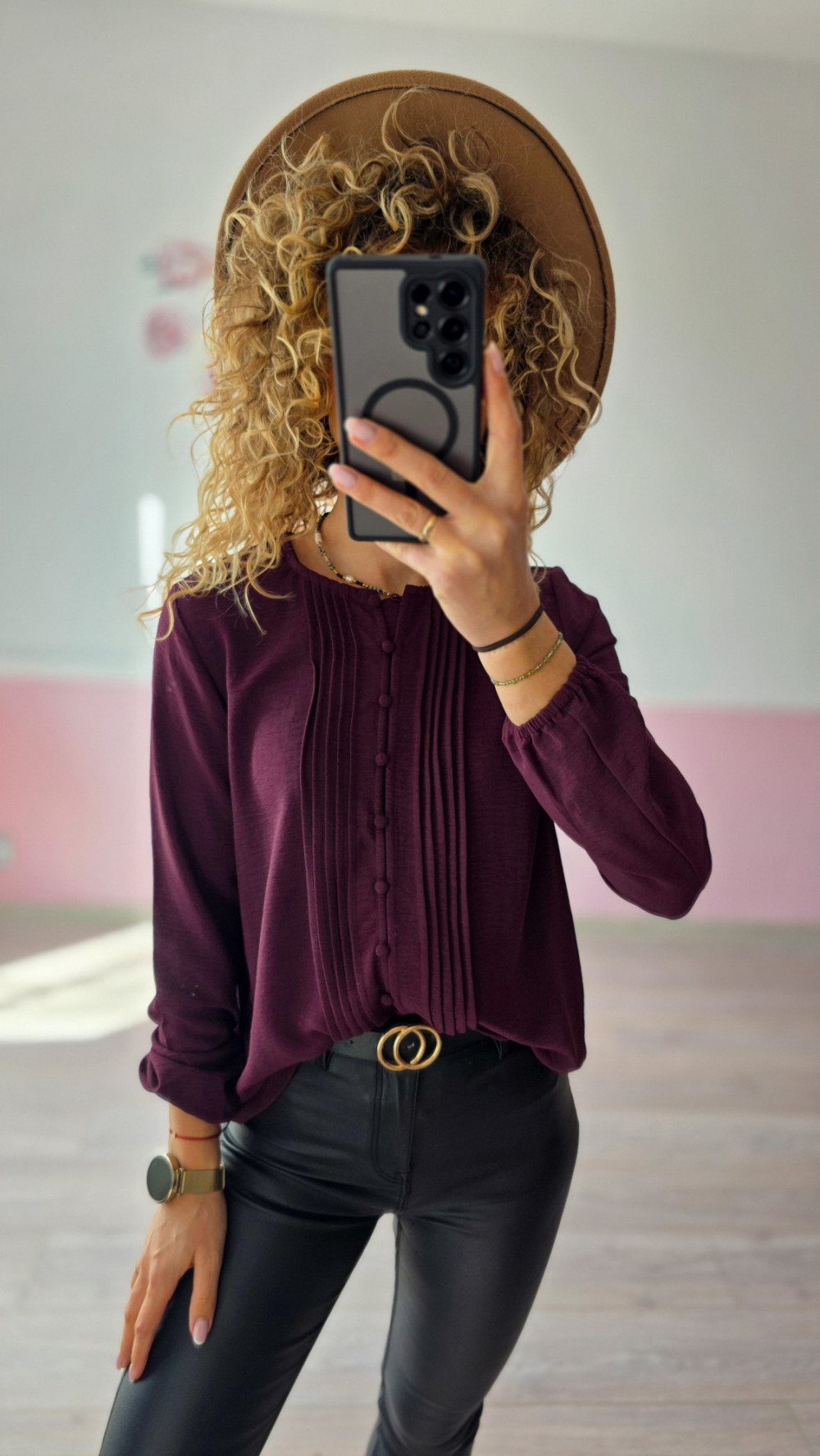 Elegancka bordowa koszula damska to idealne połączenie klasy i kobiecości. Wykonana z lekkiego, przyjemnego w dotyku materiału, pięknie układa się na sylwetce, a pionowe plisowania optycznie ją wysmuklają. Drobne, materiałowe guziki i subtelne mankiety dodają całości uroku w stylu vintage.