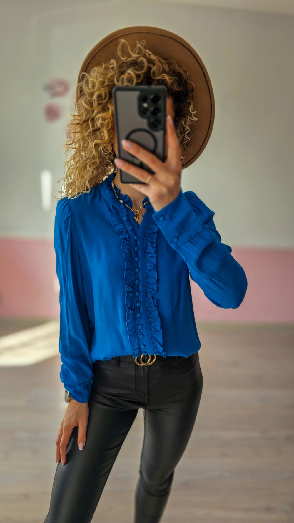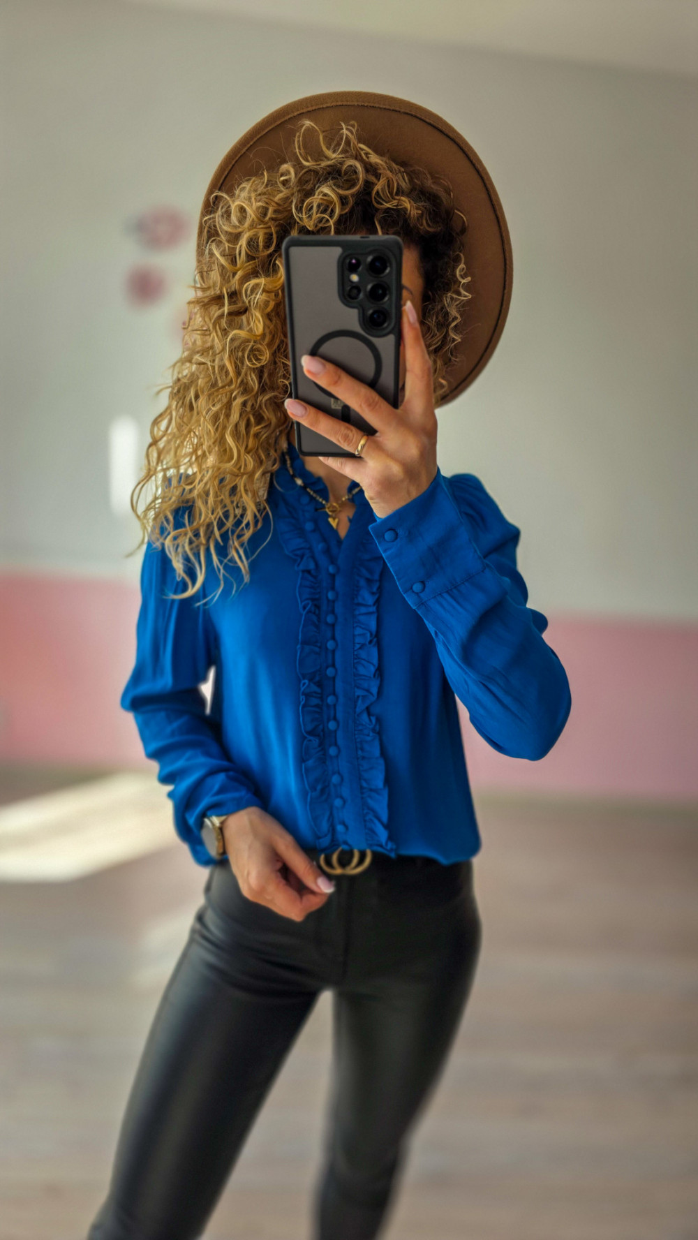 Jeśli szukasz bluzki, która przyciągnie spojrzenia, niebieska koszula z falbankami będzie idealnym wyborem. Lekka, zwiewna tkanina pięknie układa się na ciele, a delikatne falbanki przy guzikach i kołnierzu dodają jej romantycznego charakteru.
