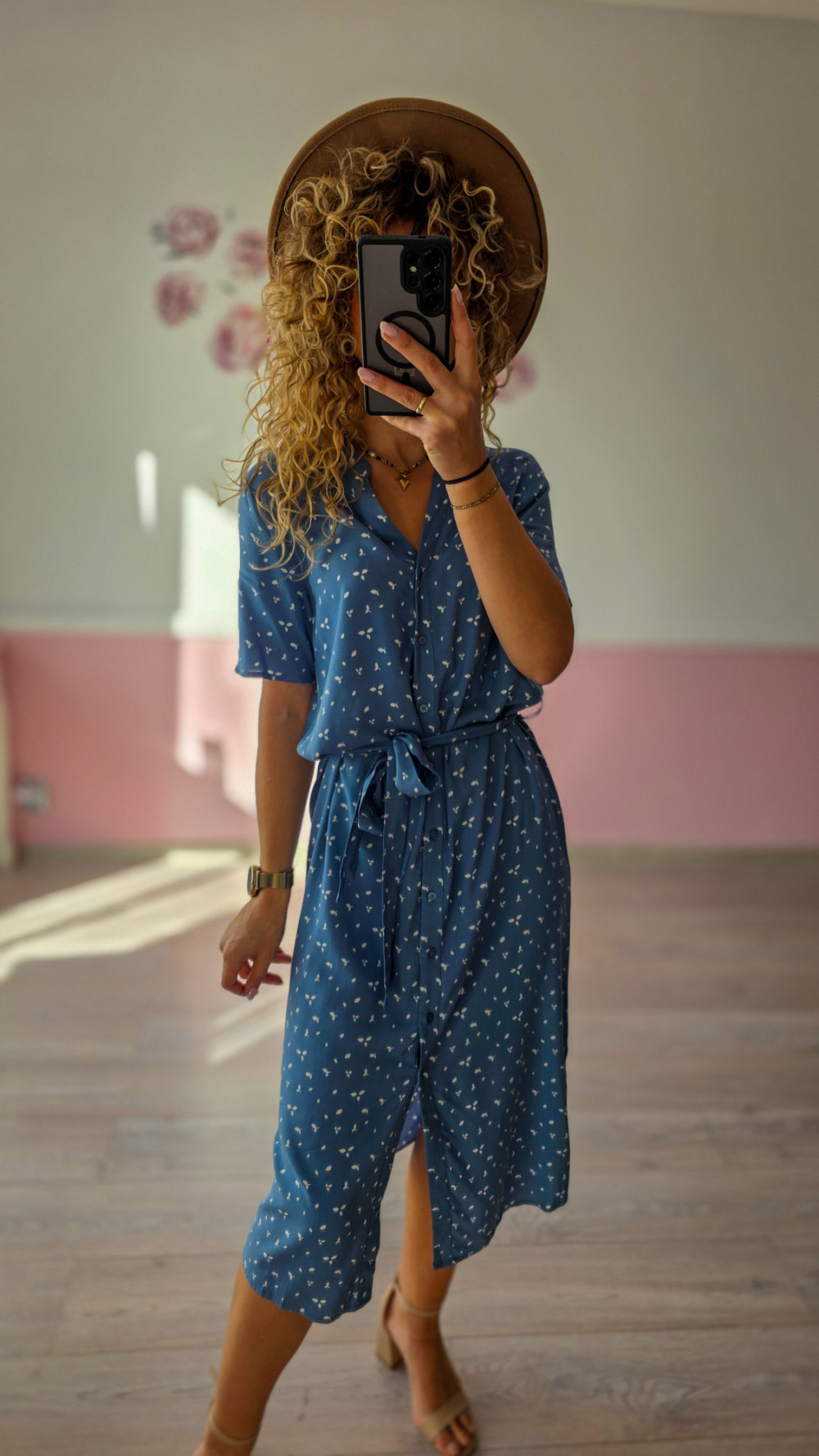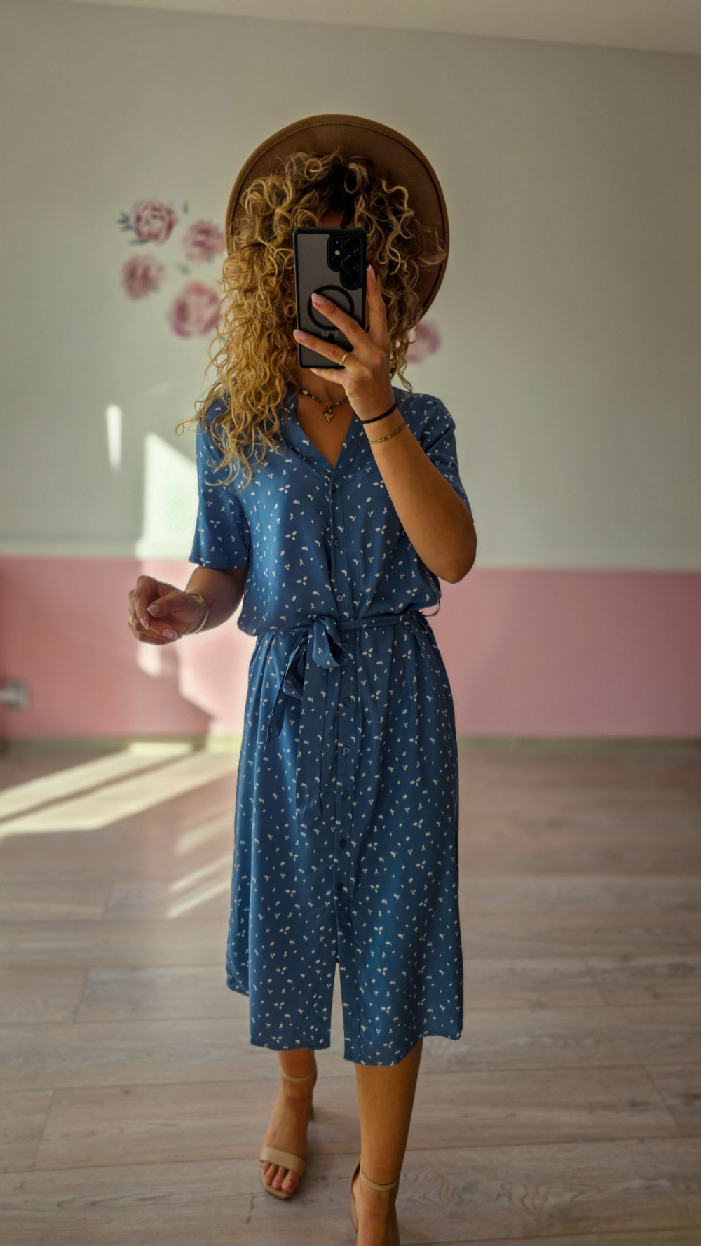 Lekka i stylowa niebieska sukienka koszulowa to idealny wybór na ciepłe dni. Wykonana z przewiewnego, delikatnego materiału, zapewnia komfort noszenia przez cały dzień. Drobny biały wzór dodaje jej dziewczęcego uroku, a pasek w talii pięknie podkreśla sylwetkę.