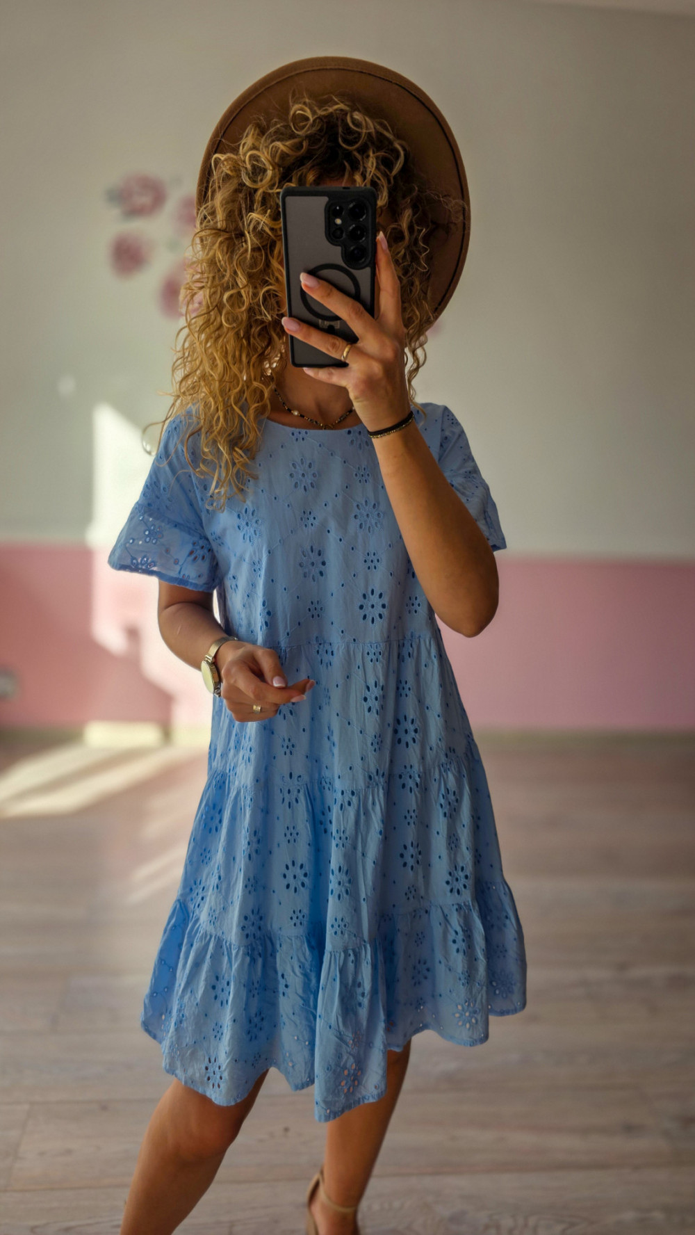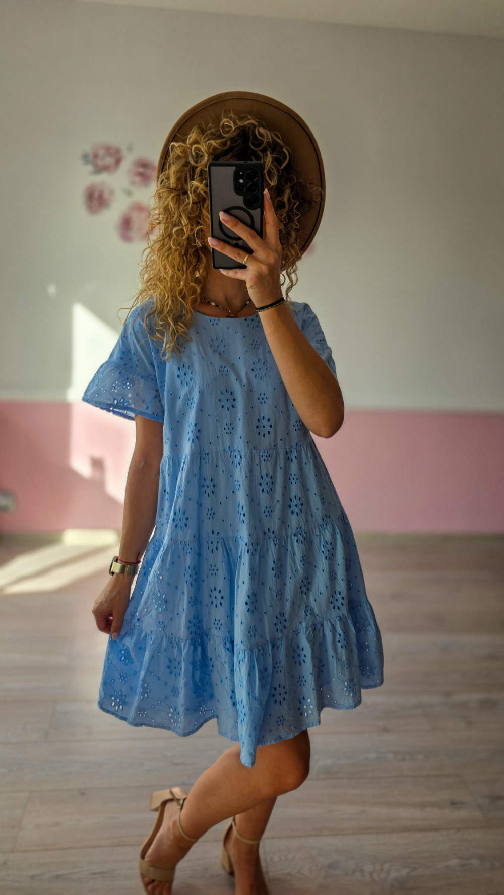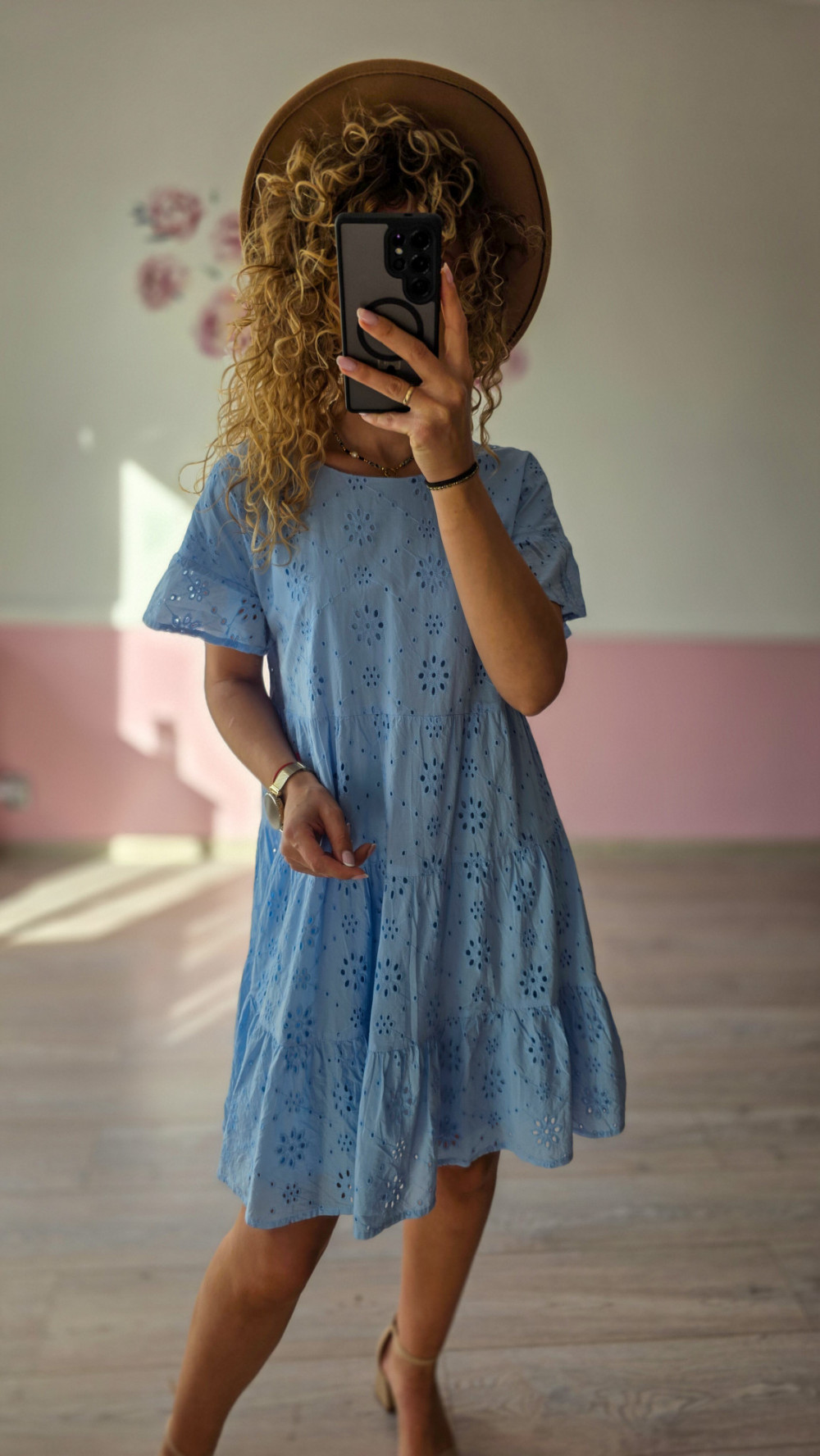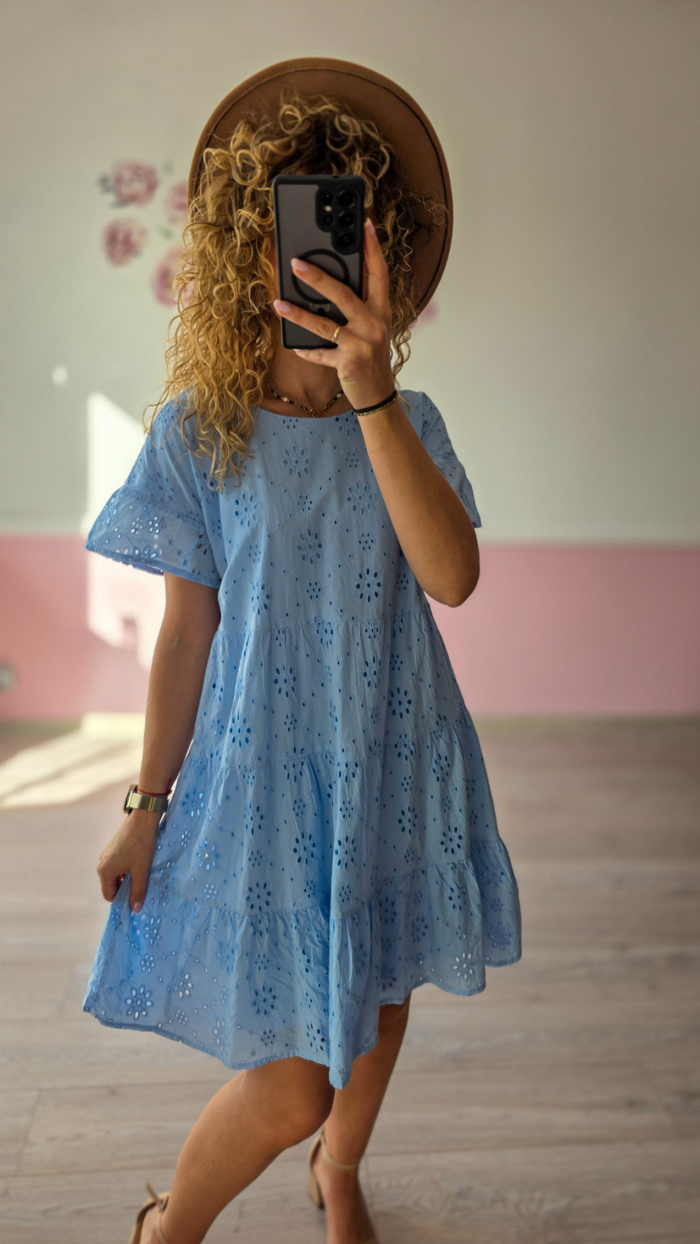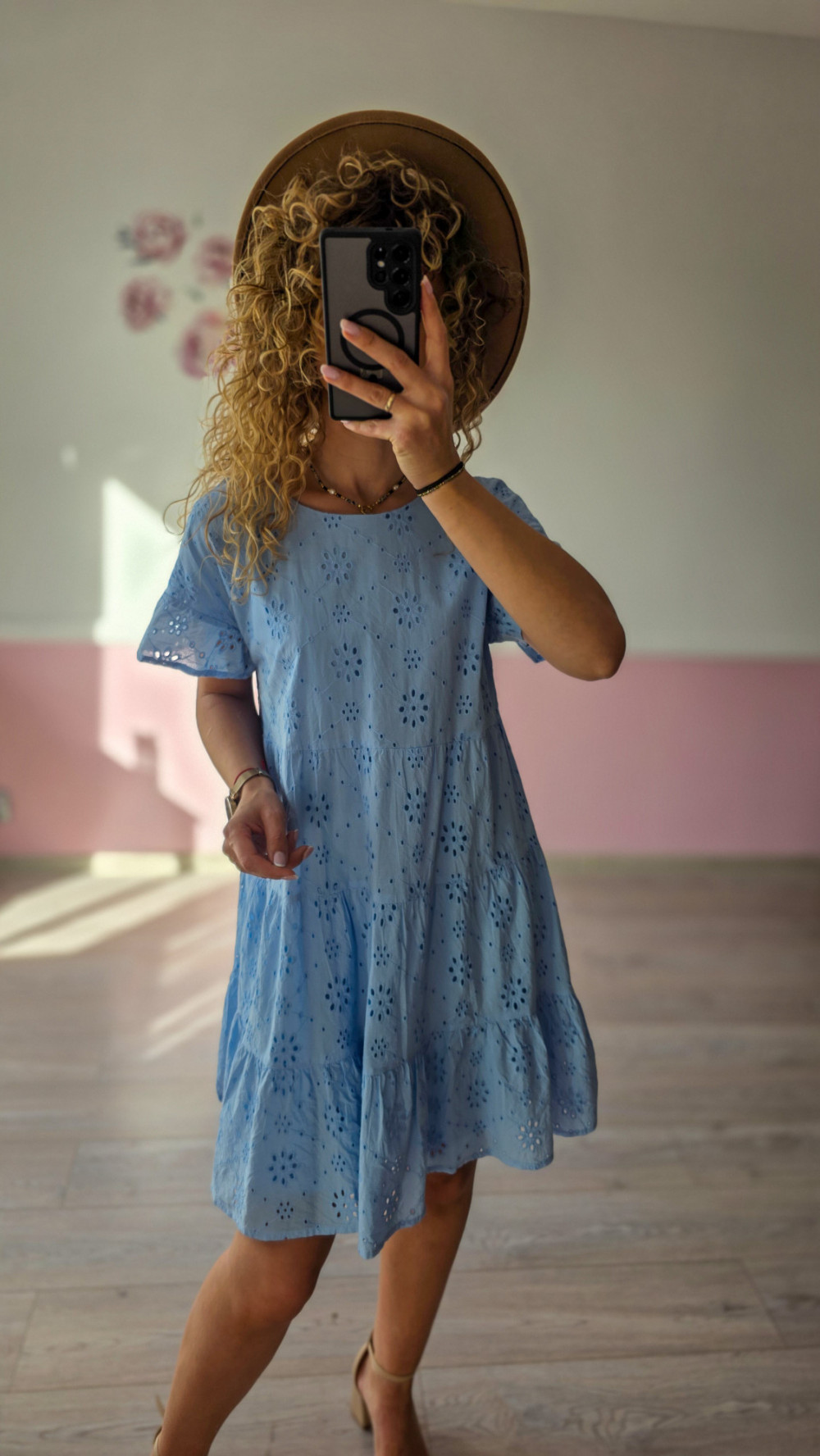 Romantyczna i dziewczęca błękitna sukienka ażurowa to model, który podbije Twoje serce! Wykonana z lekkiego, przewiewnego materiału z ozdobnym haftem, doskonale sprawdzi się w ciepłe dni. Krótkie rękawy i rozkloszowany dół z falbanami tworzą delikatny, zwiewny efekt.