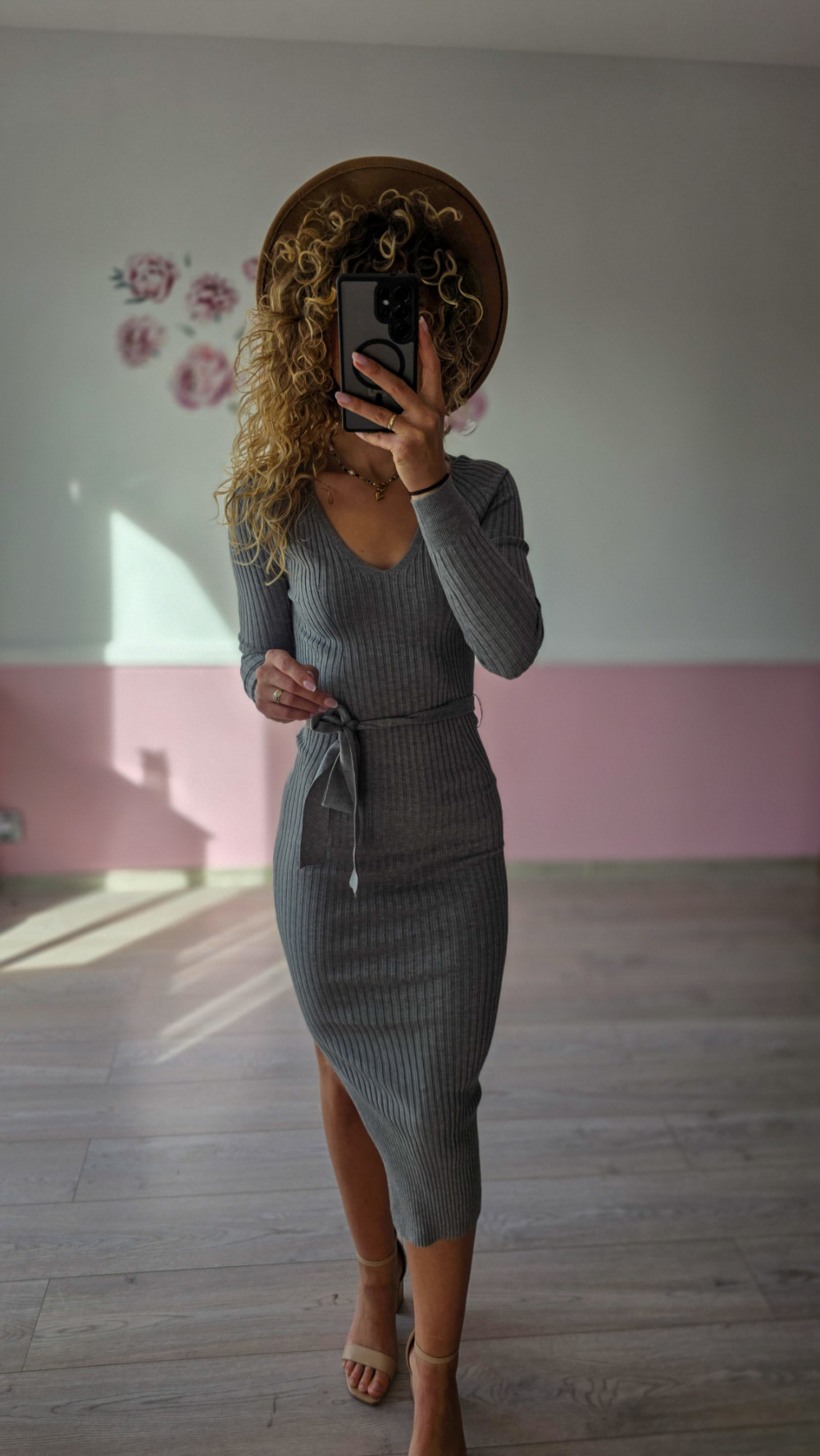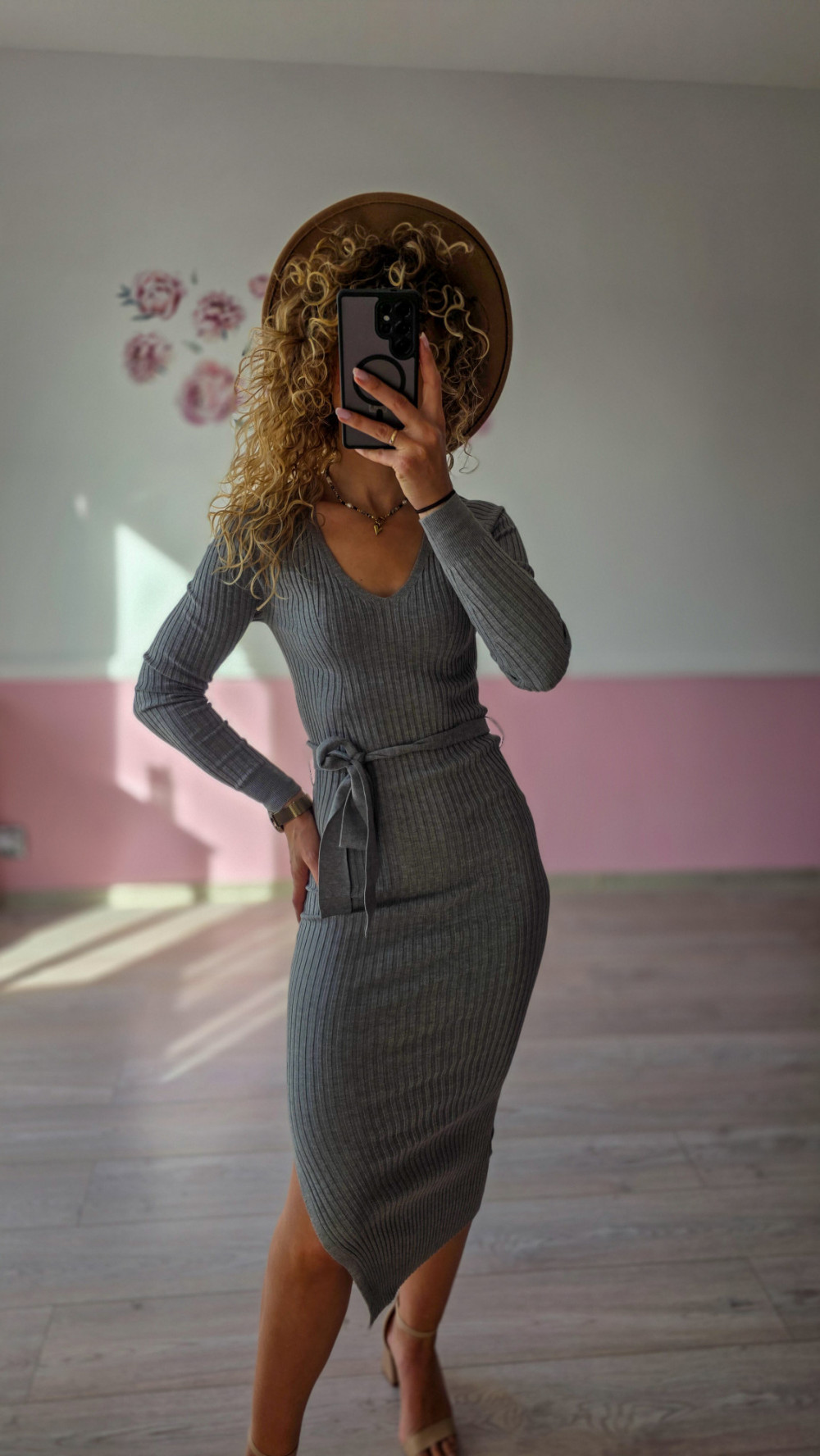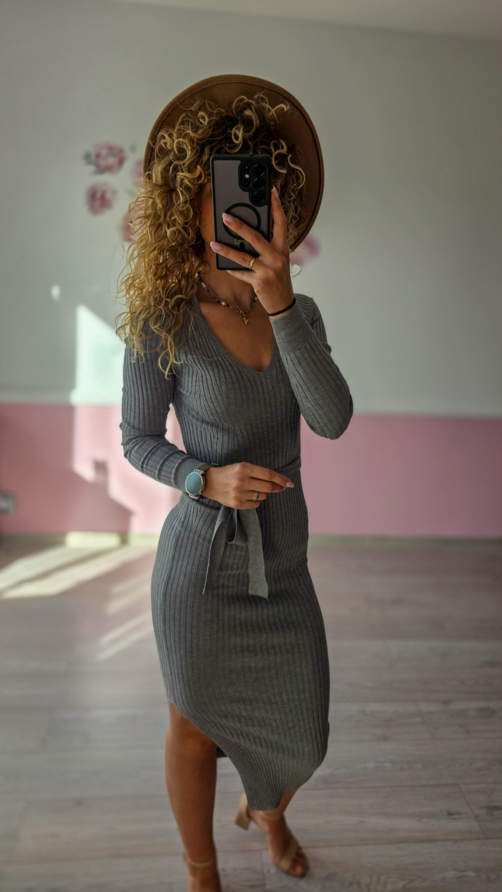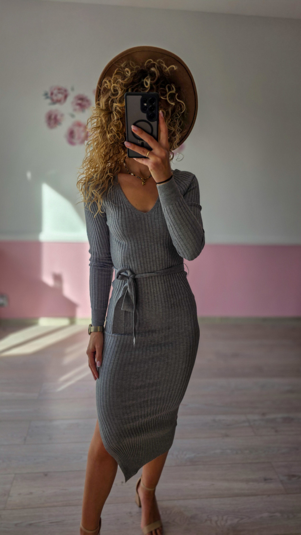Szara sukienka dzianinowa z paskiem i dekoltem V