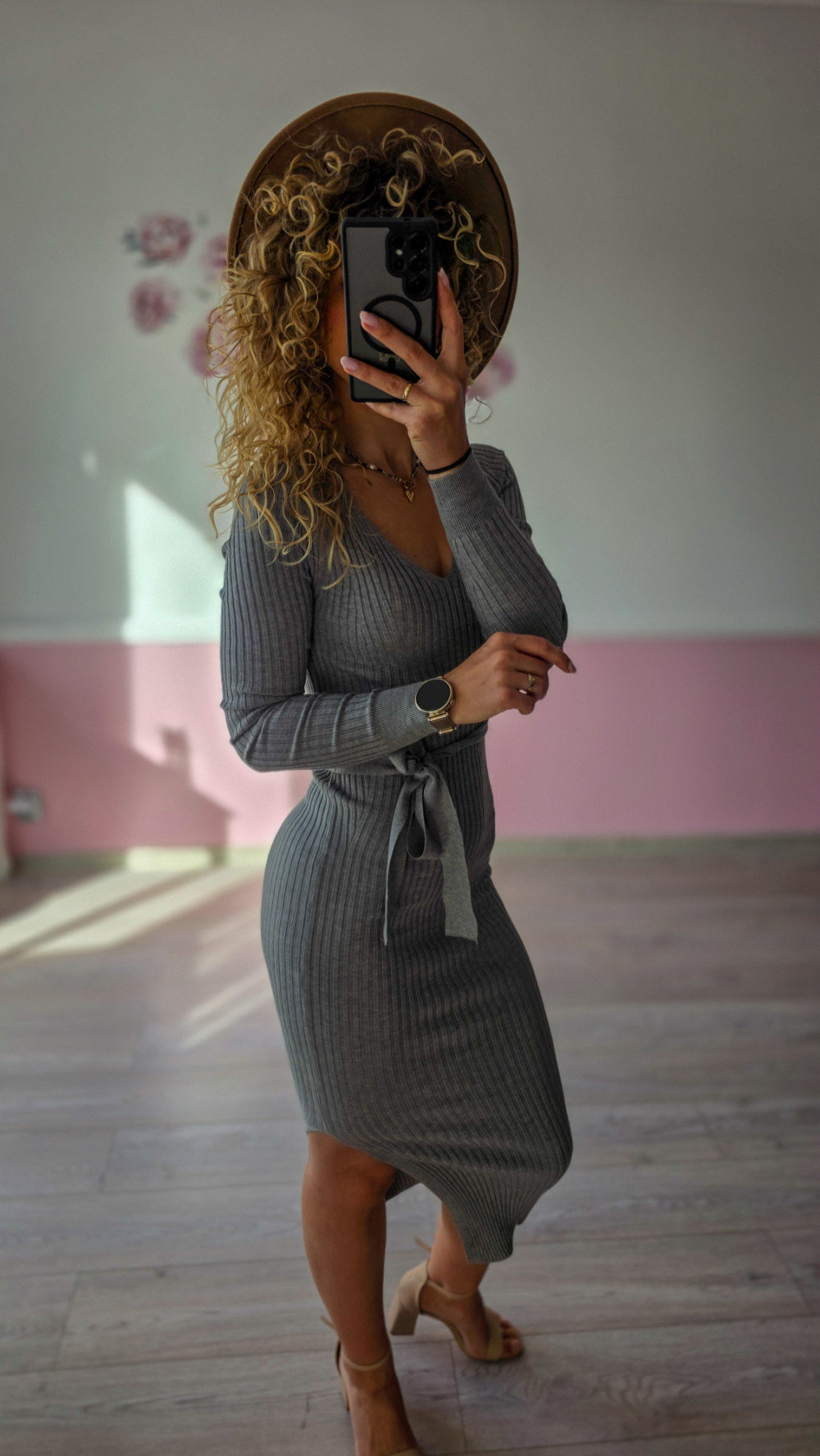 Klasyka i wygoda w jednym – szara sukienka dzianinowa to idealna propozycja dla kobiet, które lubią elegancję w codziennym wydaniu. Wykonana z miękkiej, prążkowanej dzianiny, pięknie dopasowuje się do sylwetki, podkreślając talię dzięki dołączonemu paskowi. Dekolt w kształcie litery V dodaje kobiecości i subtelnie eksponuje szyję.