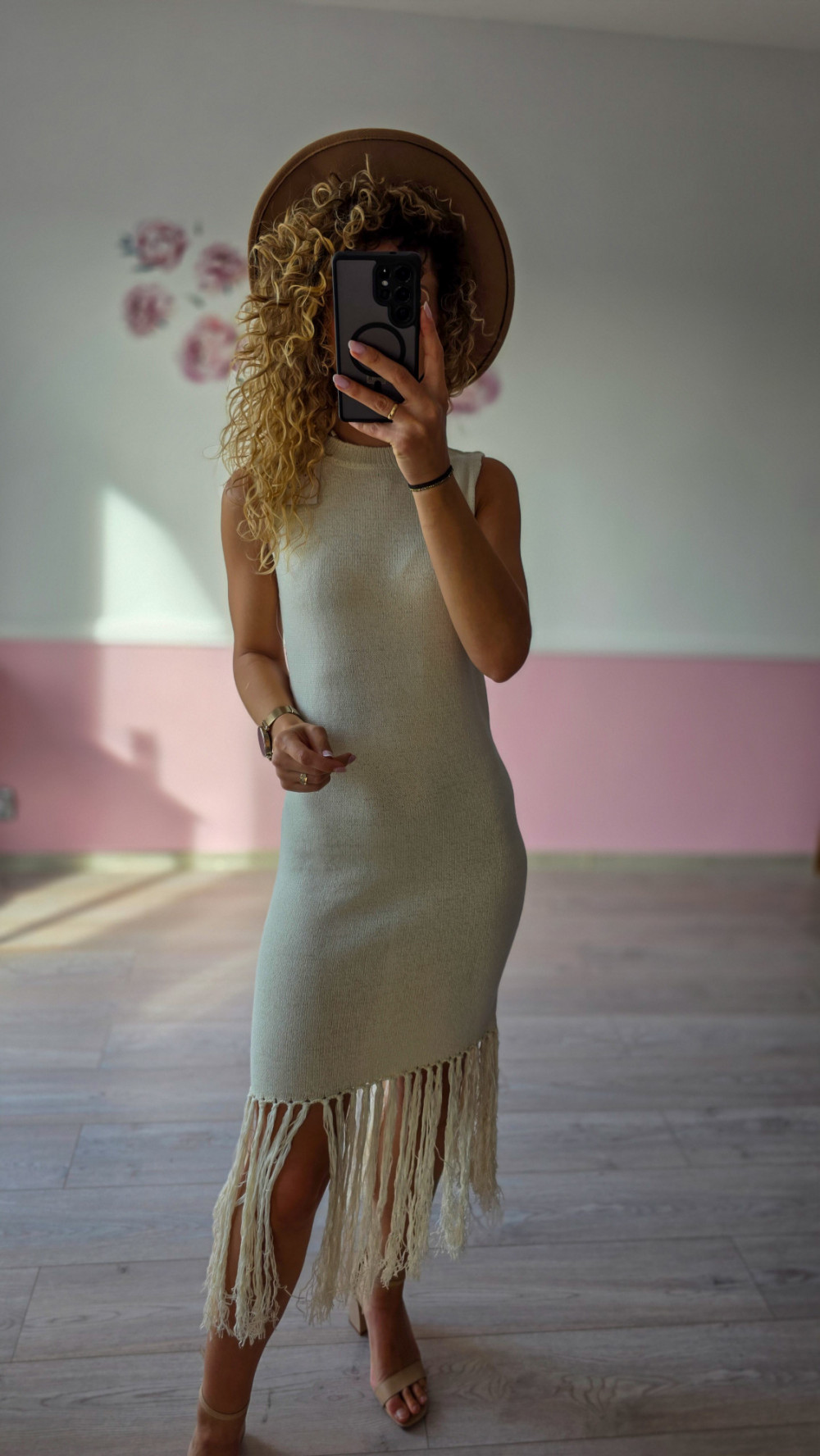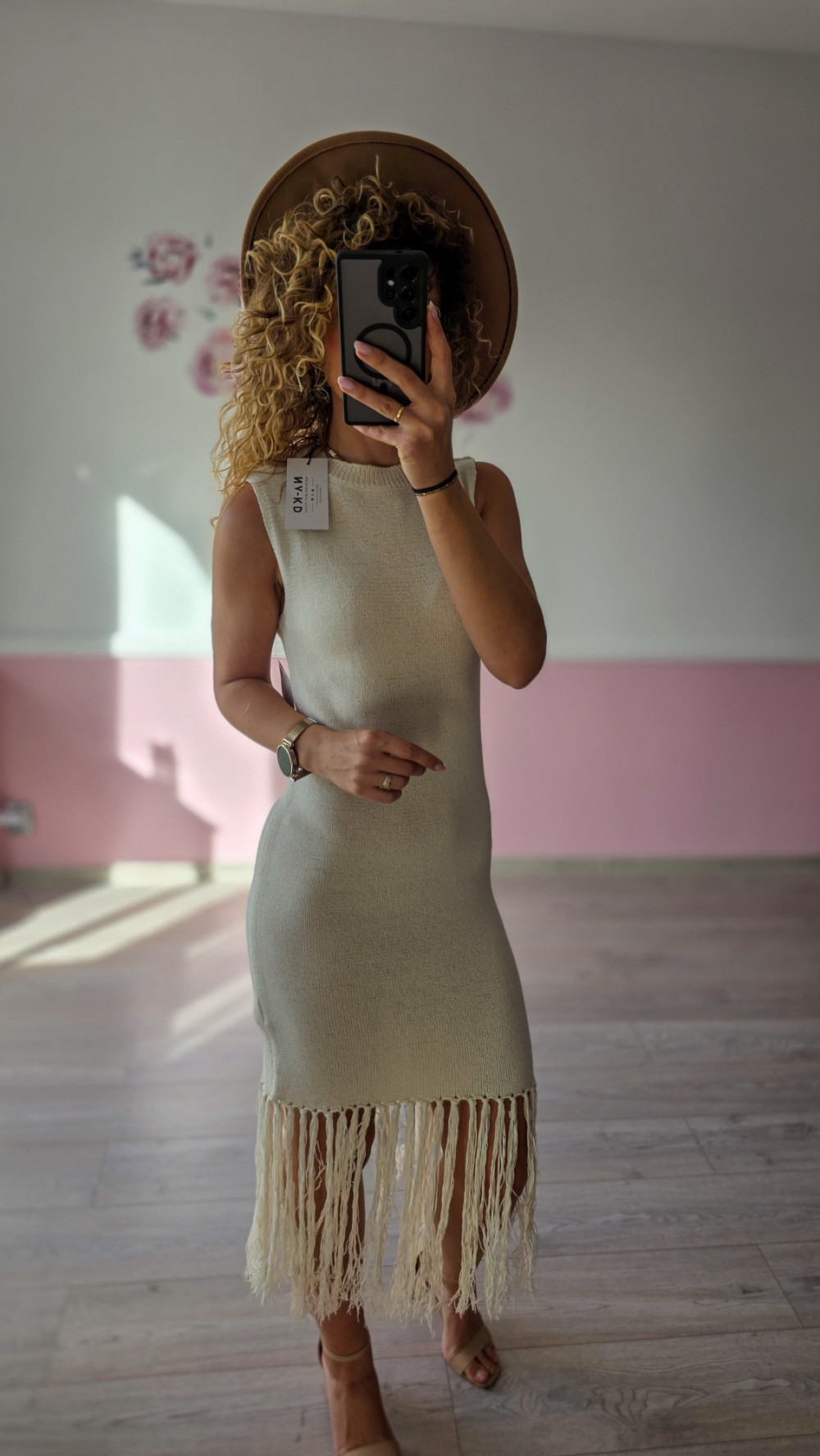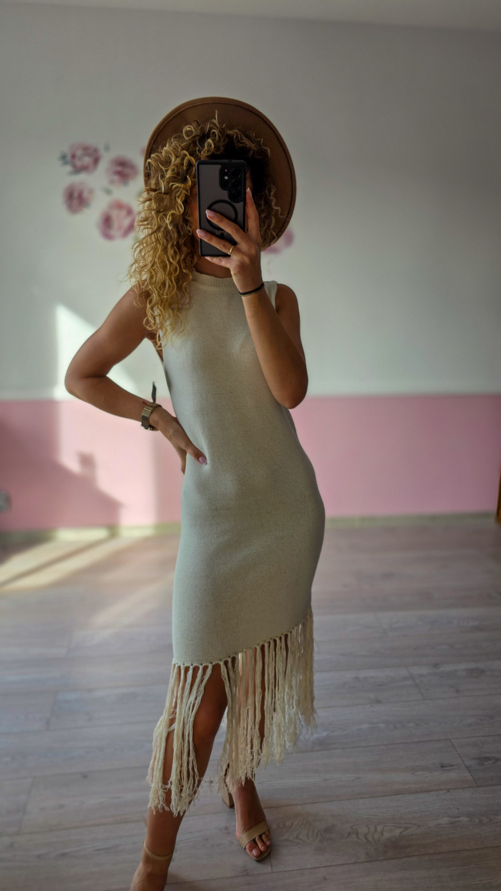 Beżowa sukienka dzianinowa z frędzlami S/M