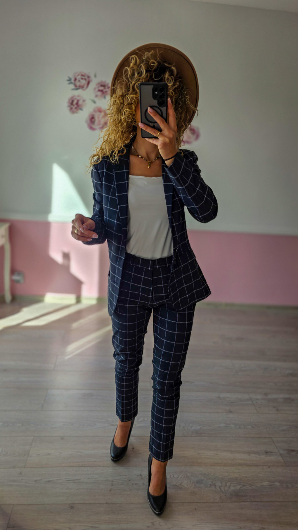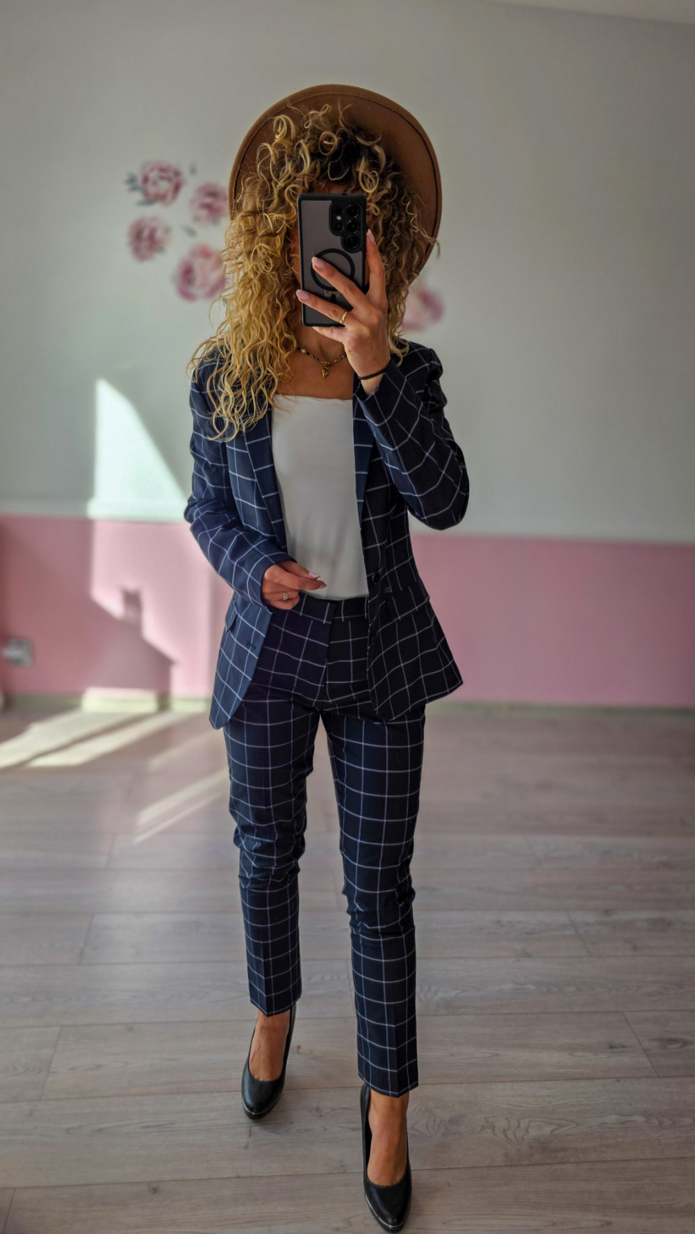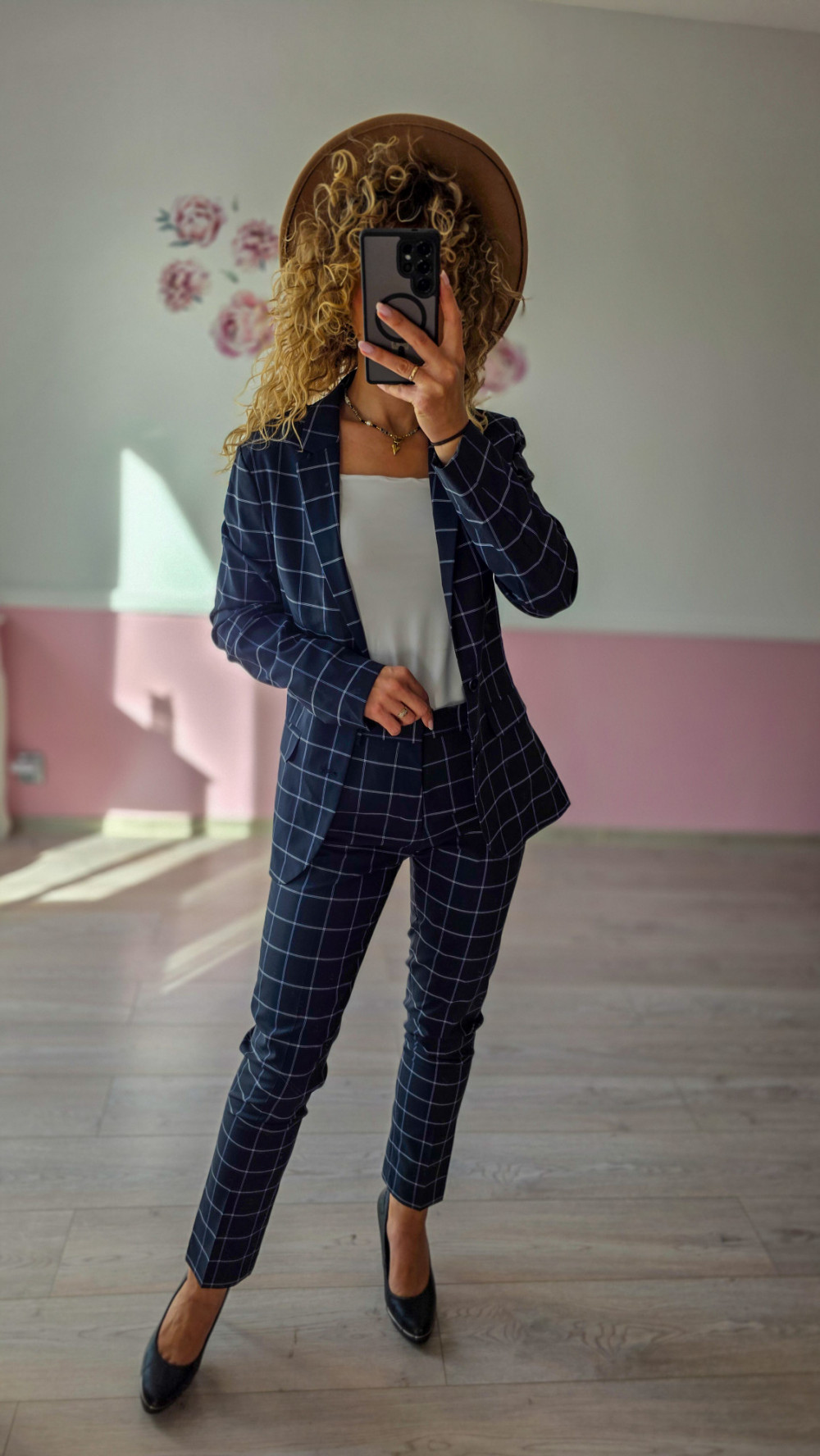 Nowoczesny i elegancki granatowy garnitur damski w kratę to propozycja dla kobiet, które lubią łączyć klasykę z modowym akcentem. Zestaw składa się z dopasowanej marynarki zapinanej na guzik oraz spodni typu cygaretki, które podkreślają sylwetkę i wysmuklają nogi.
