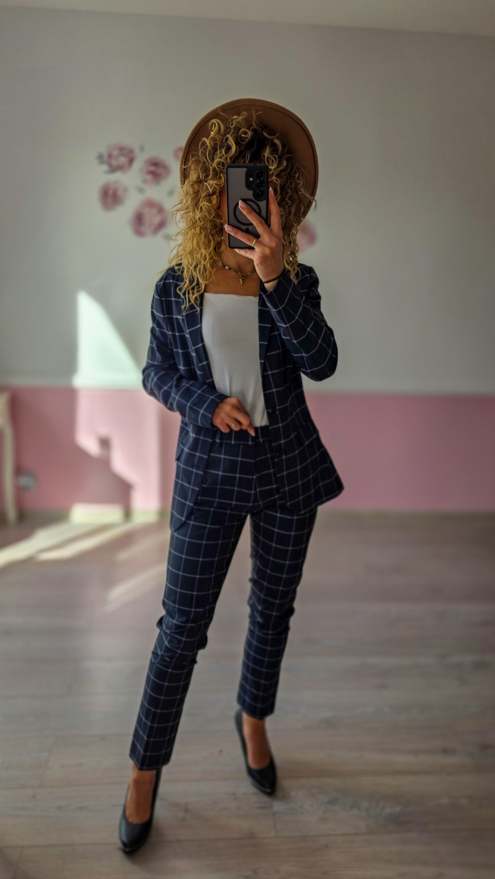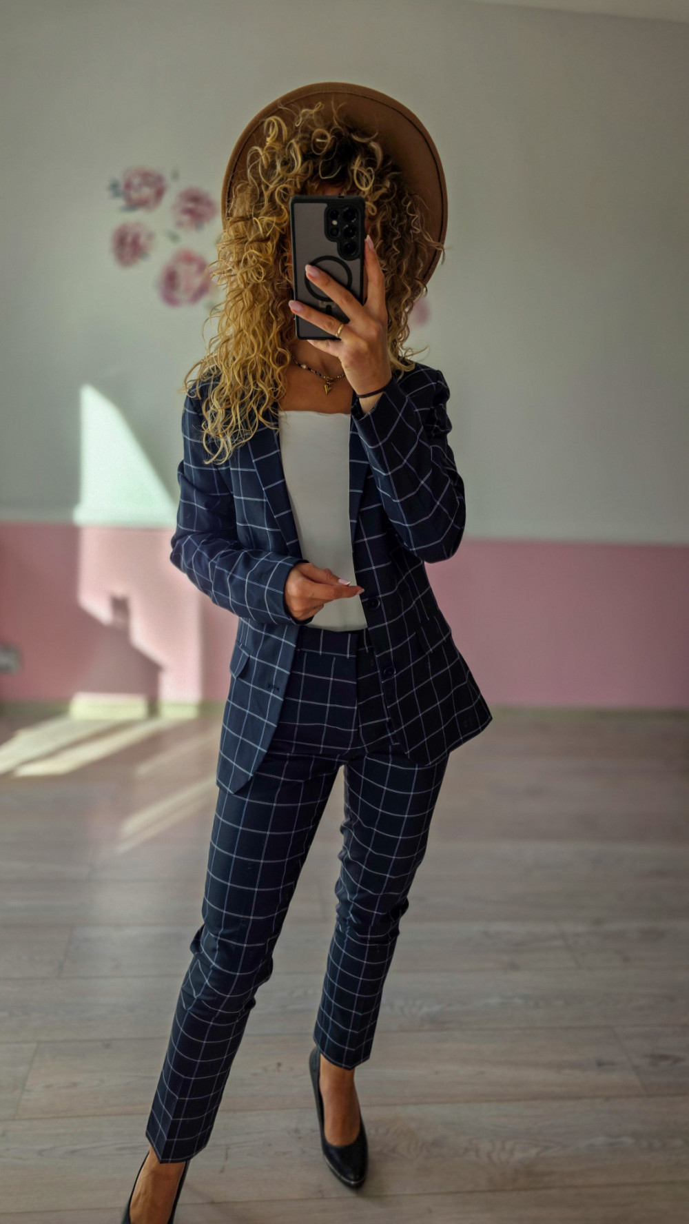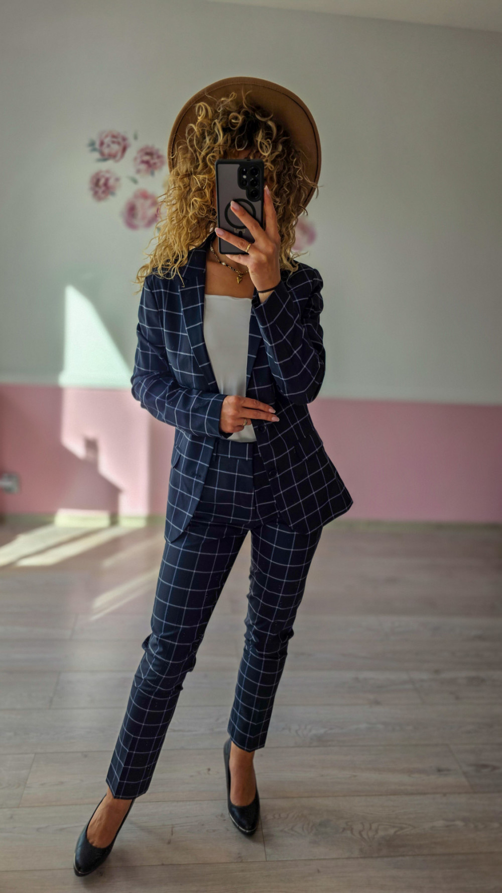 Nowoczesny i elegancki granatowy garnitur damski w kratę to propozycja dla kobiet, które lubią łączyć klasykę z modowym akcentem. Zestaw składa się z dopasowanej marynarki zapinanej na guzik oraz spodni typu cygaretki, które podkreślają sylwetkę i wysmuklają nogi.
