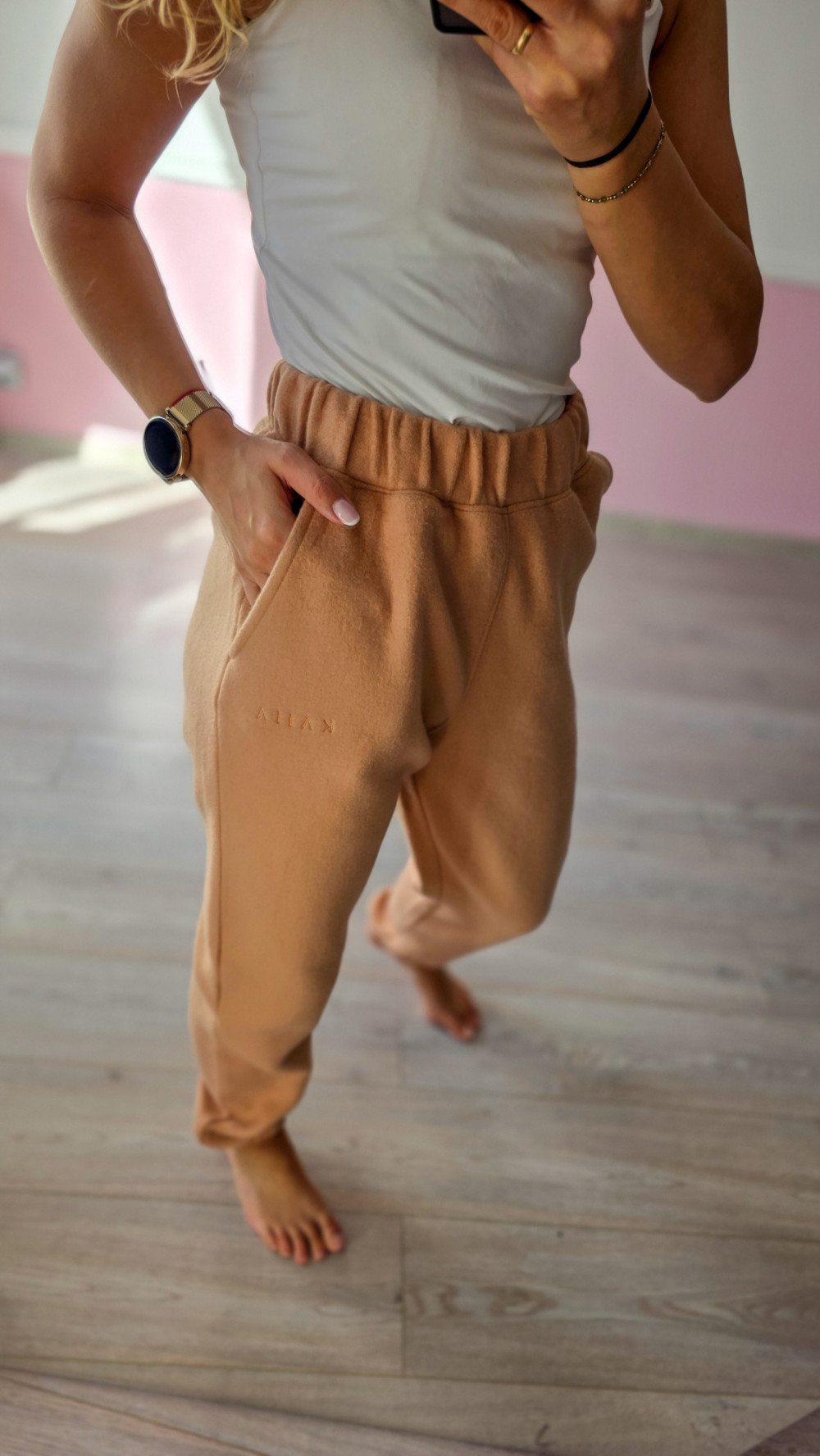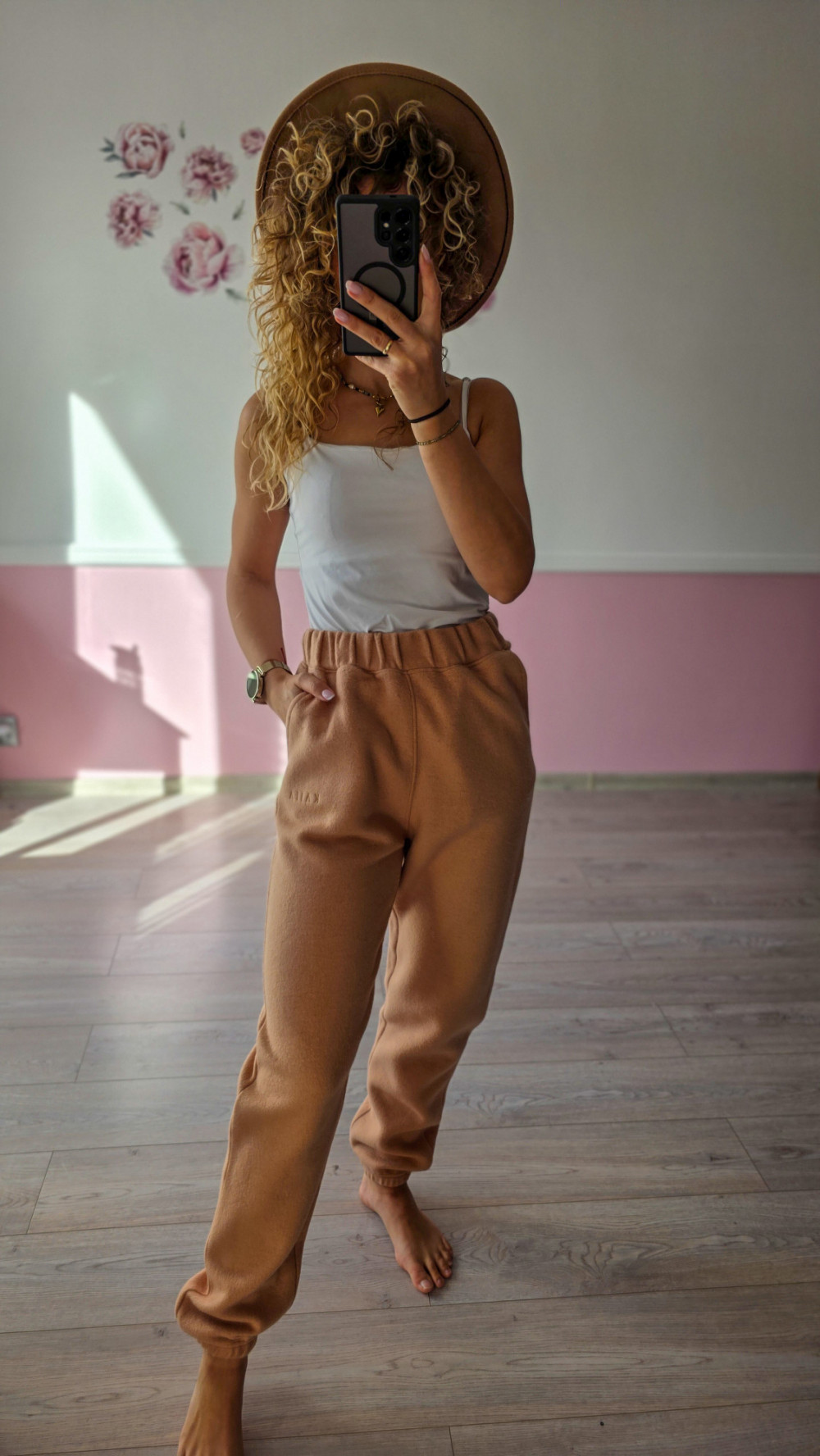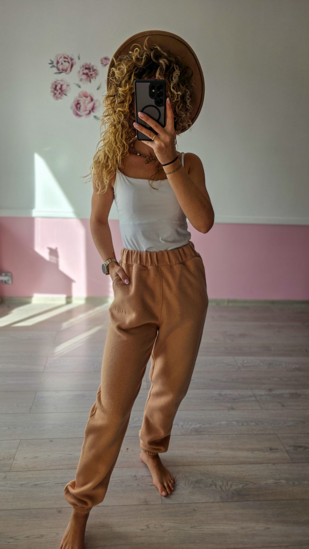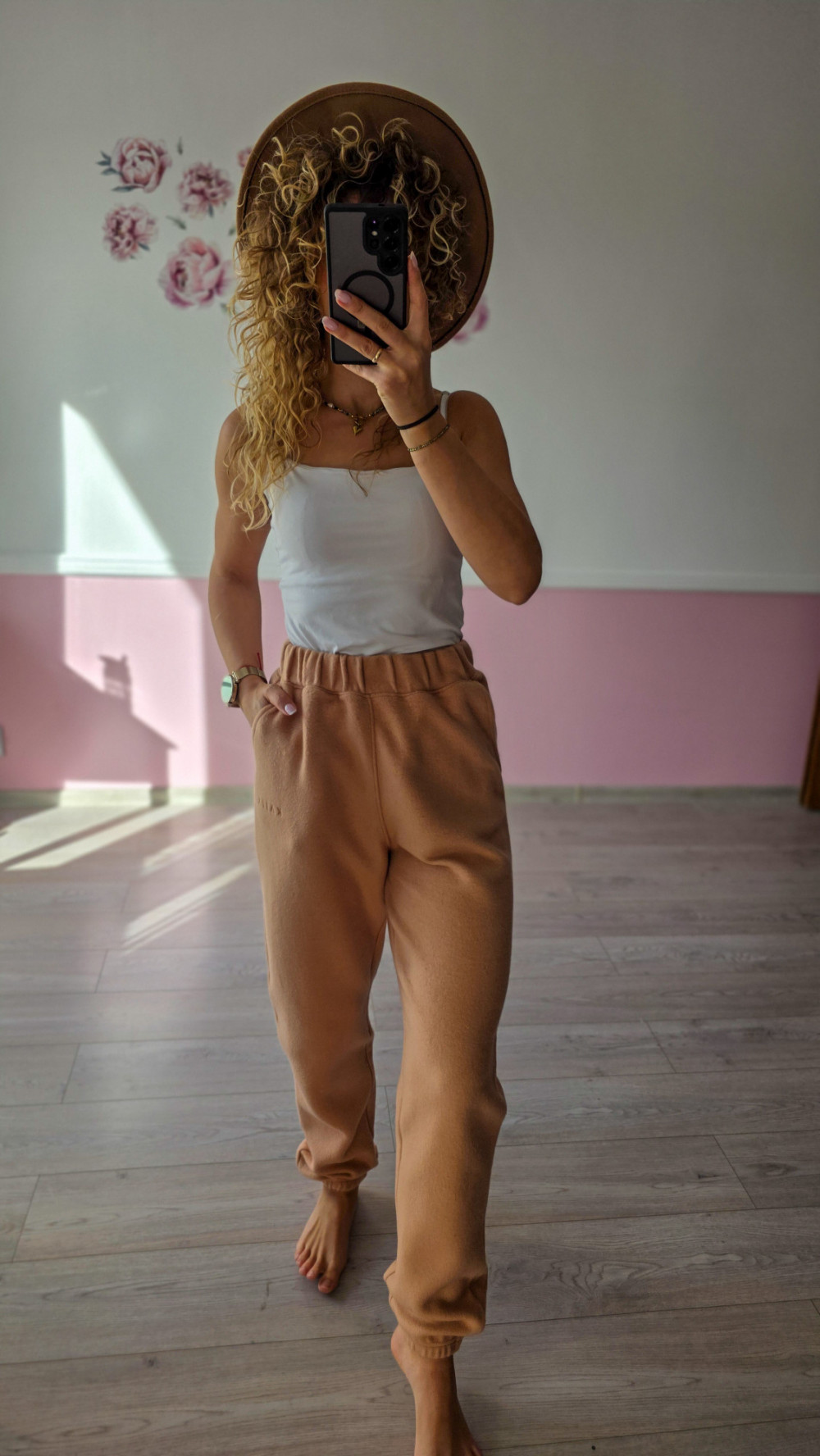 Model posiada elastyczny pas i ściągacze u dołu, dzięki czemu doskonale układa się na sylwetce. Stonowany odcień karmelu sprawia, że spodnie pasują do wielu stylizacji – zarówno domowych, jak i na spacer czy spotkanie ze znajomymi.