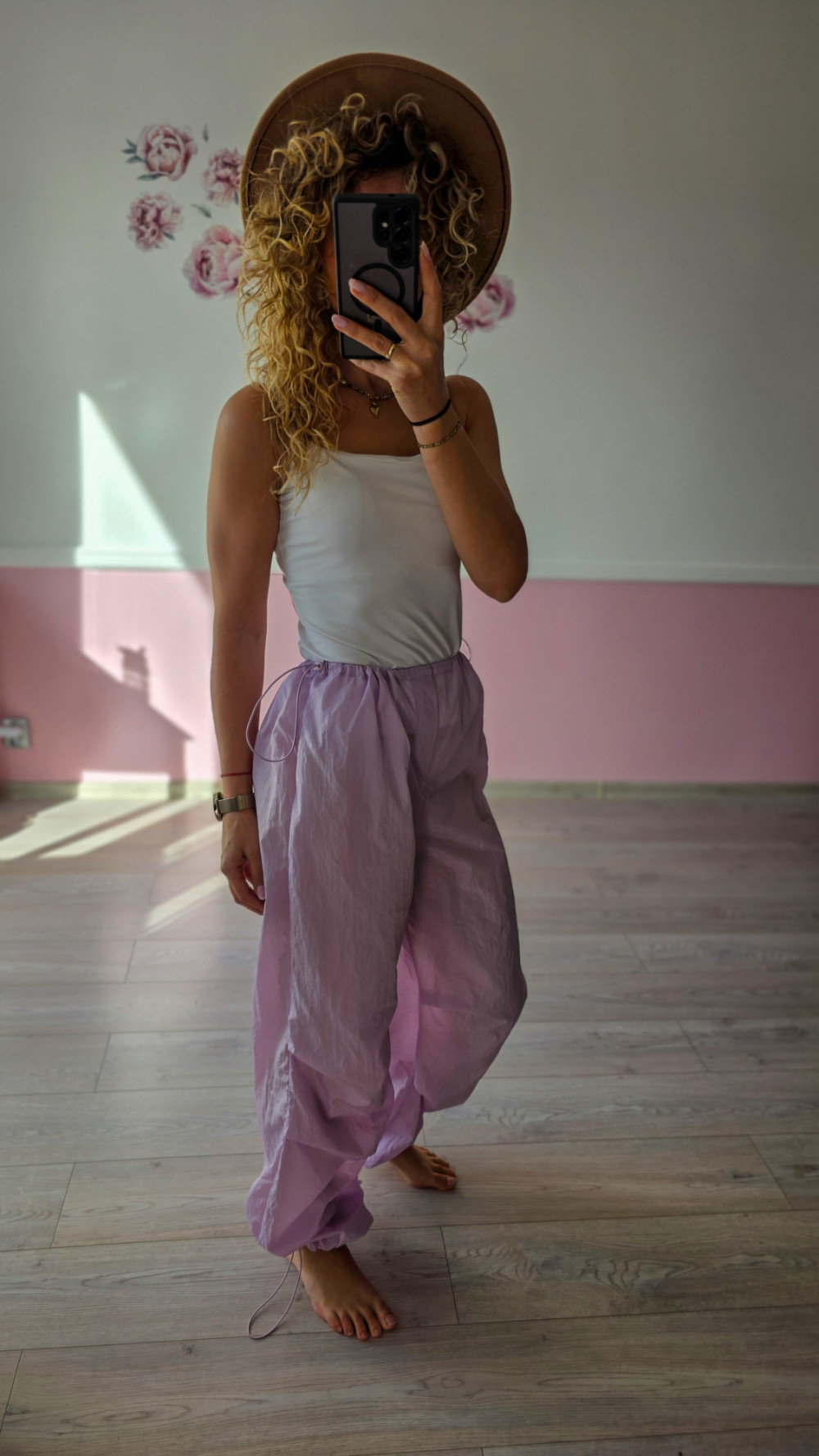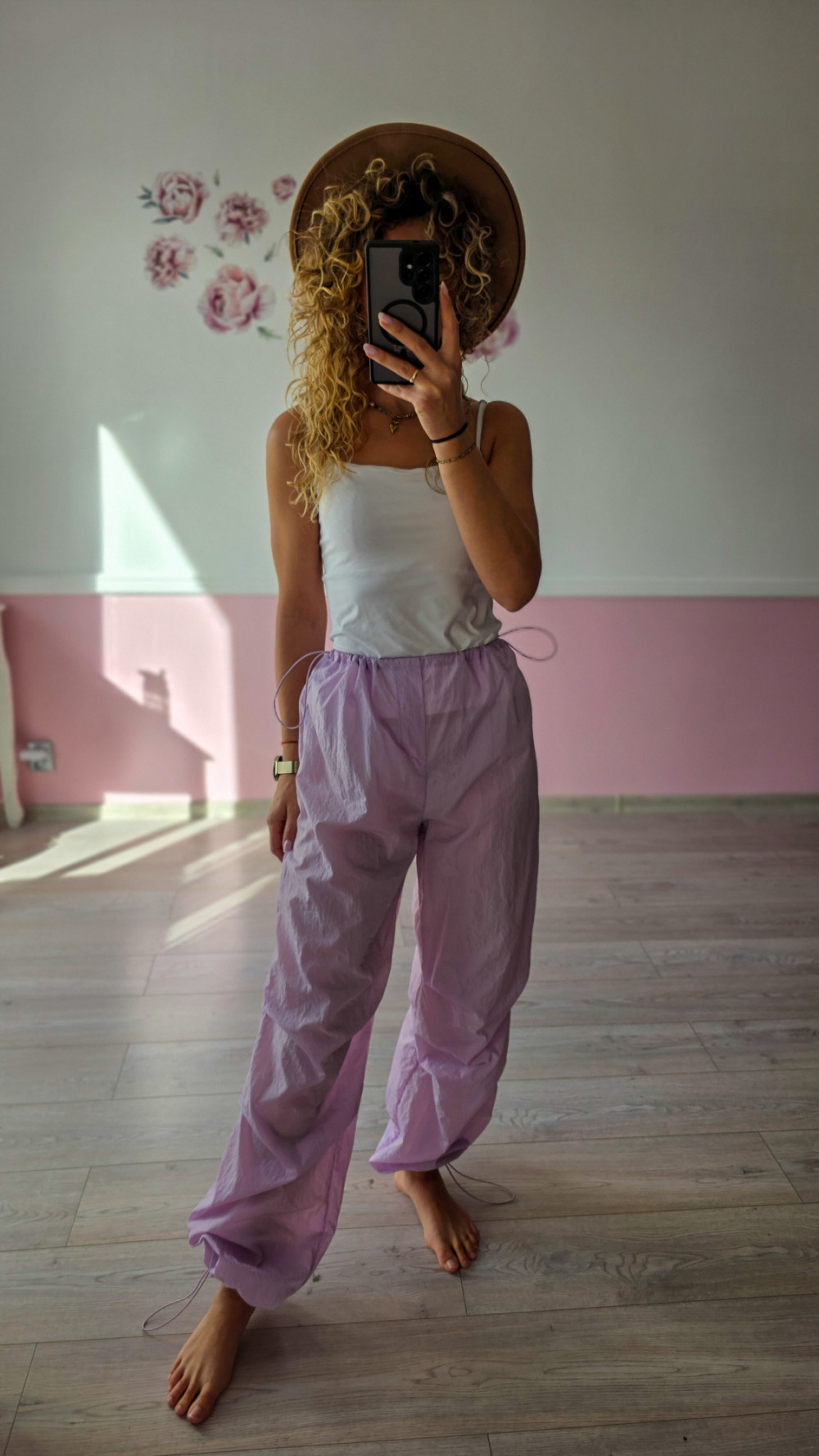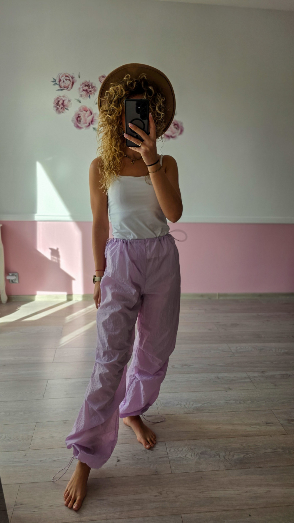 Modne i ultrawygodne liliowe spodnie typu parachute to propozycja dla fanek luźnego, streetwearowego stylu. Uszyte z lekkiego materiału, posiadają regulację w pasie i u dołu nogawek, co pozwala dopasować fason do własnych preferencji.