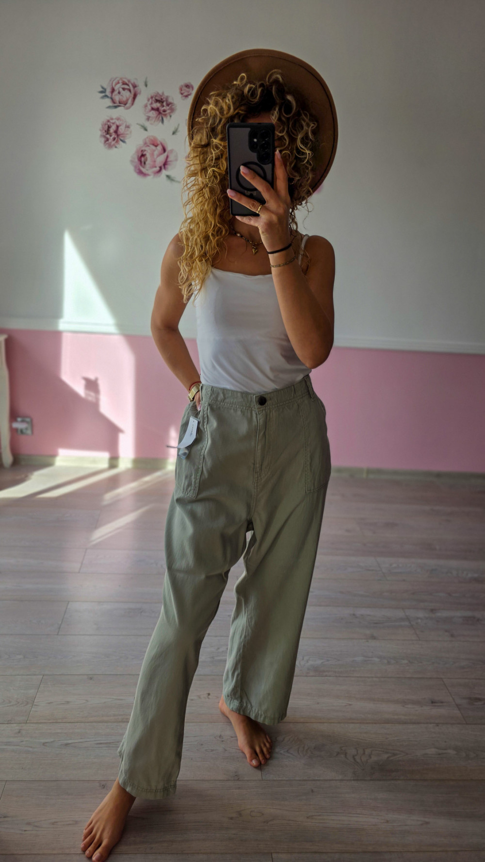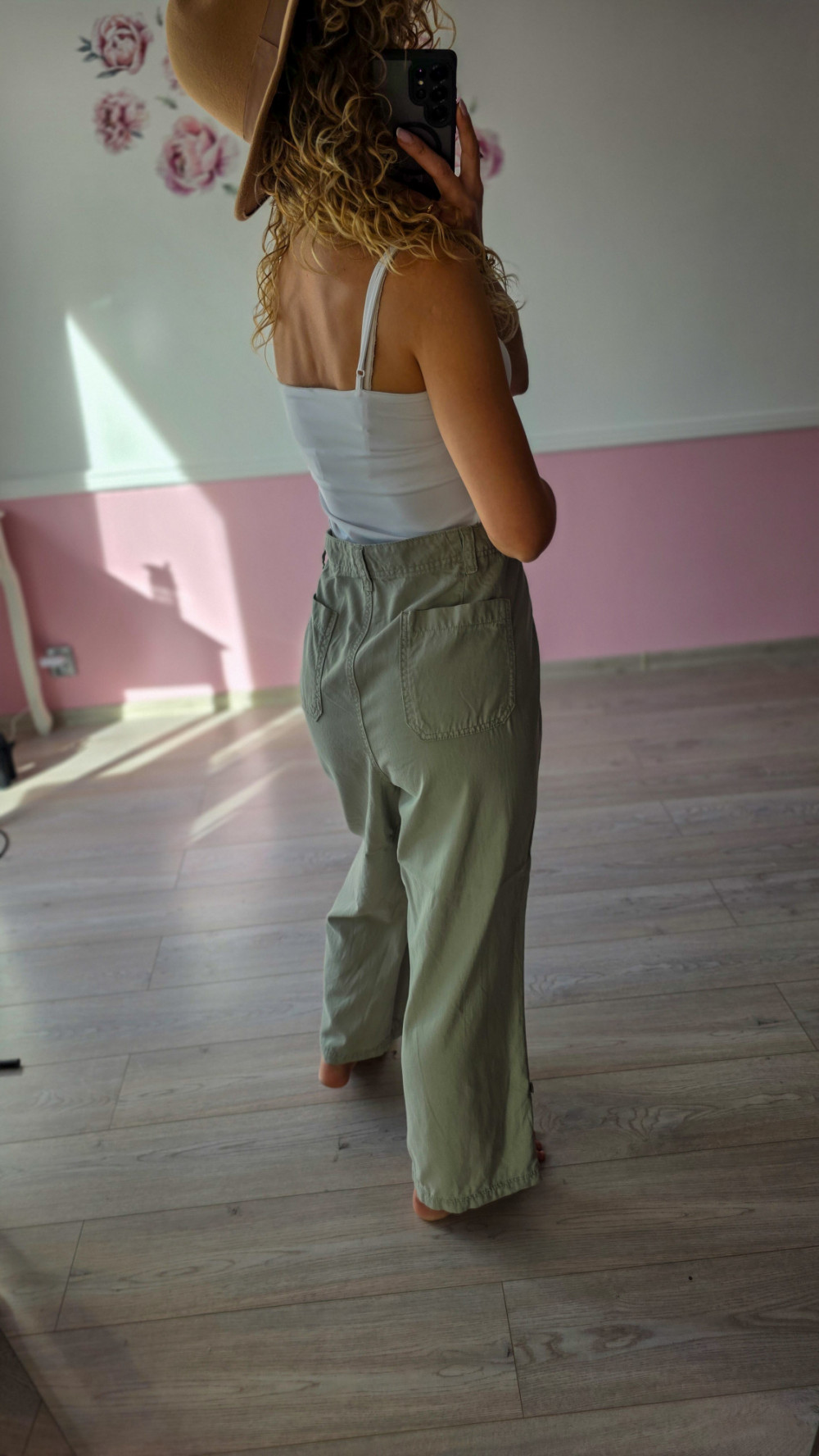 Zielone spodnie z szeroką nogawką – casualowa elegancja