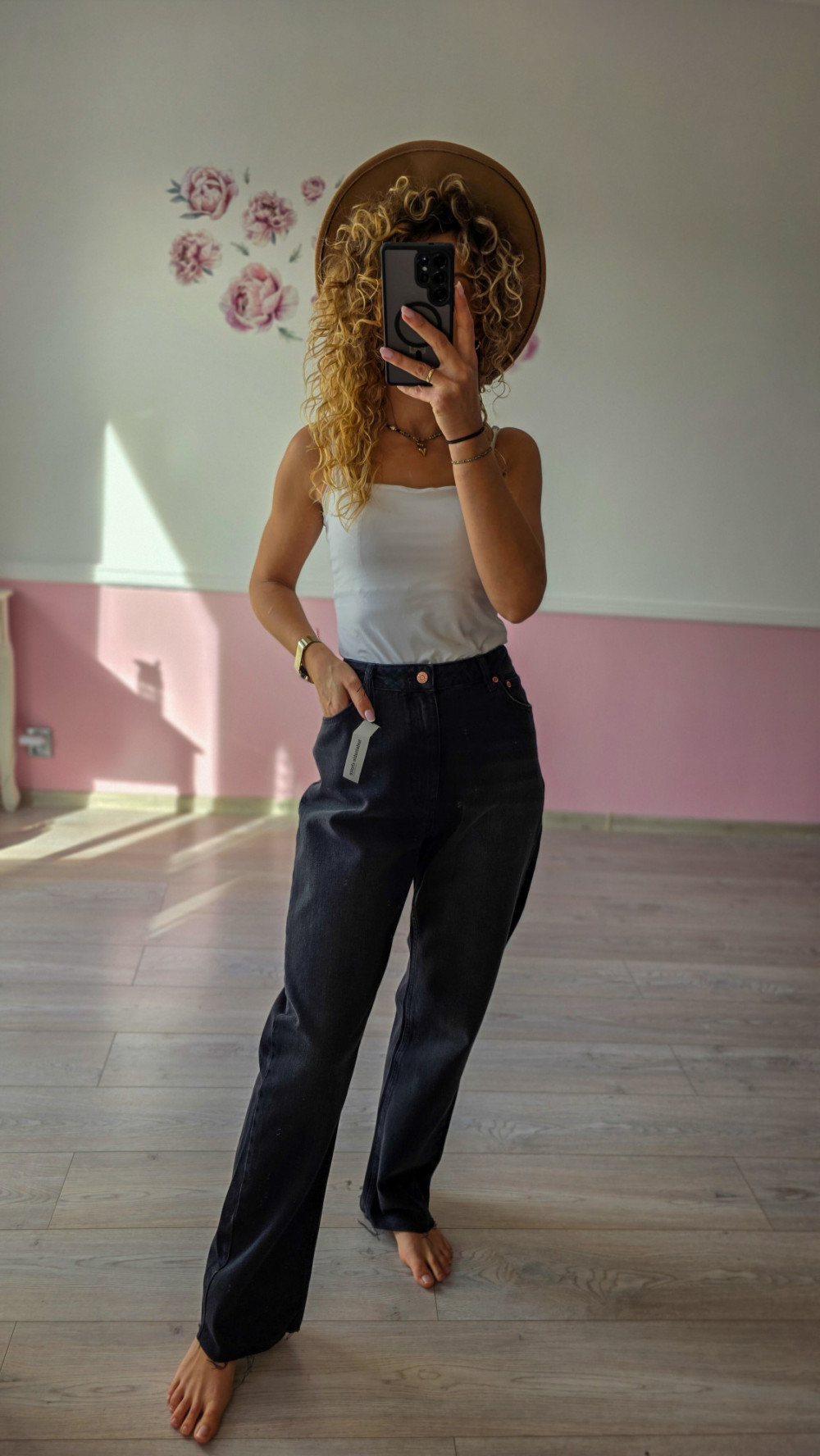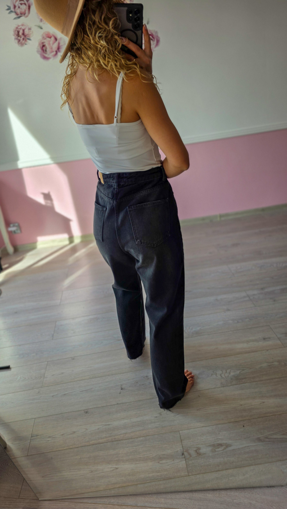 Ponadczasowe czarne jeansy straight to absolutny must-have w każdej garderobie. Wykonane z miękkiego, elastycznego denimu, zapewniają wygodę i idealne dopasowanie do sylwetki. Prosty krój wysmukla nogi i sprawia, że spodnie pasują do wszystkiego.