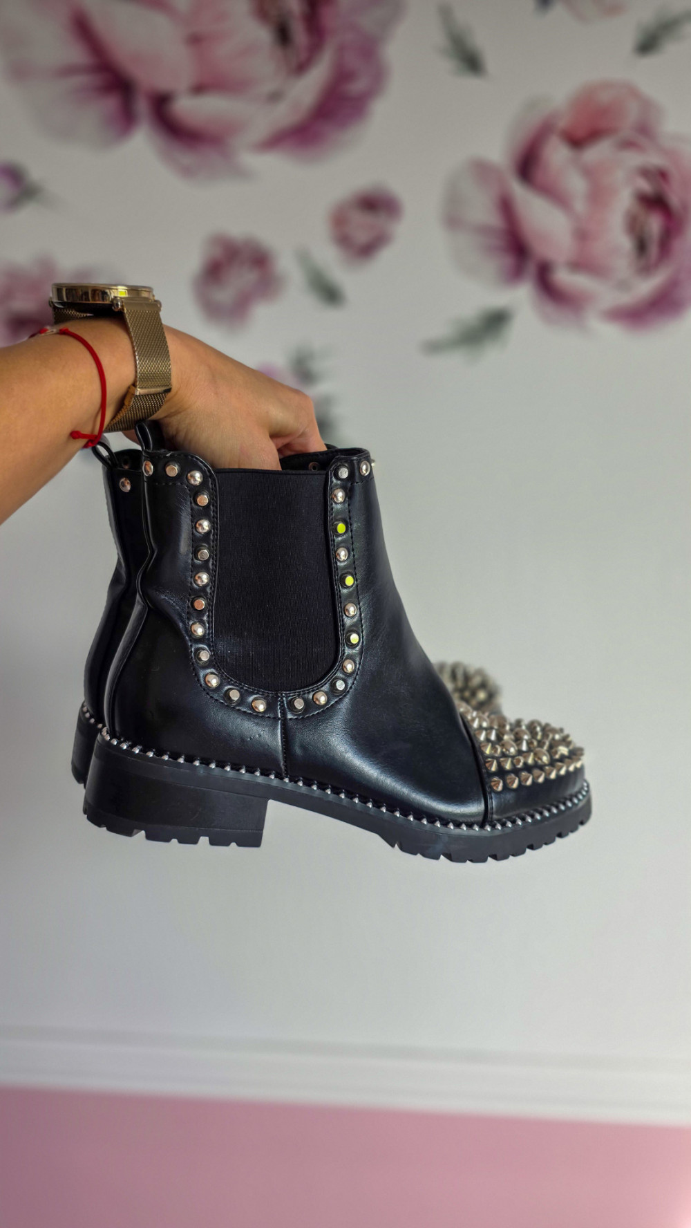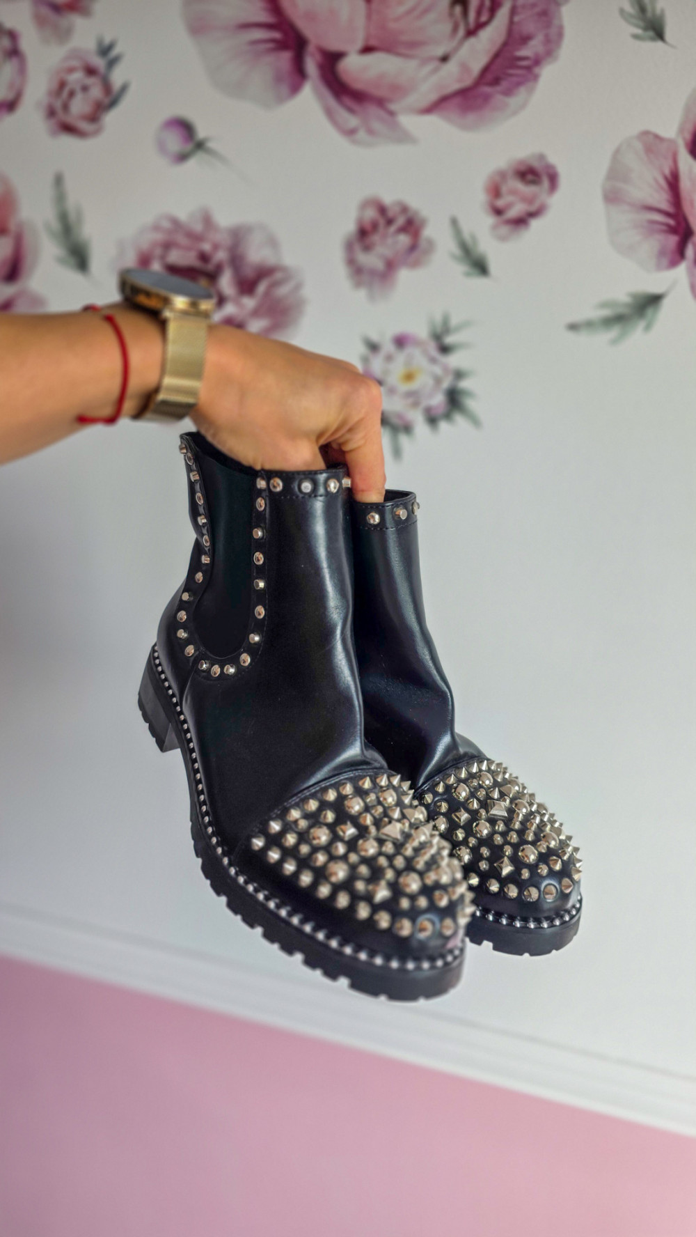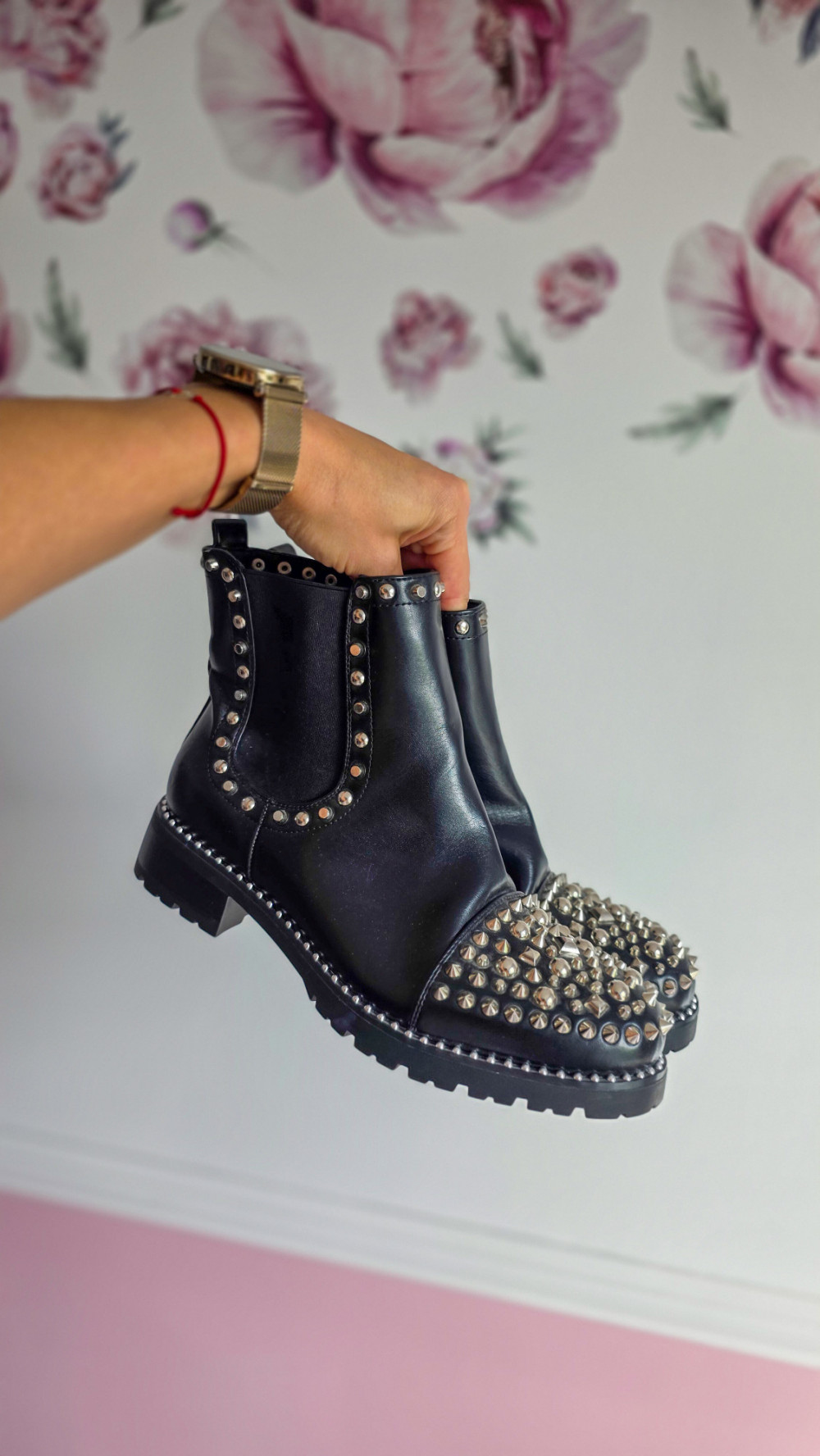 Czarne botki z ćwiekami to model, który doda każdej stylizacji pazura. Wykonane z wysokiej jakości skóry ekologicznej, z ozdobnymi nitami i grubą podeszwą, łączą styl i wygodę w najlepszym wydaniu.