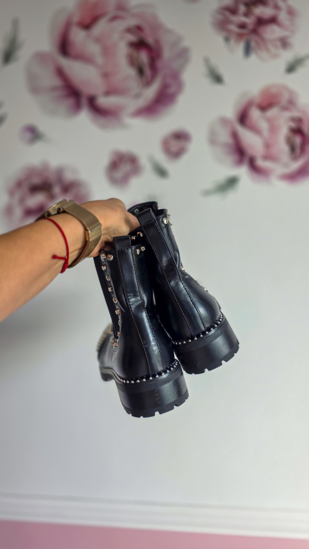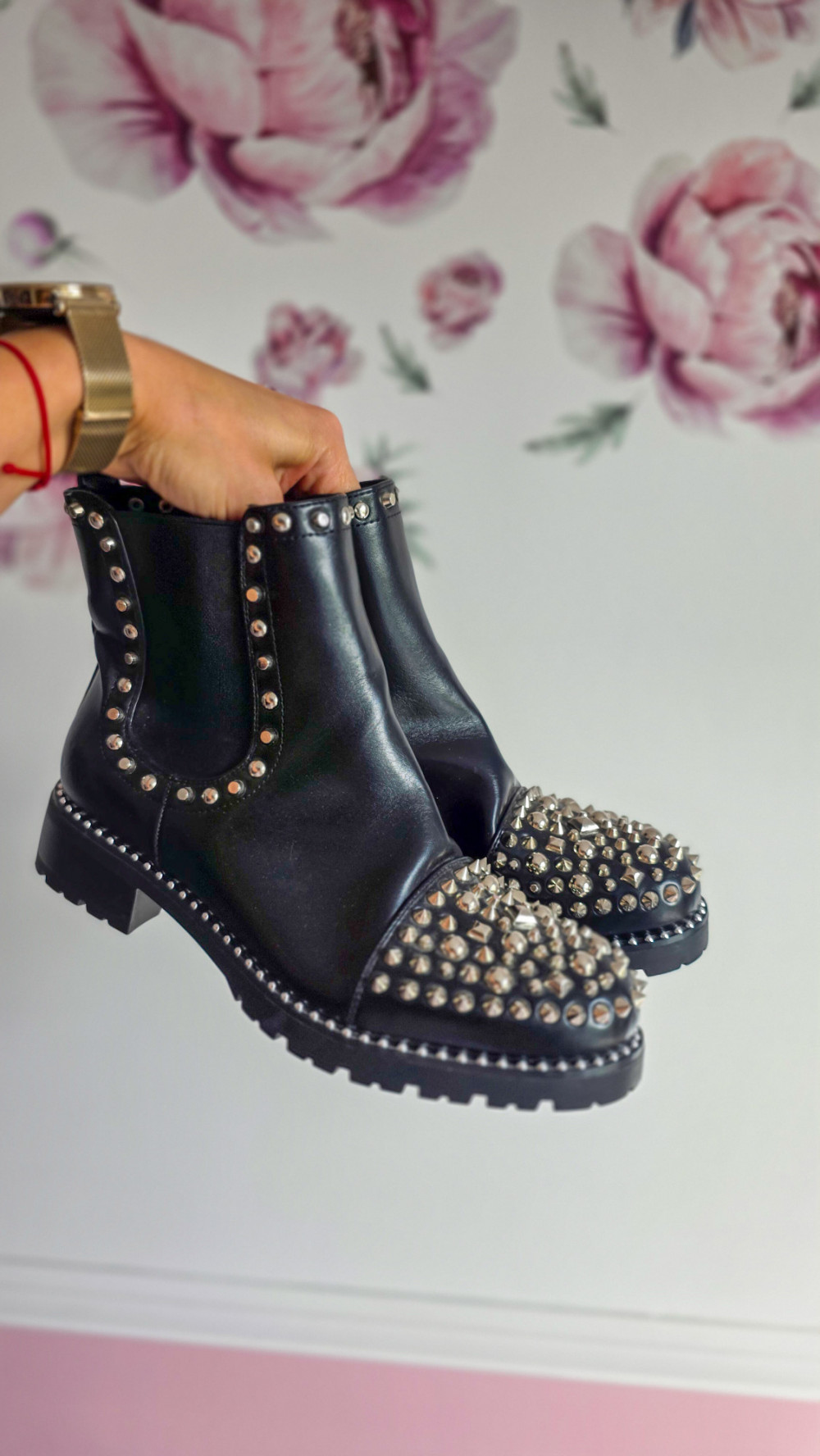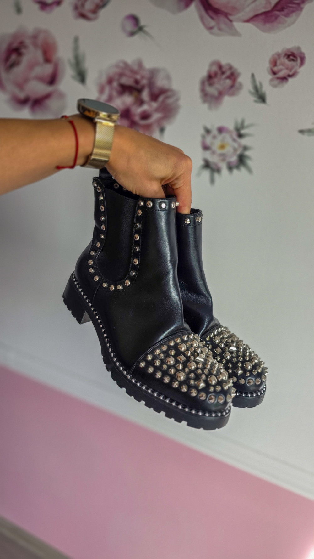 Czarne botki z ćwiekami to model, który doda każdej stylizacji pazura. Wykonane z wysokiej jakości skóry ekologicznej, z ozdobnymi nitami i grubą podeszwą, łączą styl i wygodę w najlepszym wydaniu.