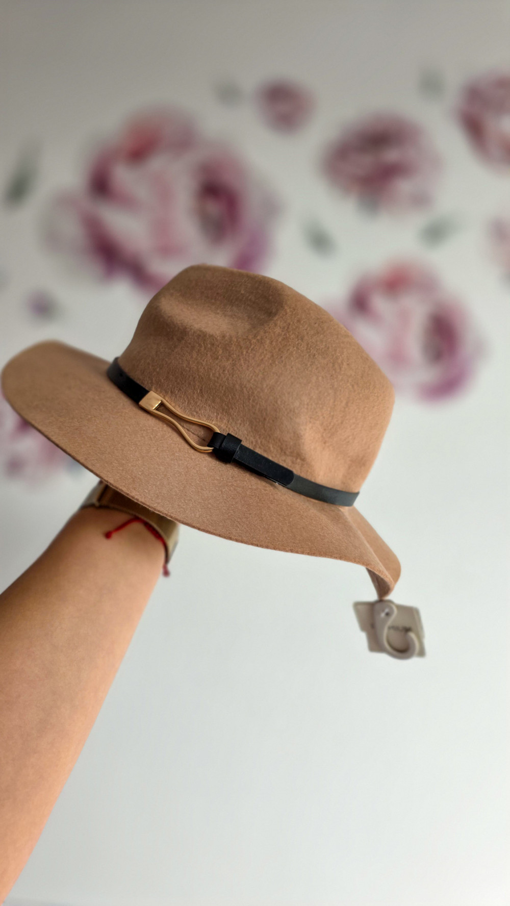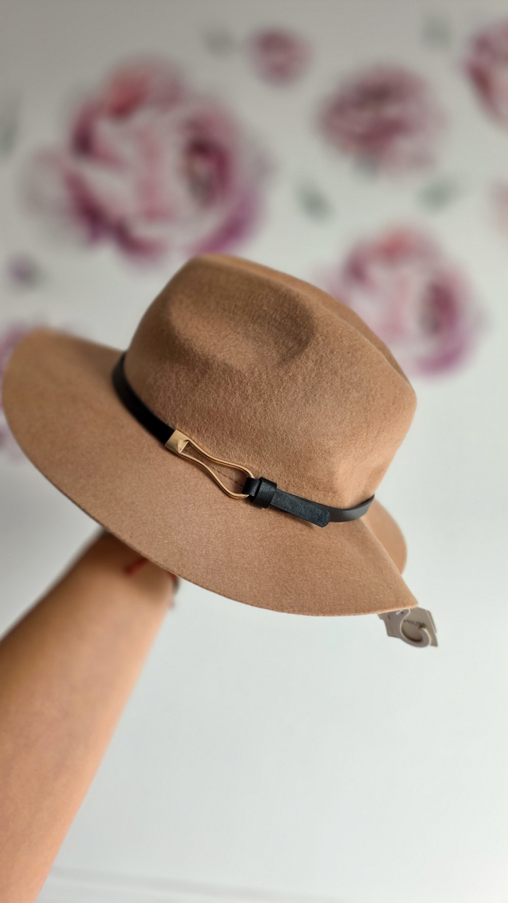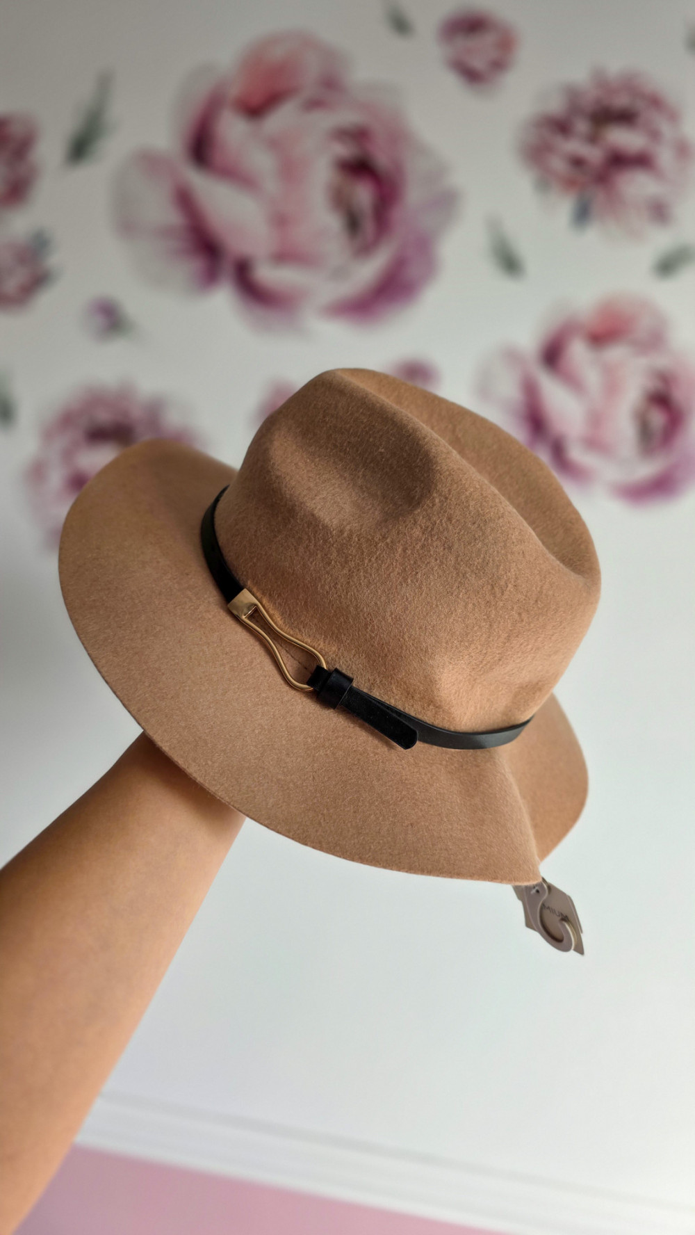Stylowy kapelusz camelowy to obowiązkowy element jesiennej garderoby. Wykonany z miękkiego filcu, zdobiony czarnym paskiem z elegancką klamrą, dodaje charakteru każdej stylizacji.