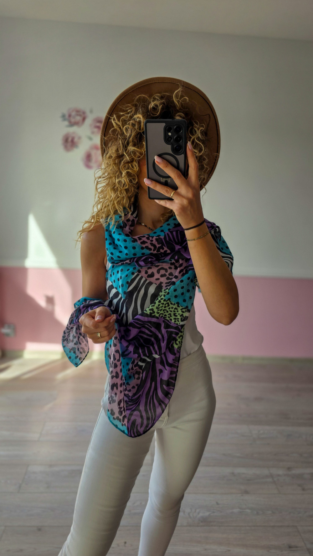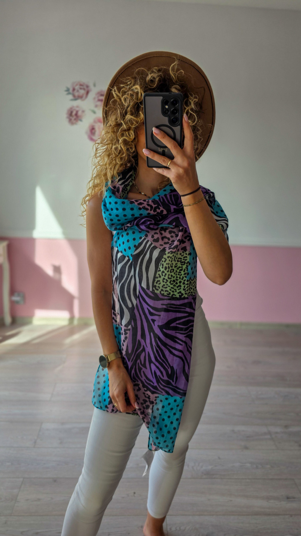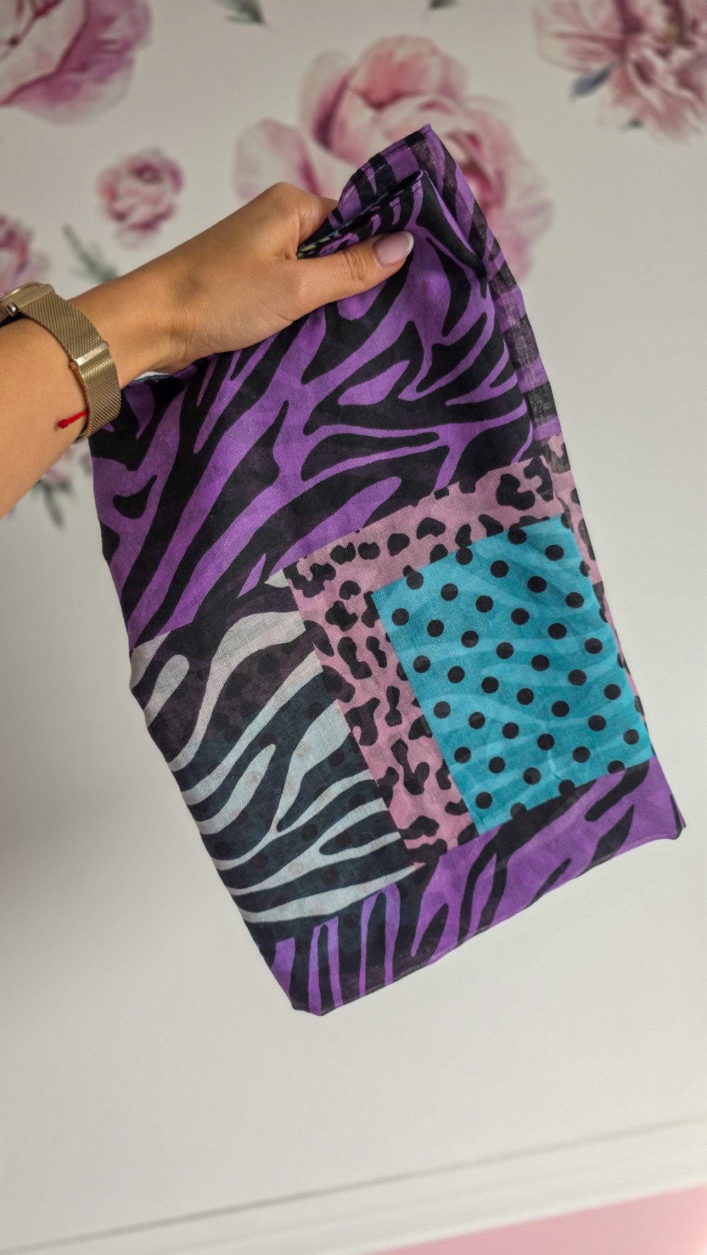 Zachwyć się kolorem i energią z naszym kolorowym szalem we wzory animal print! Połączenie motywów panterki, zebry i groszków w intensywnych barwach turkusu, fioletu i zieleni to propozycja dla kobiet, które kochają wyróżniać się z tłumu.
