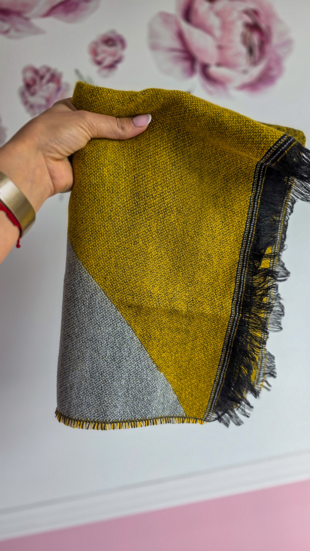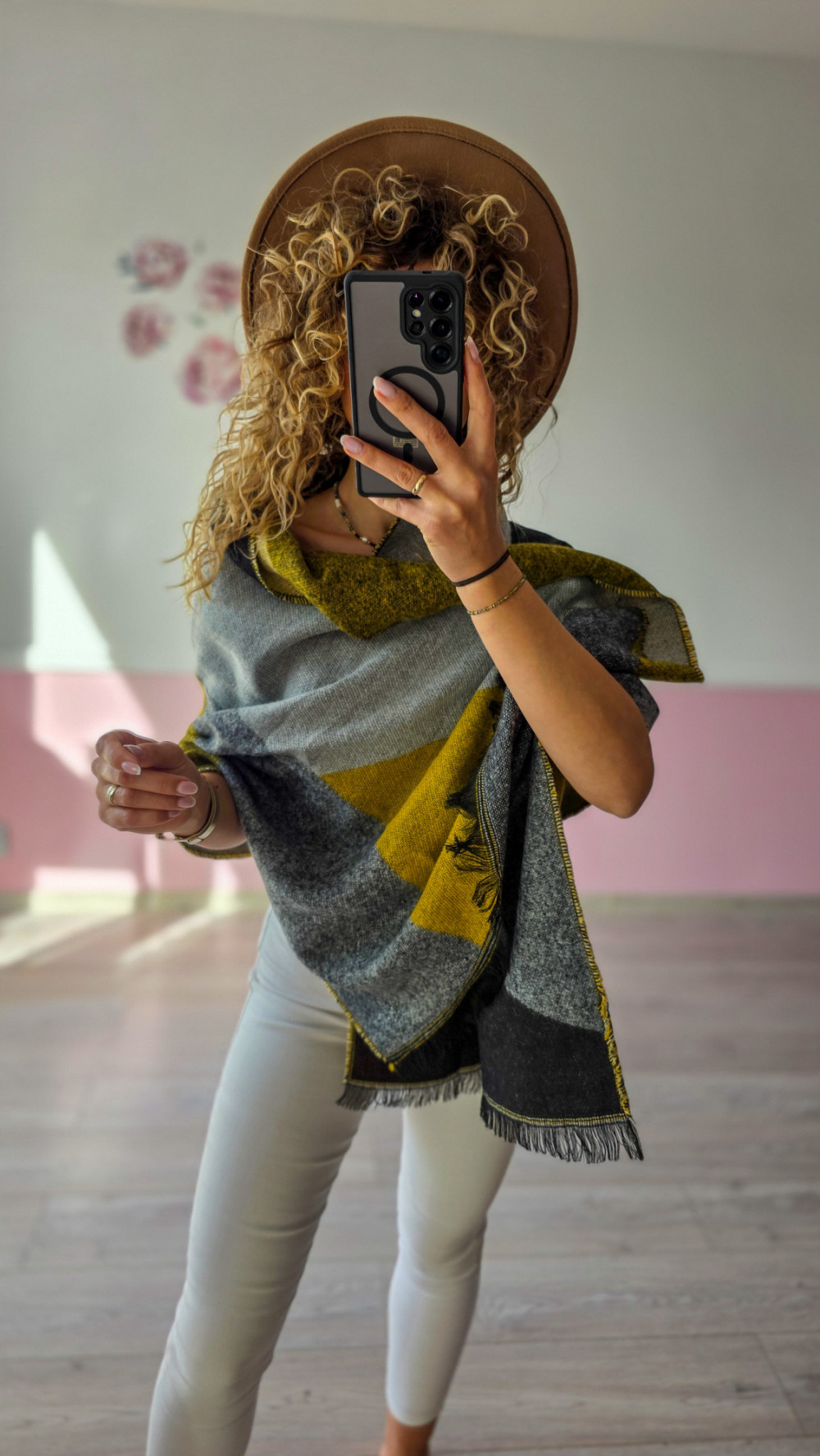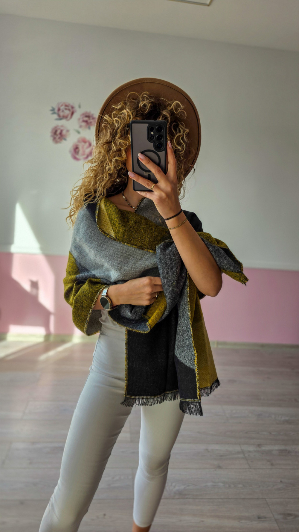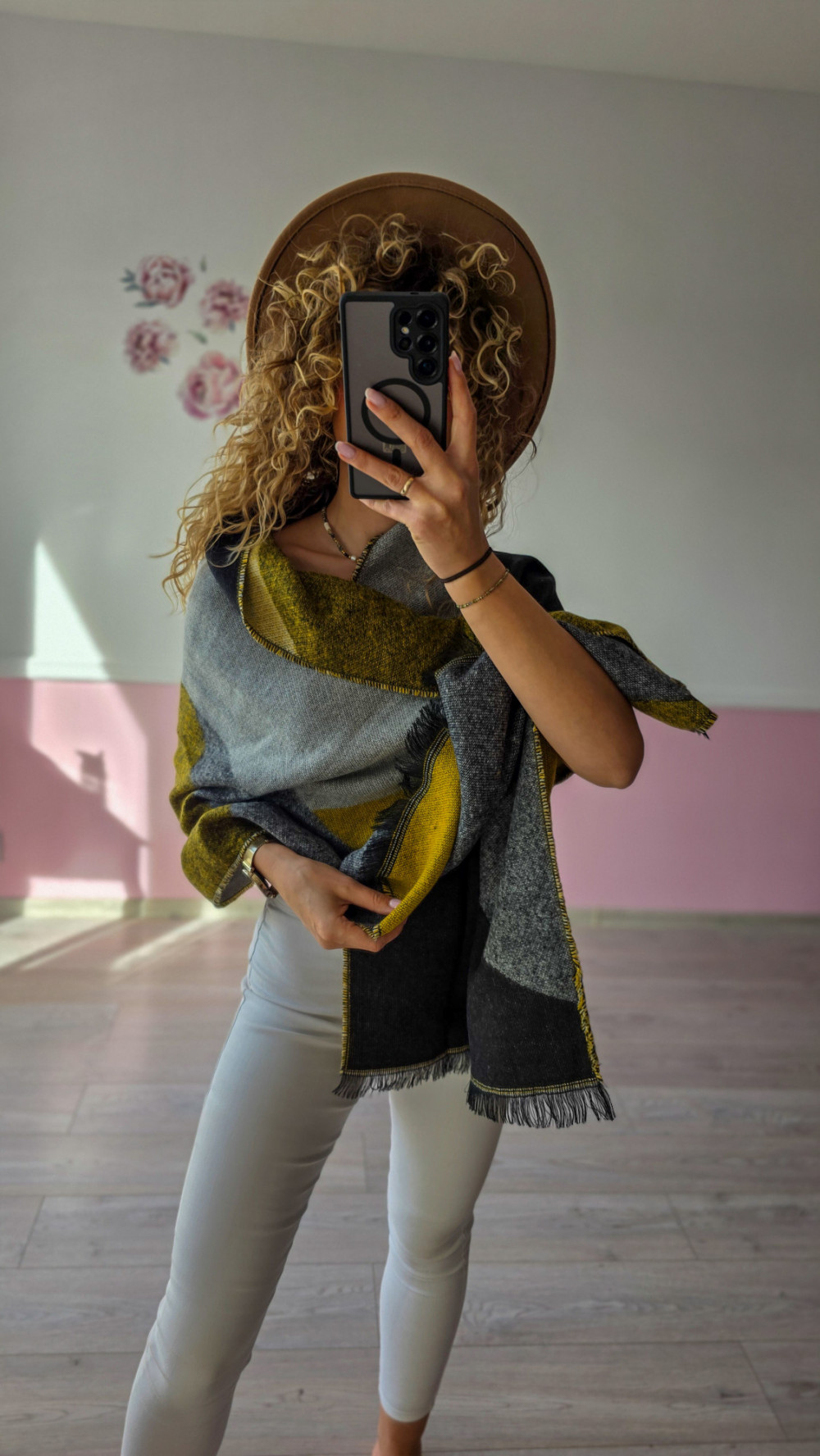 Ciepły szal w kolorach szaro-żółtych – elegancja w codziennym wydaniu
