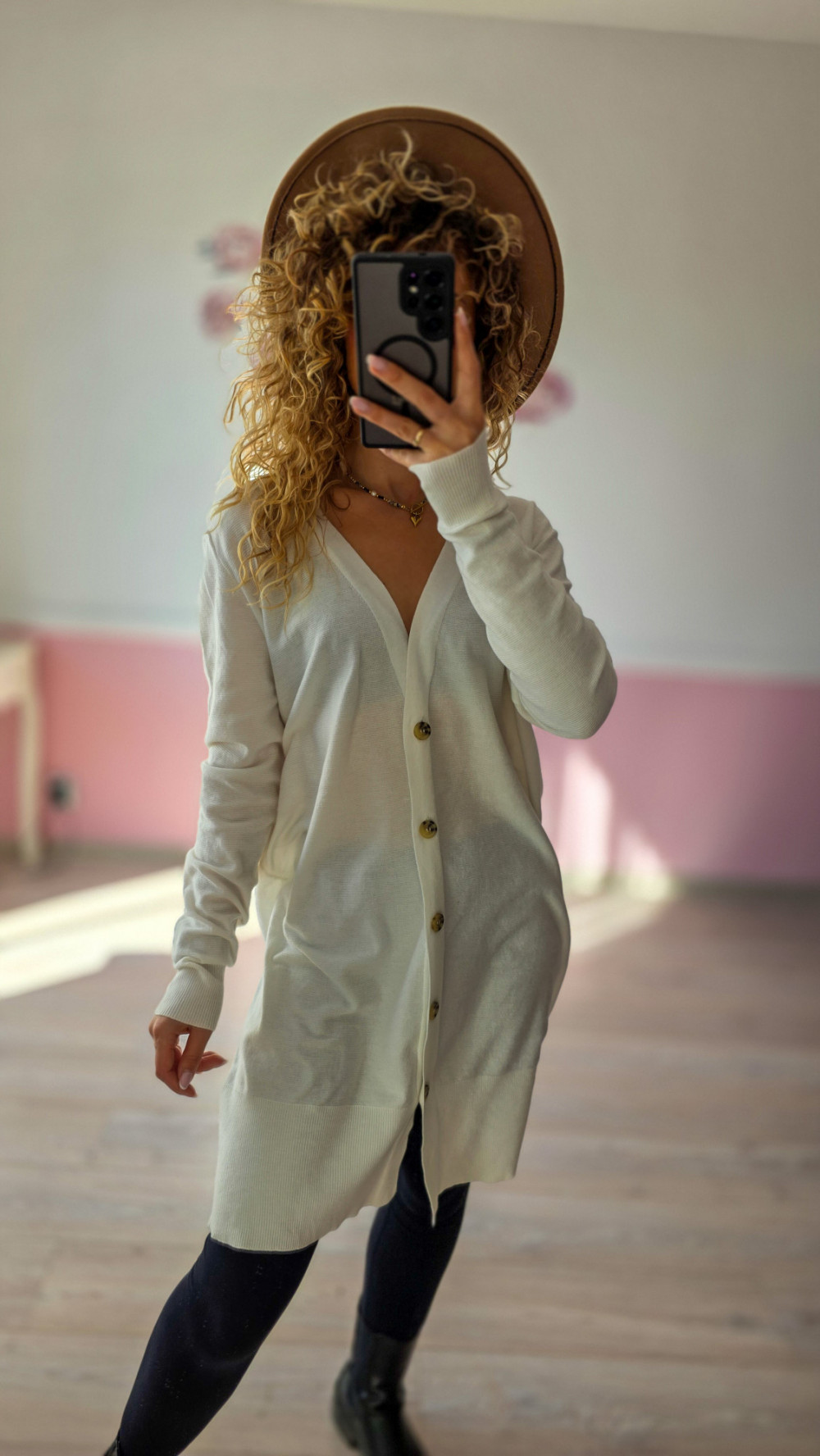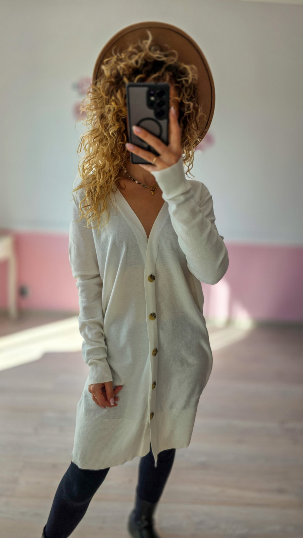 Długi biały kardigan z guzikami to ponadczasowy element garderoby, który pasuje do wszystkiego. Lekki, miękki materiał sprawia, że nosi się go z przyjemnością. Idealny na co dzień, do biura czy spaceru. Możesz nosić go rozpiętego lub zapiętego – świetnie wygląda z jeansami i t-shirtem. Stylowa baza każdej stylizacji.