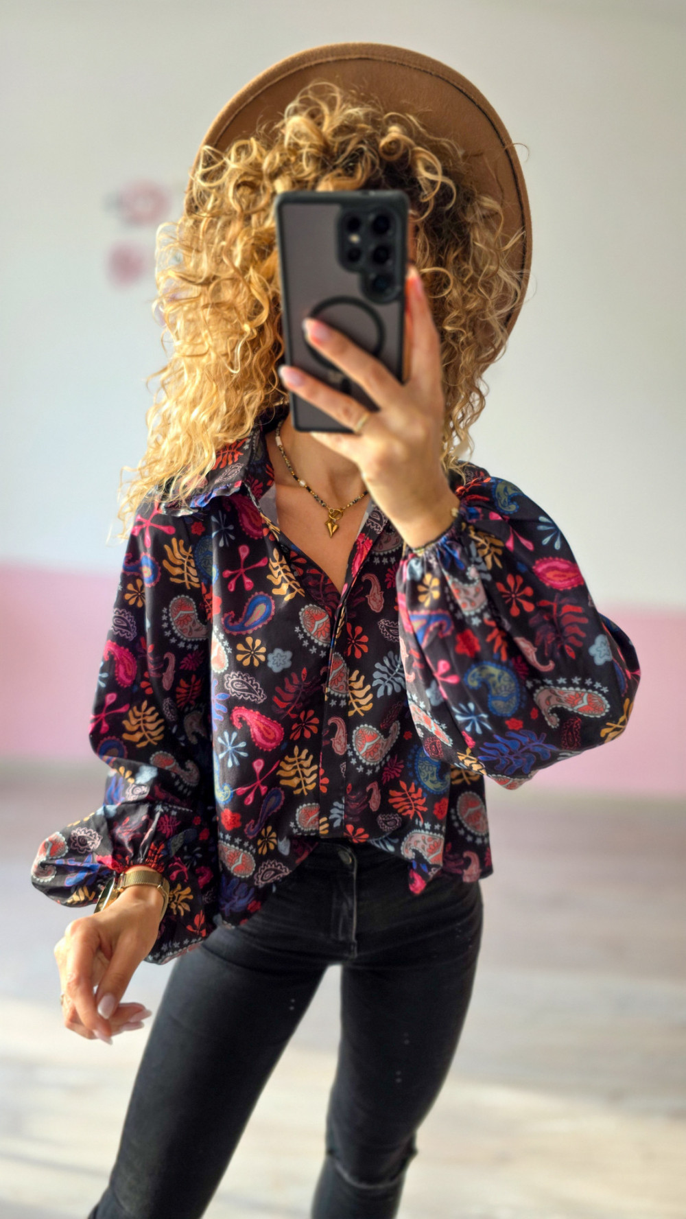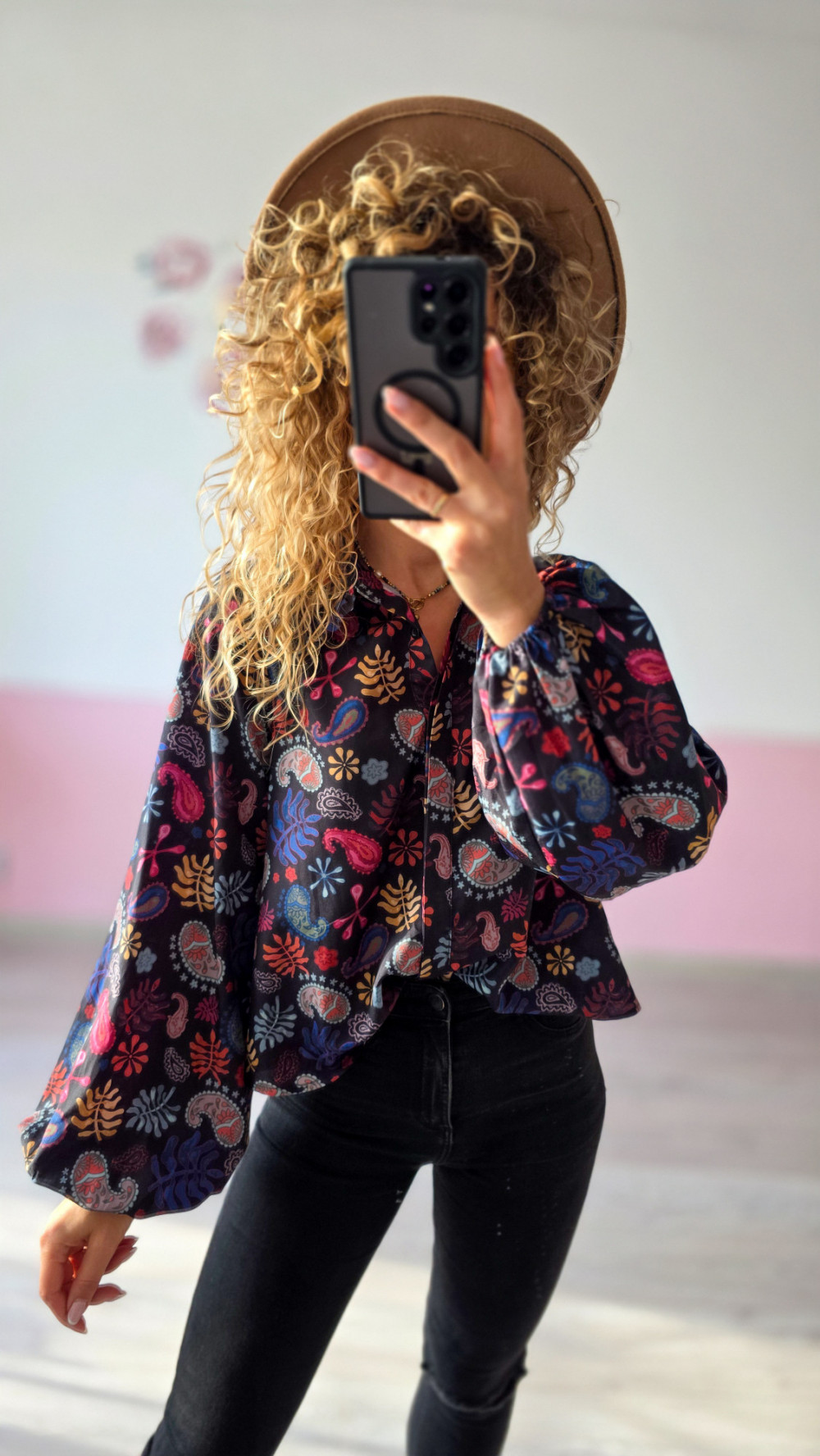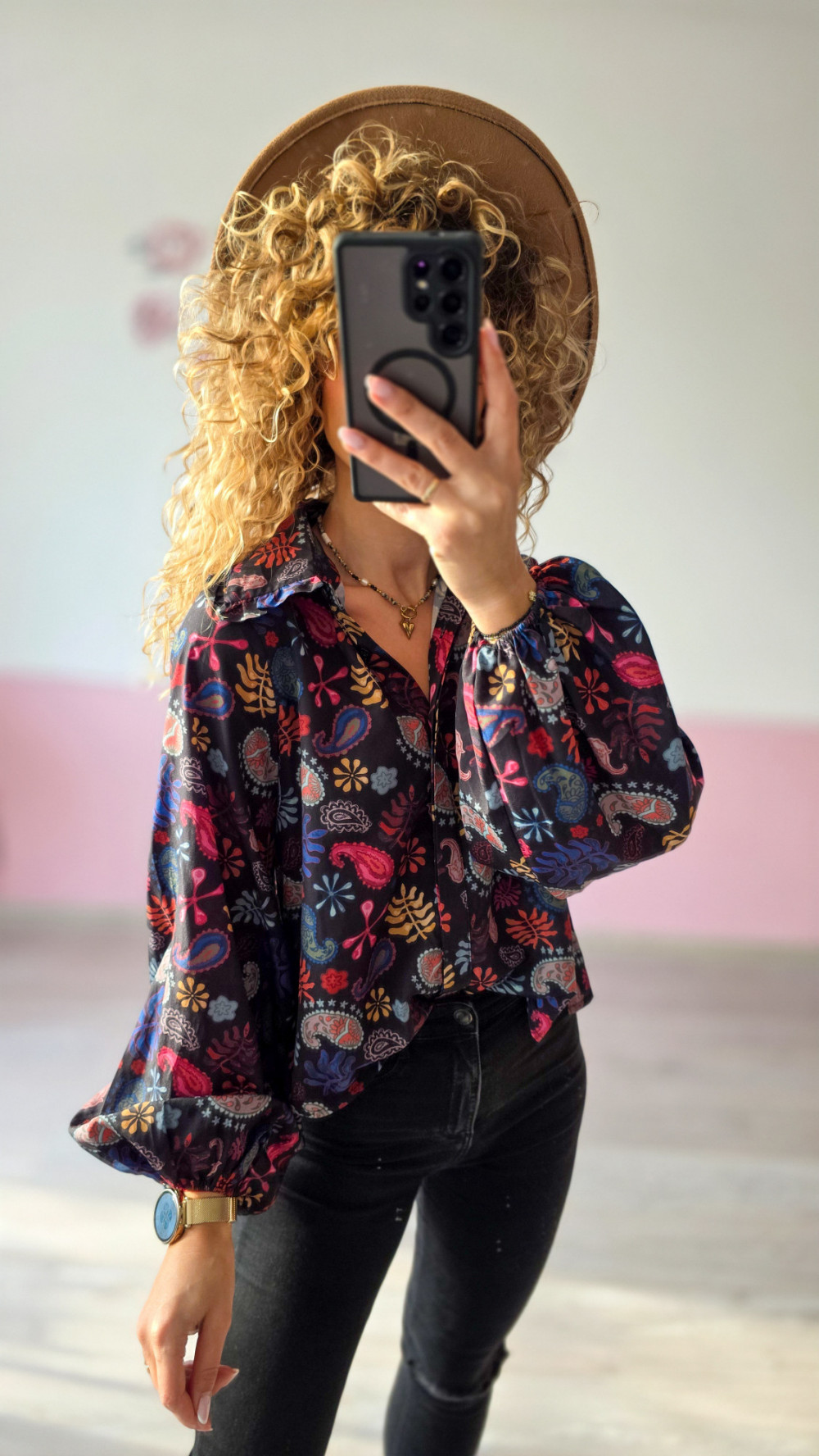 Wyrazista bluzka w etniczne wzory to idealny wybór dla fanek stylu boho. Kolorowy print, luźny krój i bufiaste rękawy nadają jej lekkości i artystycznego charakteru. Pasuje zarówno do jeansów, jak i spódnicy. Świetna na co dzień lub na wyjątkowe okazje. Oryginalny fason podkreśla indywidualność i kreatywność. Bluzka pochodzi z kolekcji Domowego Lumpeksu, gdzie każda sztuka ma swoją historię.