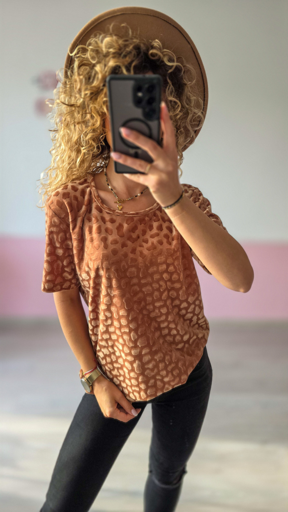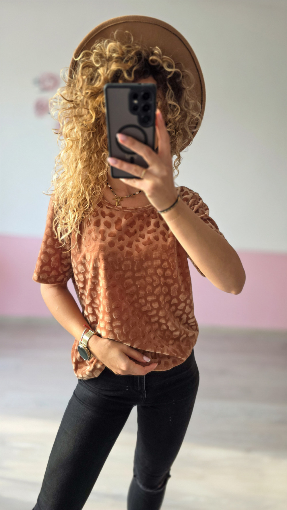 Brązowa bluzka z delikatnym tłoczeniem to idealny wybór dla kobiet, które lubią wyróżniać się subtelnym blaskiem. Miękki, welurowy materiał pięknie odbija światło, a prosty krój nadaje jej uniwersalności. Świetna zarówno na co dzień, jak i na wieczorne wyjście. To perełka z kolekcji Domowego Lumpeksu – wyjątkowe ubrania z drugiej ręki w stylu premium.