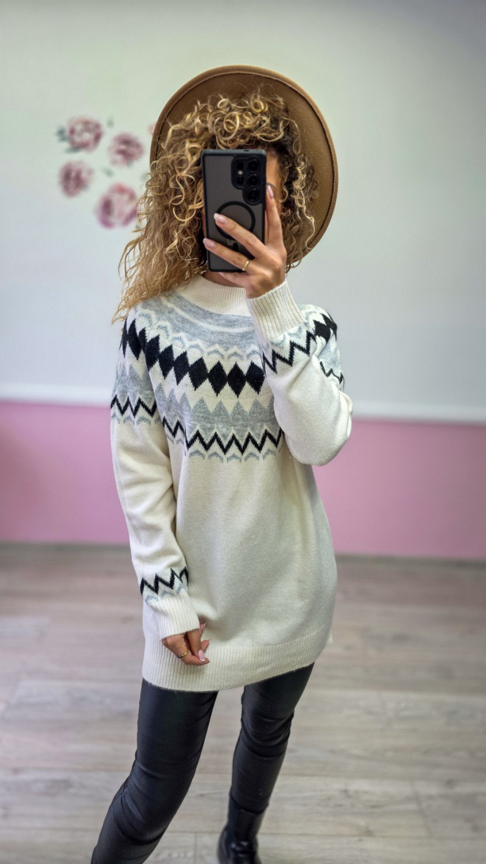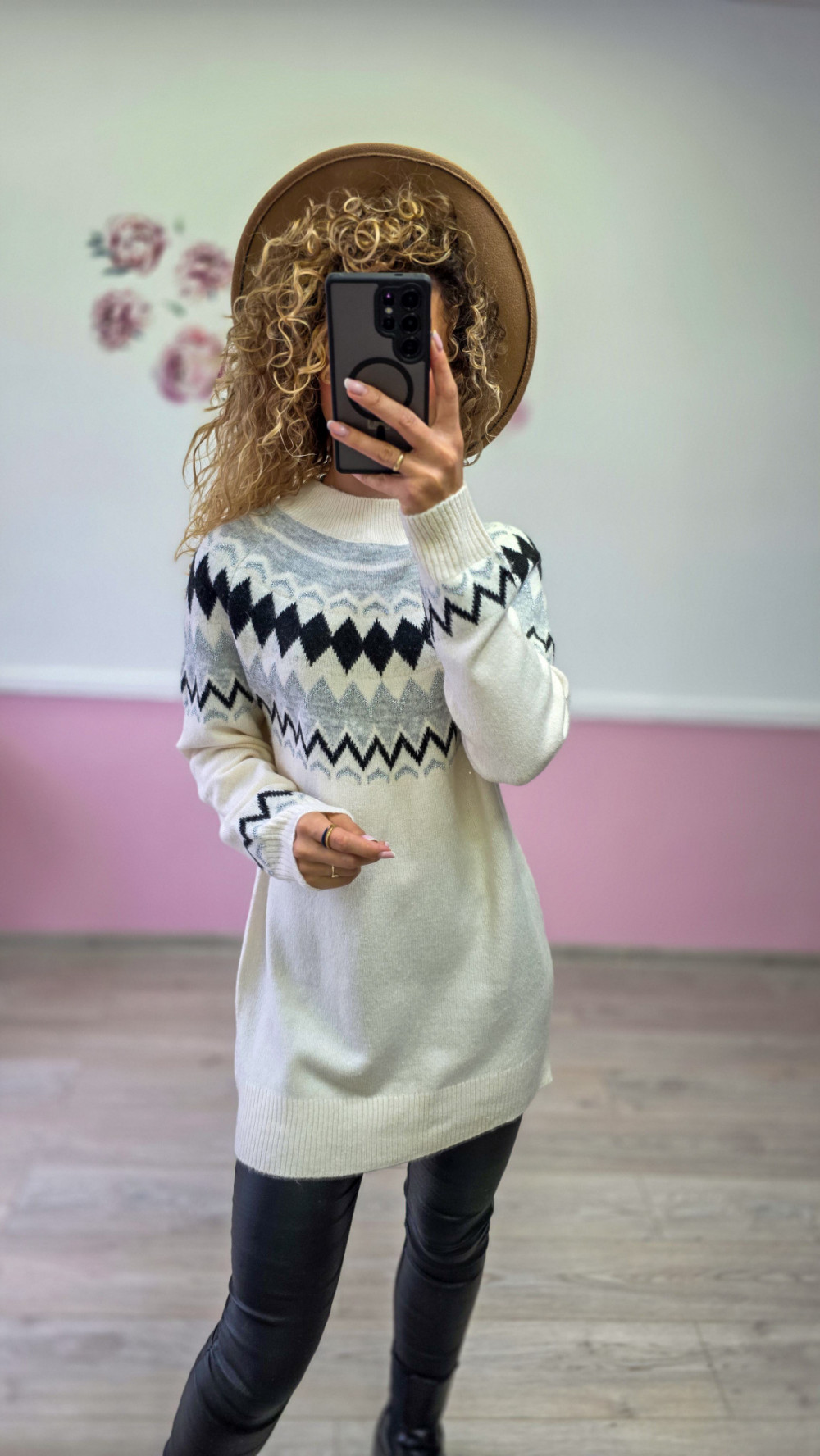Biały sweter w stylu norweskim to idealna propozycja na zimę. Miękki, ciepły i wyjątkowo przytulny – sprawdzi się w codziennych stylizacjach i świątecznych outfitach. Klasyczny wzór w odcieniach czerni i szarości dodaje mu uroku. Ten uroczy model znajdziesz w Domowym Lumpeksie.