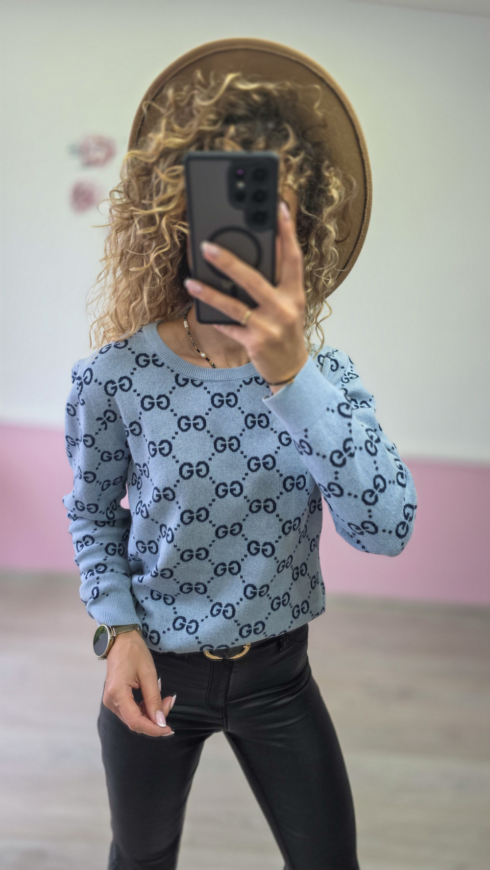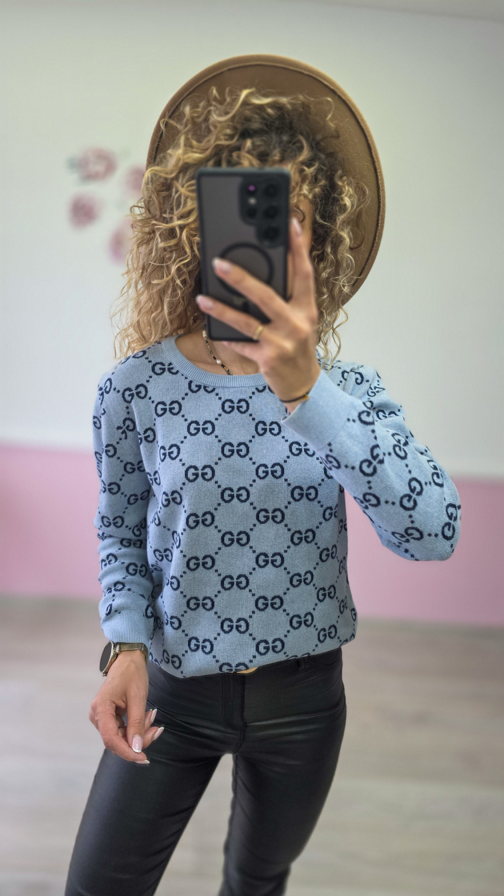 Błękitny sweter damski z ozdobnym wzorem to połączenie modnego designu i wygody. Wyróżnia się efektownym nadrukiem w stylu logo, który nadaje mu wyjątkowego charakteru. Miękki materiał przyjemnie otula skórę, a klasyczny krój podkreśla sylwetkę. Idealny wybór do codziennych stylizacji – świetnie wygląda zarówno z jeansami, jak i ze spódnicą. Ten modny sweter to must-have każdej kobiety, która lubi stylowe i wygodne ubrania na jesień i zimę.