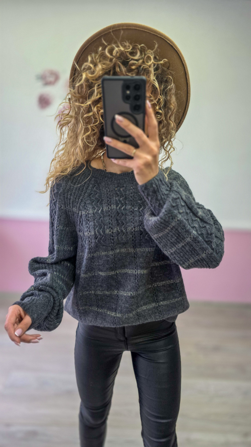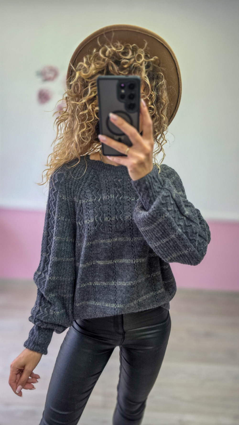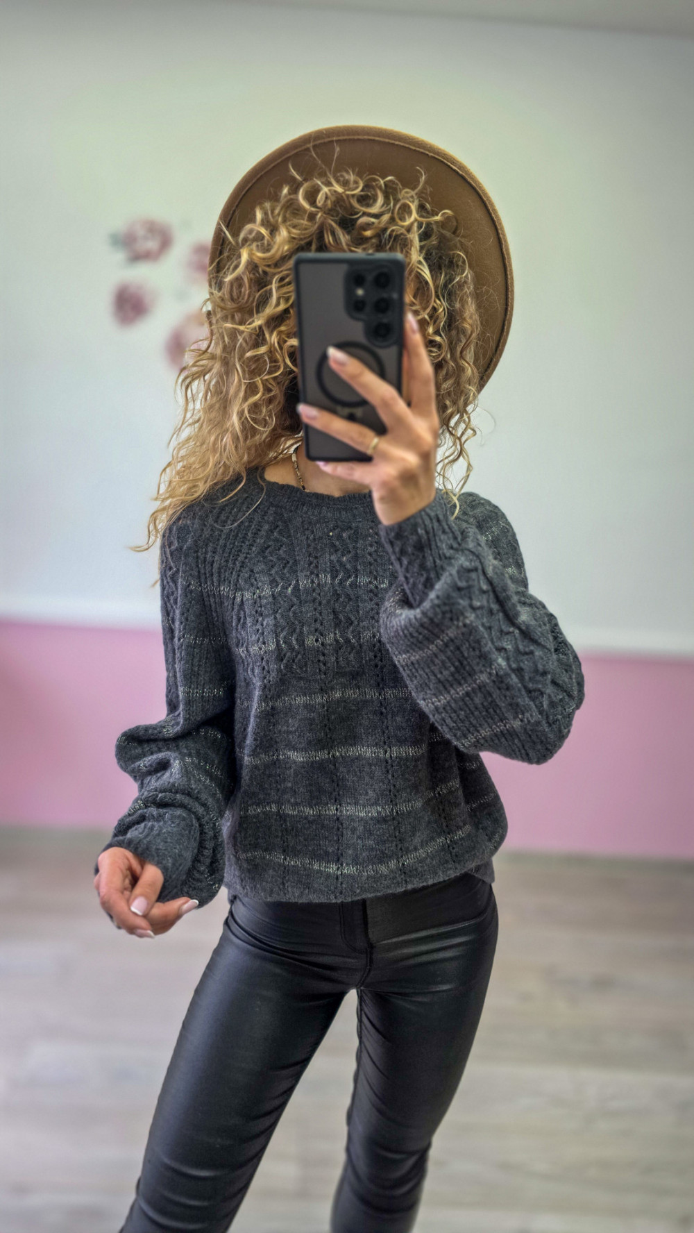 Grafitowy sweter damski o grubym splocie i szerokich rękawach to hit tego sezonu. Jego luźny krój gwarantuje swobodę ruchów i wygodę, a wyjątkowy design sprawia, że każda stylizacja nabiera charakteru. Ciepły, przytulny i miękki w dotyku – idealny na chłodne jesienne i zimowe dni. Świetnie wygląda w połączeniu ze skórzanymi spodniami, botkami lub kozakami. Ten modny sweter to idealna baza do casualowych i miejskich stylizacji.