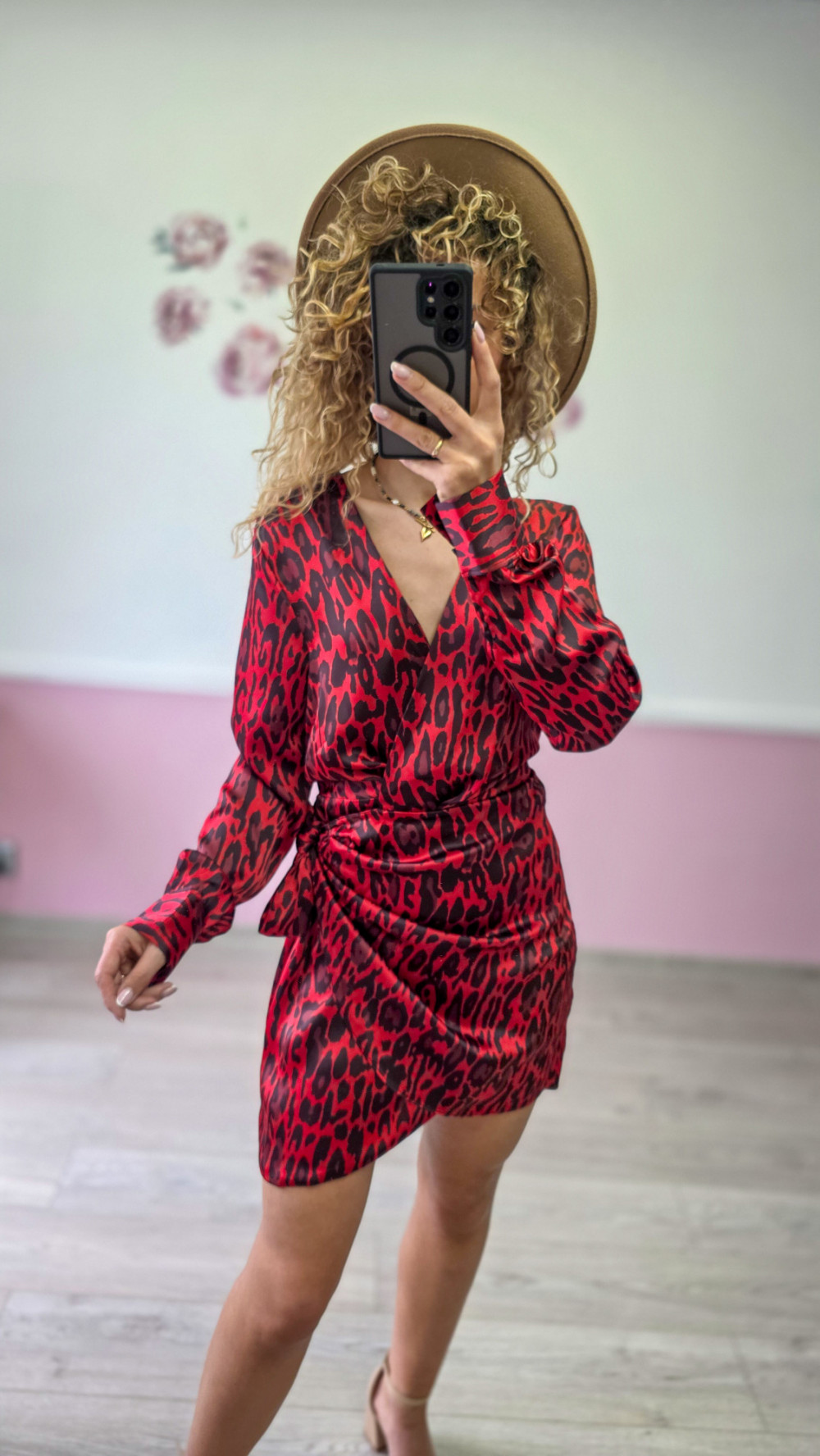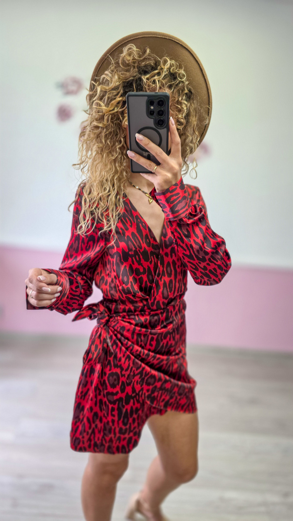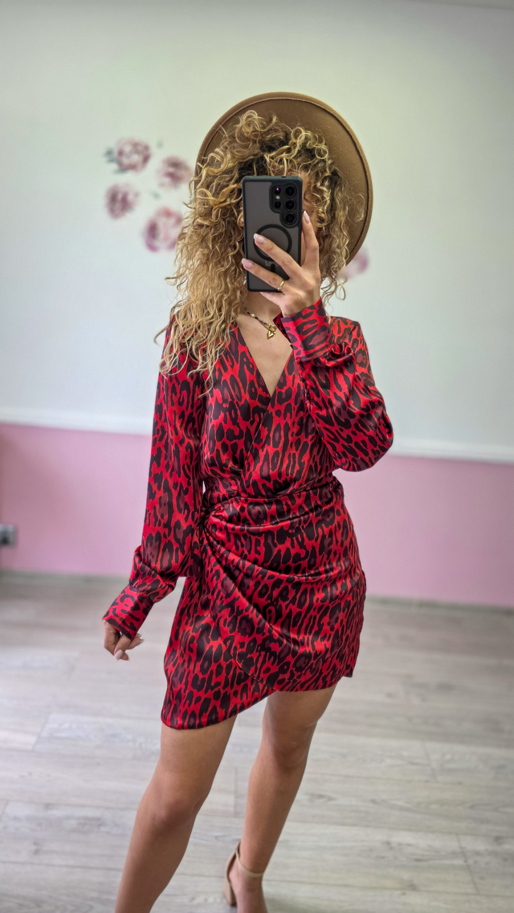Odważna i kobieca czerwona sukienka mini w panterkę to propozycja, która przyciąga wzrok! Dopasowany krój pięknie podkreśla talię, a dekolt kopertowy dodaje zmysłowości. Idealna na wieczorne wyjścia, imprezy i randki. Lekko połyskujący materiał i wyrazisty wzór sprawiają, że każda kobieta poczuje się w niej wyjątkowo.