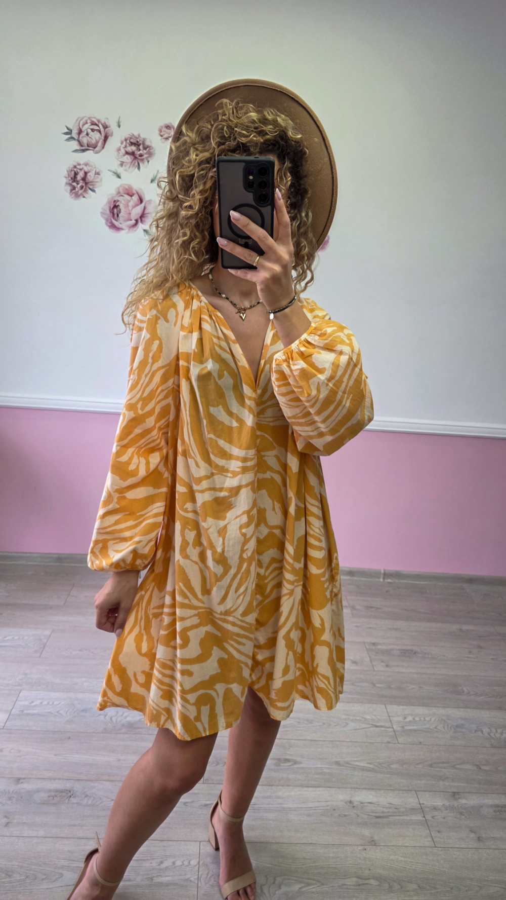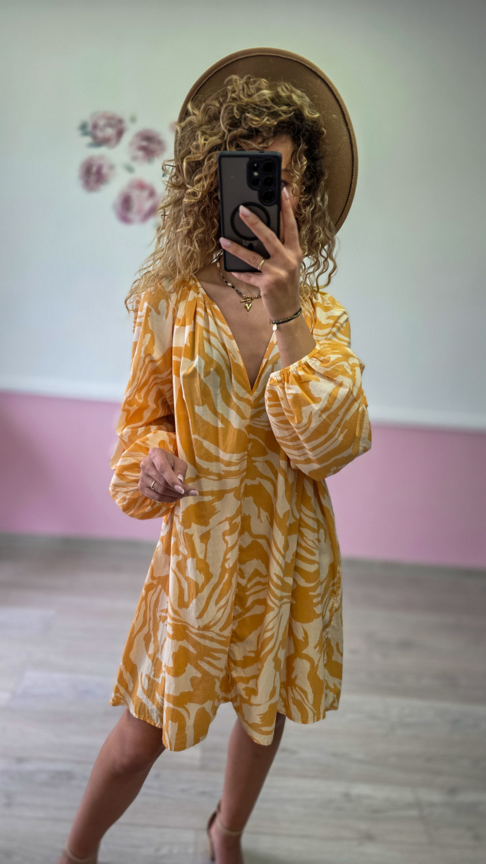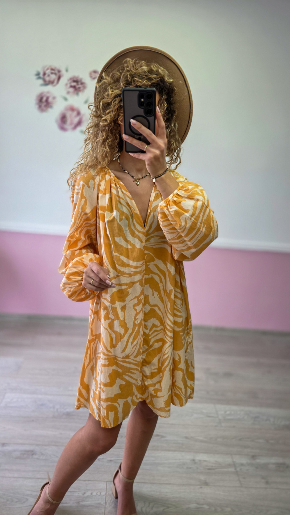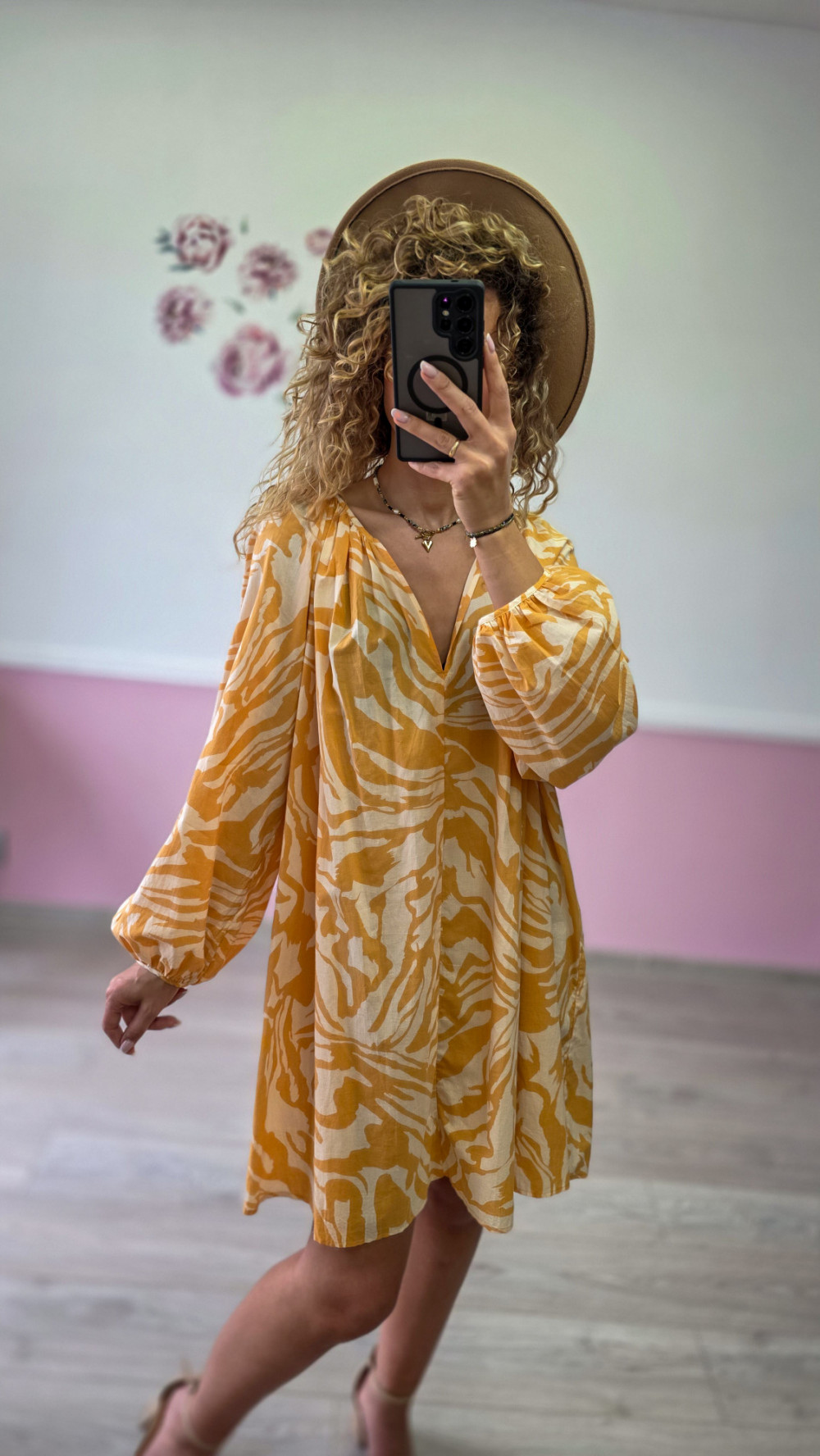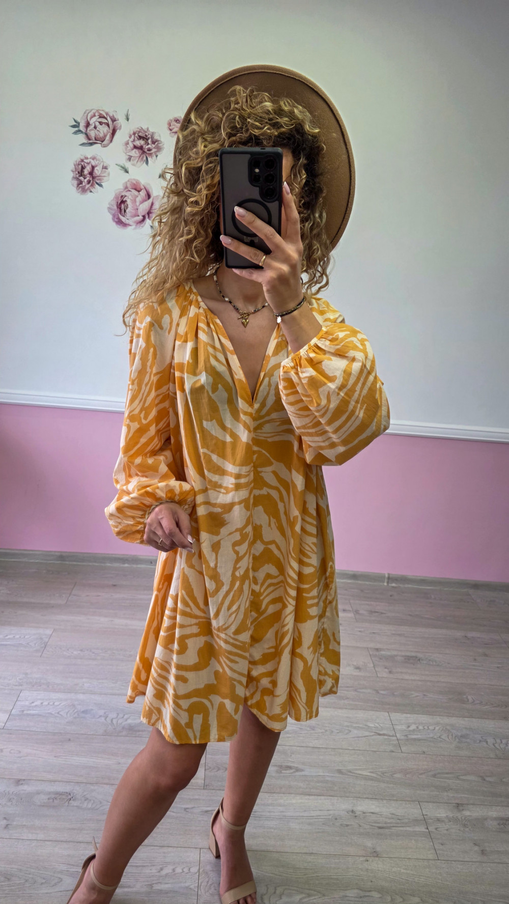 Przepiękna sukienka mini w stylu boho w odcieniach żółci i bieli to idealna propozycja na lato. Zwiewna, lekka i niezwykle kobieca. Wykonana z przewiewnego materiału, który zapewnia komfort nawet w gorące dni. Luźny fason, dekolt w serek i bufiaste rękawy dodają jej uroku i romantycznego charakteru. Świetna na wakacje, spacery i spotkania ze znajomymi.