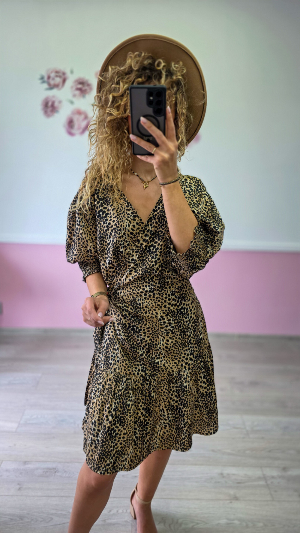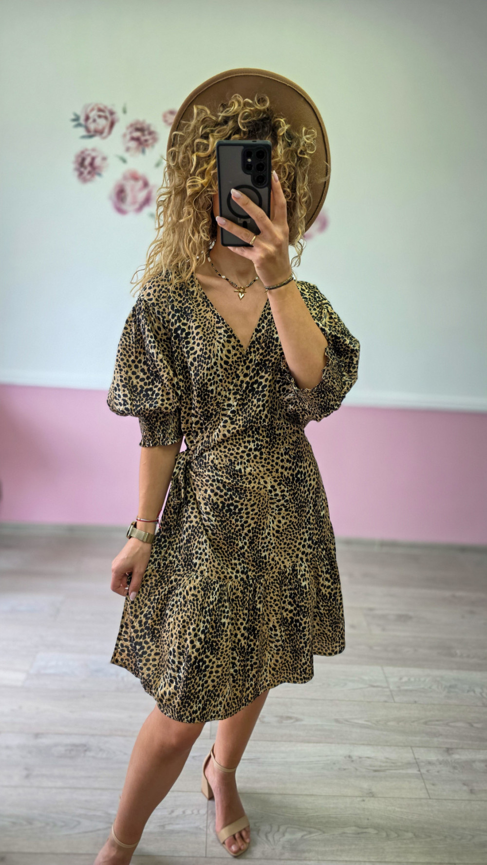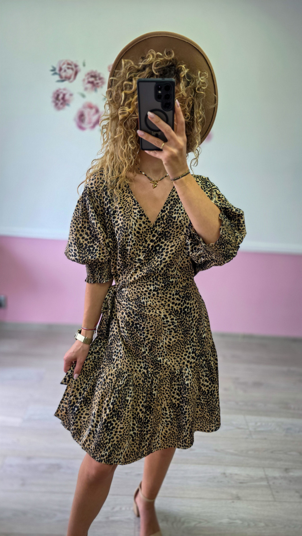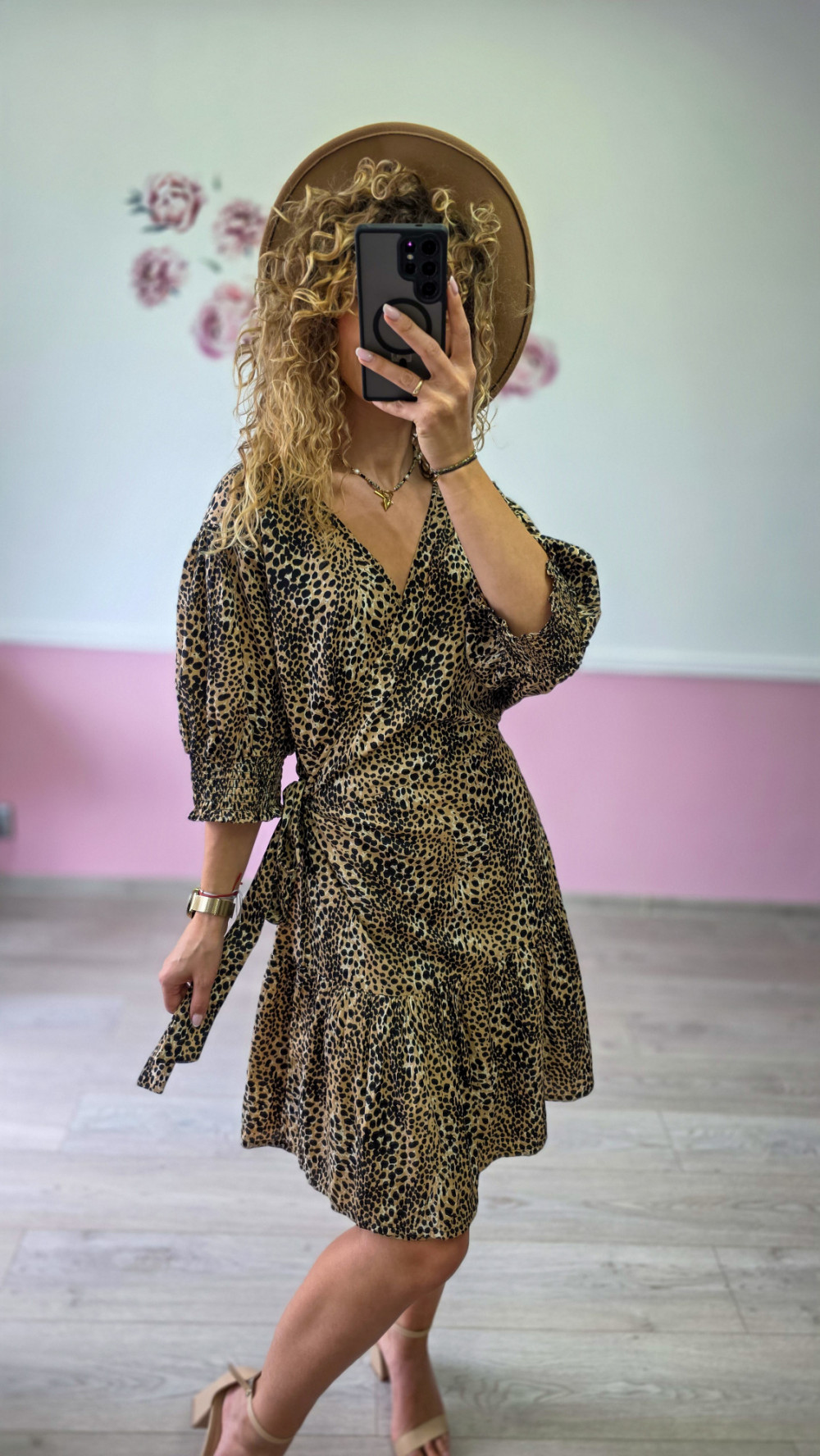 Kobieca sukienka kopertowa w panterkę to modny wybór dla odważnych kobiet, które kochają styl i wygodę. Zwiewny materiał subtelnie otula sylwetkę, a kopertowy krój z wiązaniem w talii podkreśla figurę. Bufiaste rękawy dodają lekkości i elegancji, a wzór w cętki przyciąga wzrok. Idealna na randkę, spotkanie lub wieczorne wyjście. Stylowa, wygodna i niezwykle kobieca.