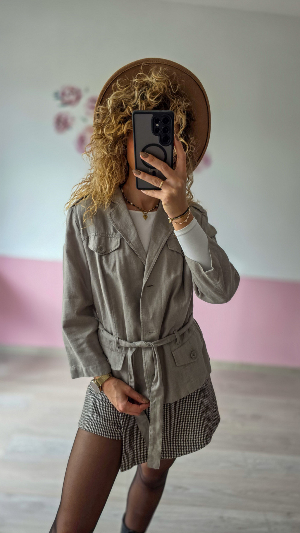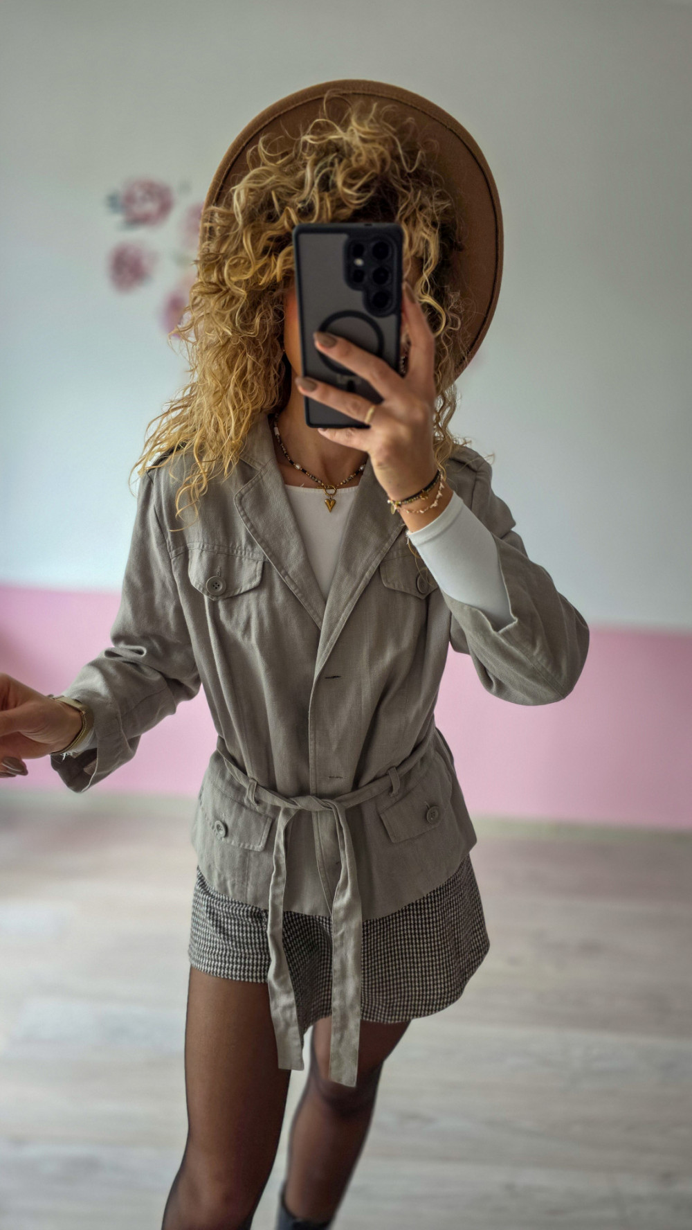 Marynarka posiada klasyczny kołnierz z klapami, dwie praktyczne kieszenie z patkami oraz pasek w talii, który pozwala dopasować fason do sylwetki i podkreślić kobiece kształty. Jej neutralny, beżowo-szary odcień idealnie komponuje się z wieloma kolorami – od bieli i czerni po zgaszone brązy, zielenie i pastele.