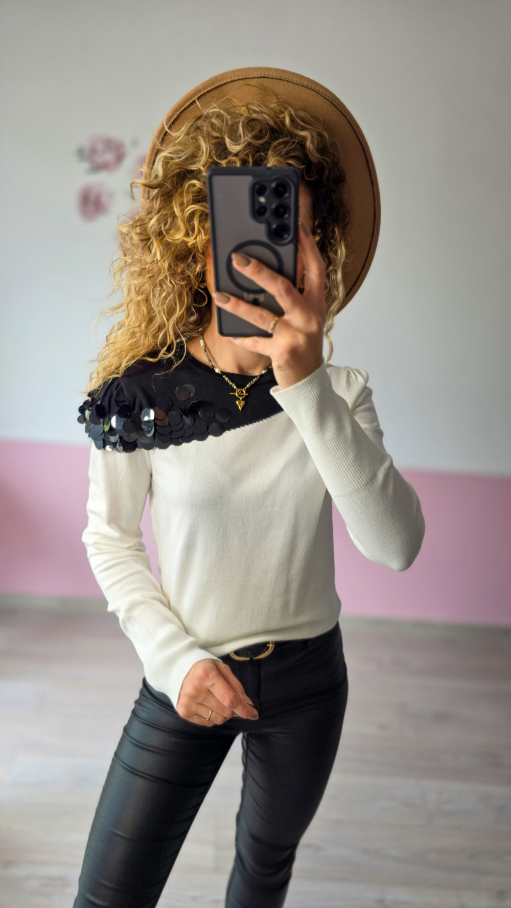 Wykonany z miękkiej, elastycznej dzianiny, zapewnia komfort i elegancki wygląd przez cały dzień. Kontrastowe wykończenie w postaci czarnej aplikacji z dużymi cekinami na ramieniu przyciąga wzrok i dodaje niepowtarzalnego charakteru.