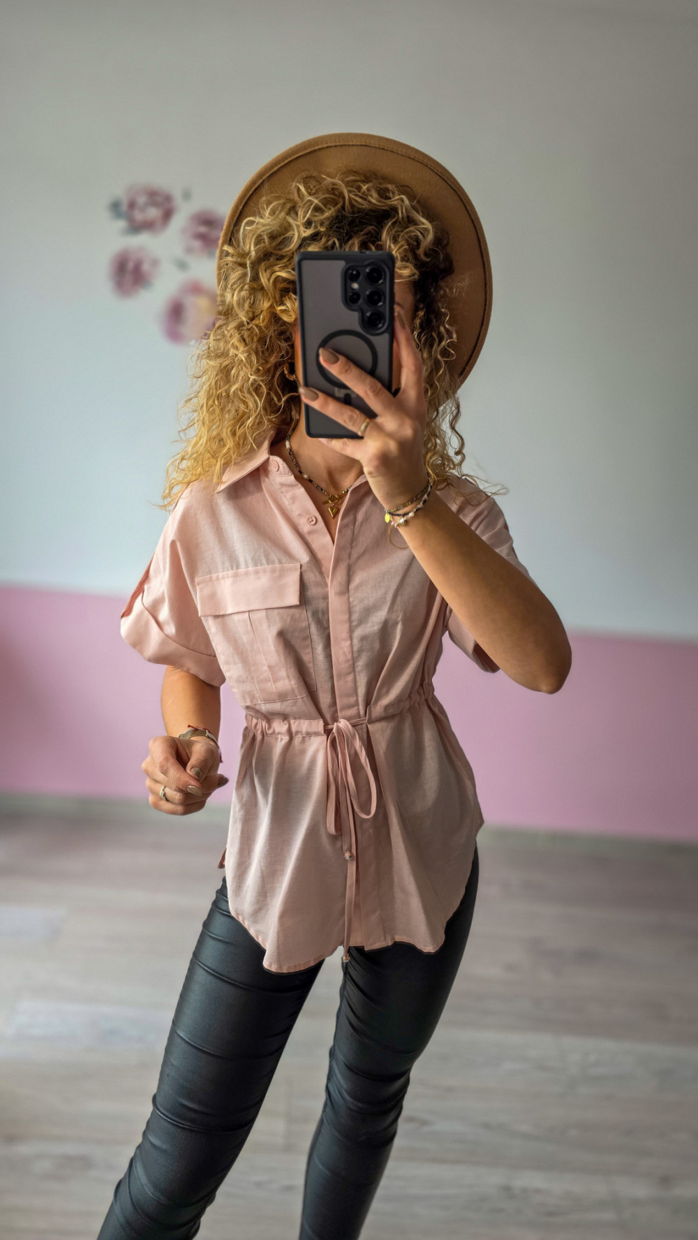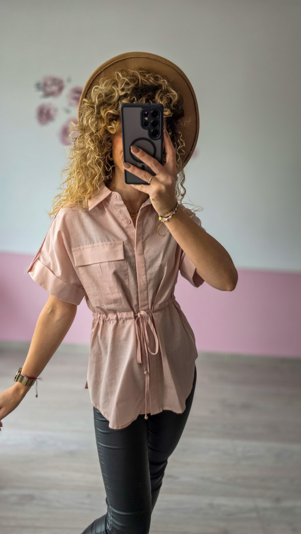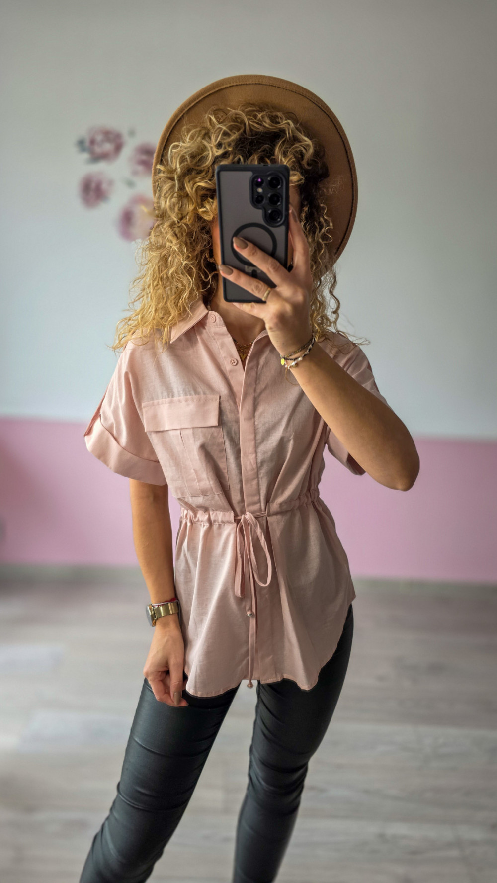 Luźny, koszulowy fason z wiązaniem w talii pozwala dopasować krój do sylwetki, podkreślając figurę i nadając jej subtelnie kobiecego kształtu. Krótkie, szerokie rękawy i delikatny odcień pudrowego różu nadają całości świeżości i lekkości.