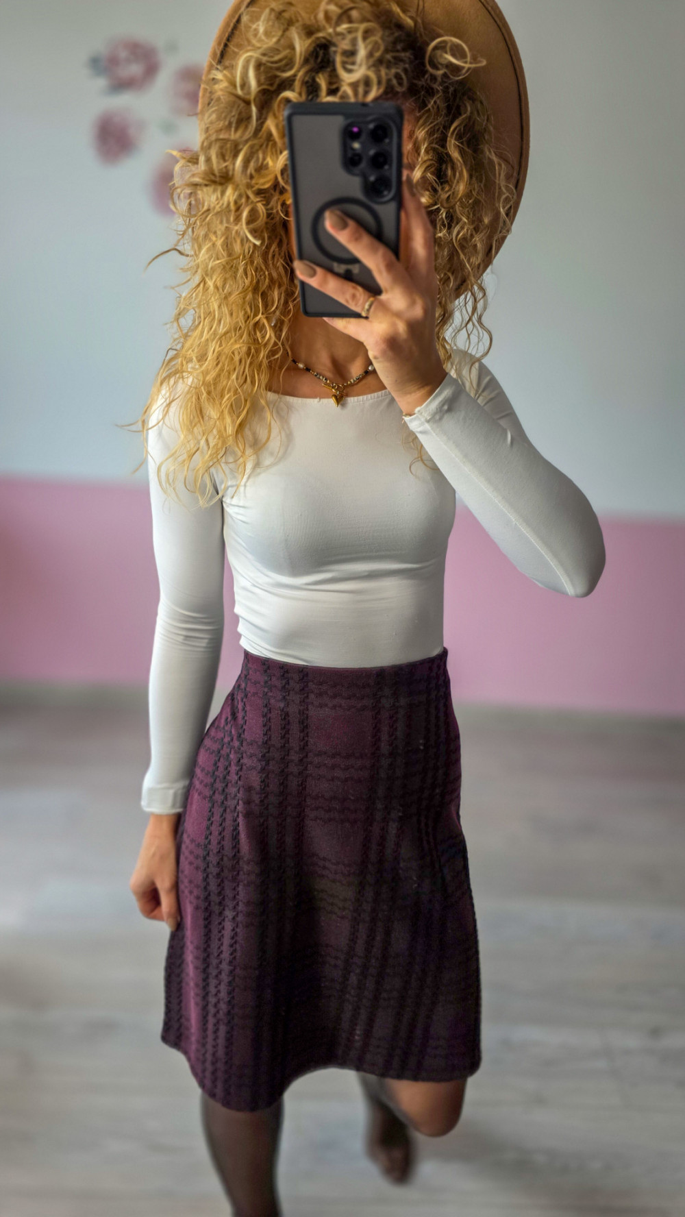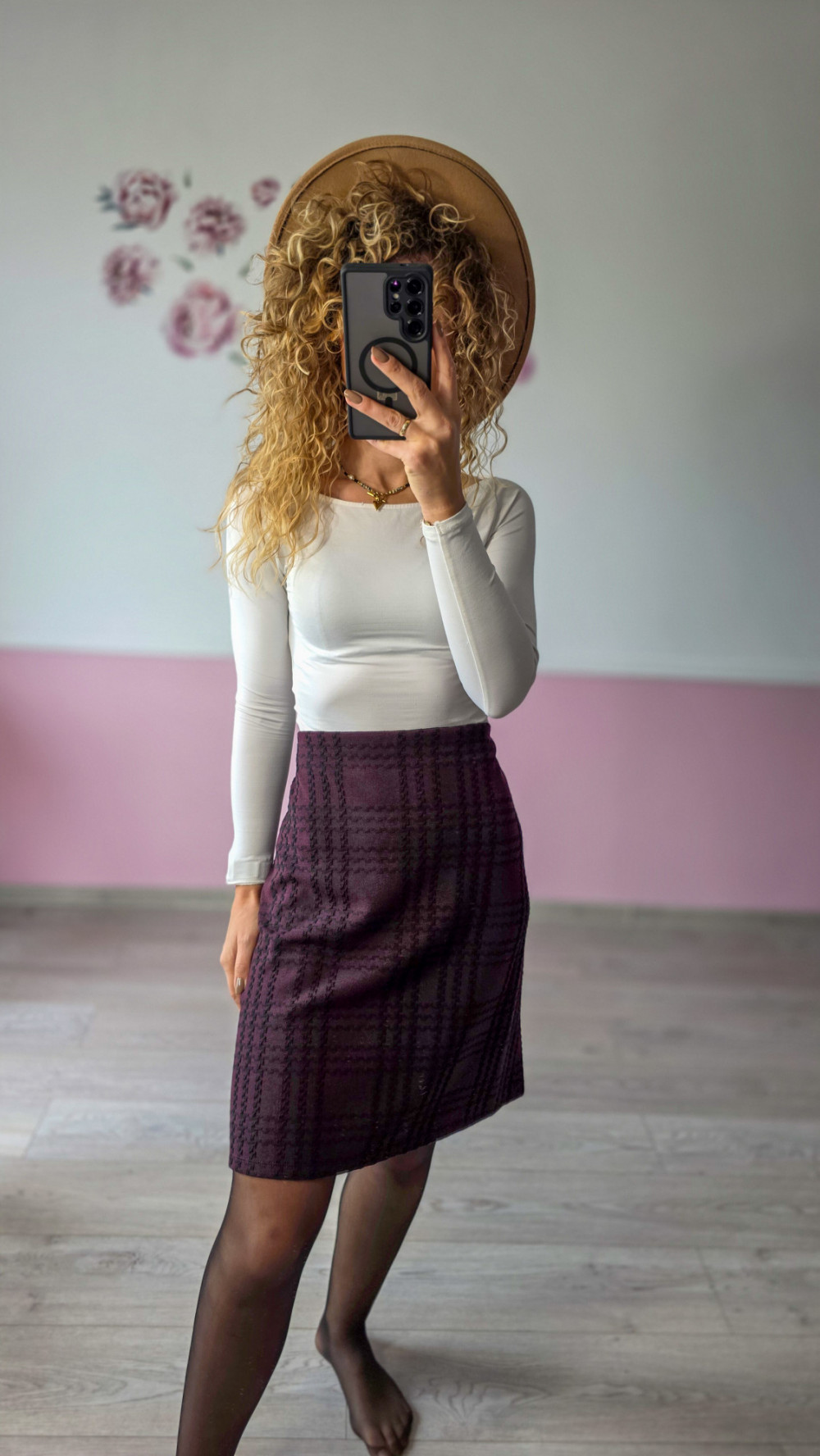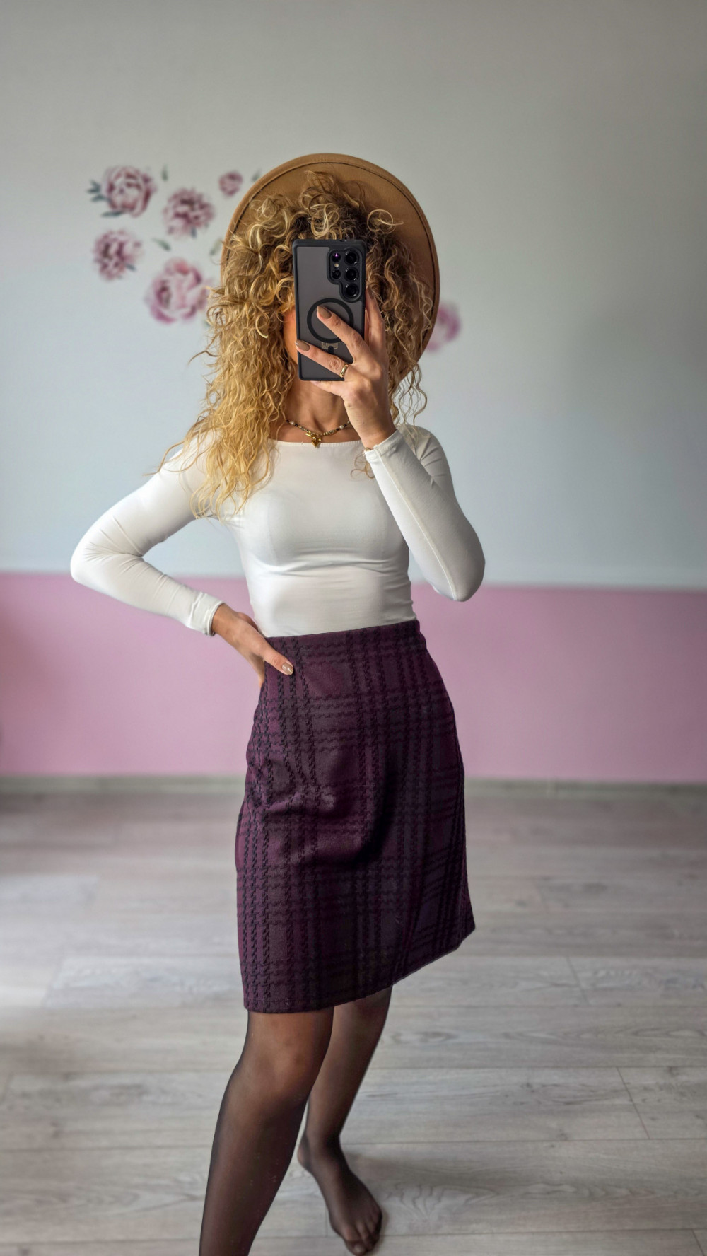Stylowa spódnica ołówkowa w modną kratę w odcieniach bordo i czerni. Wykonana z miękkiej, elastycznej tkaniny, która pięknie dopasowuje się do figury. Ponadczasowy wzór w kratę sprawia, że spódnica pasuje do wielu stylizacji – od casualowych po eleganckie. Doskonała na jesień i zimę, w połączeniu z golfem lub koszulą.