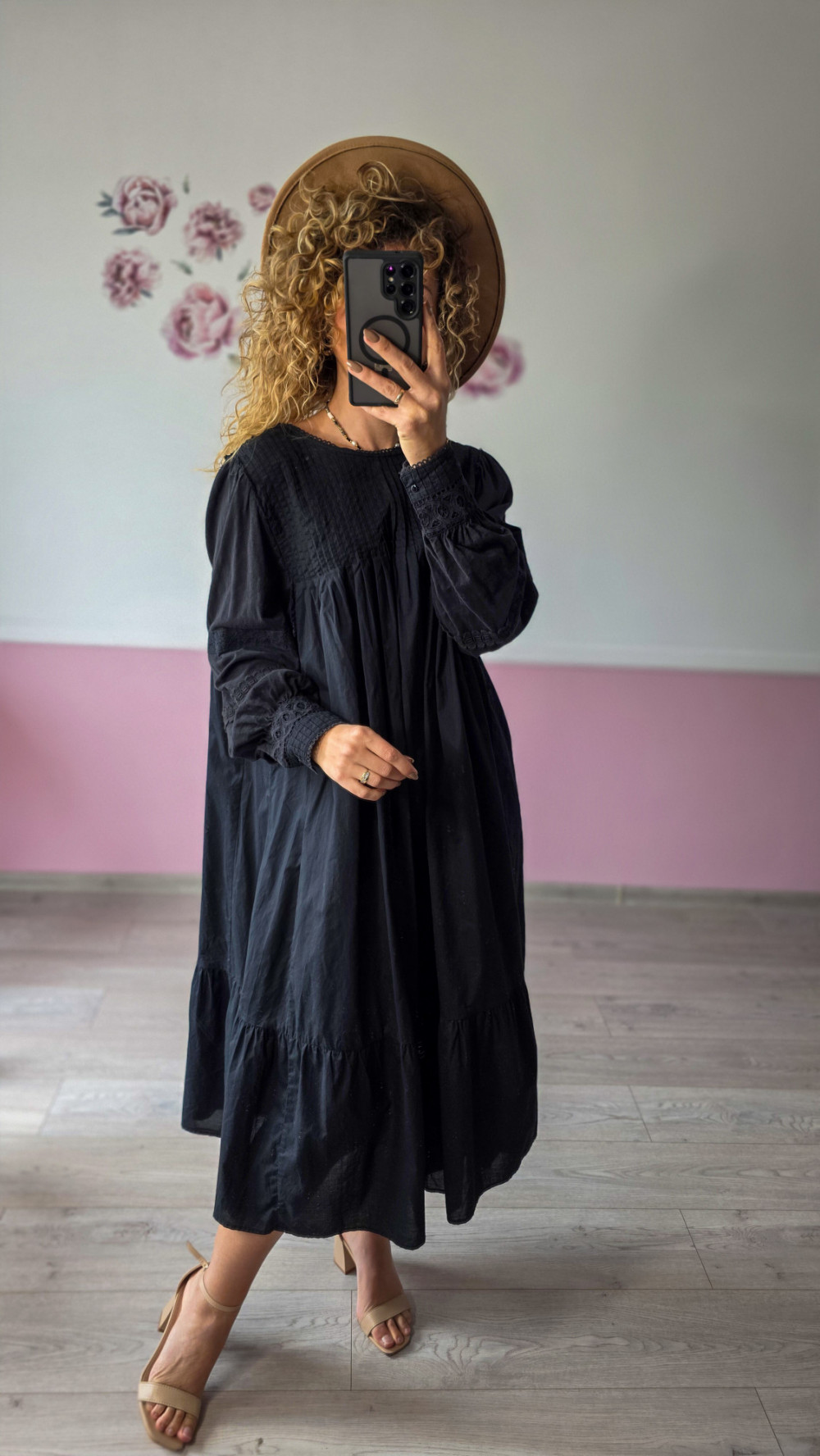 Luźny fason zapewnia swobodę ruchów, a delikatne zdobienia na rękawach i górze sukienki dodają jej wyjątkowego uroku. To model, który sprawdzi się zarówno na co dzień, jak i na wyjątkowe okazje — wystarczy zmienić dodatki, by uzyskać inny efekt.