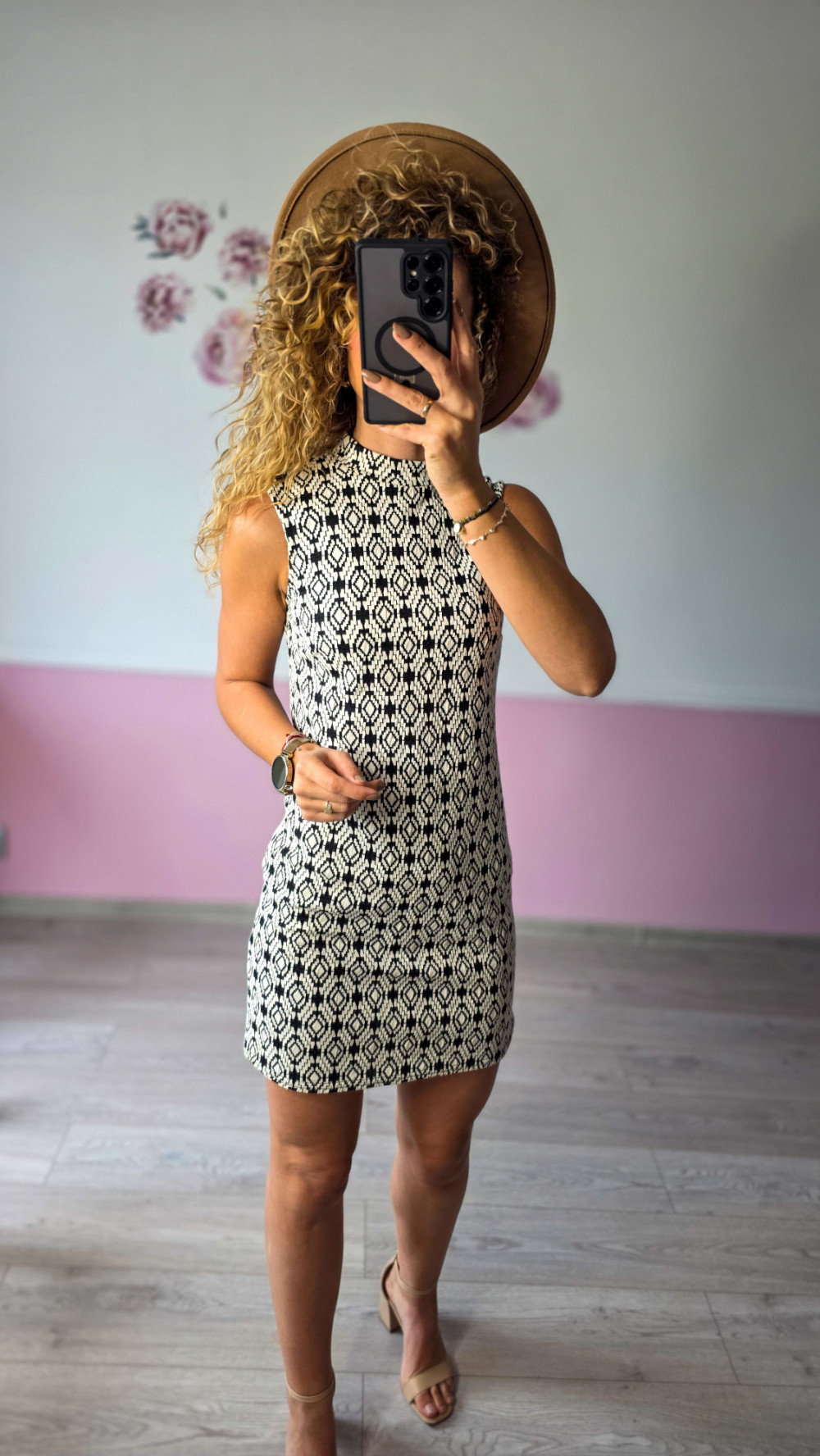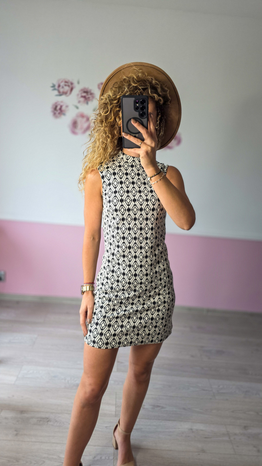 Sukienka ołówkowa mini w modny, czarno-biały geometryczny wzór. Dopasowany fason pięknie podkreśla sylwetkę, a zabudowany dekolt dodaje elegancji i szyku. Wykonana z elastycznej, miękkiej tkaniny, gwarantuje komfort noszenia przez cały dzień. To uniwersalna propozycja, która sprawdzi się zarówno w pracy, jak i na spotkaniach towarzyskich.