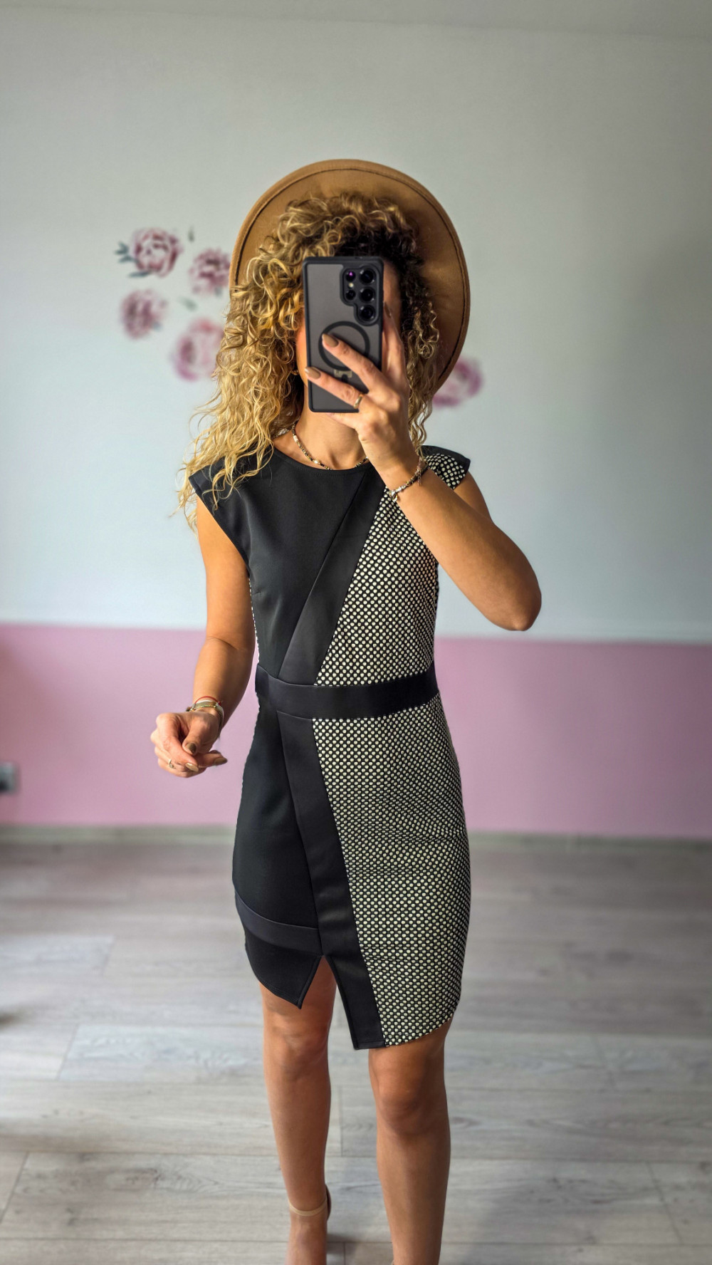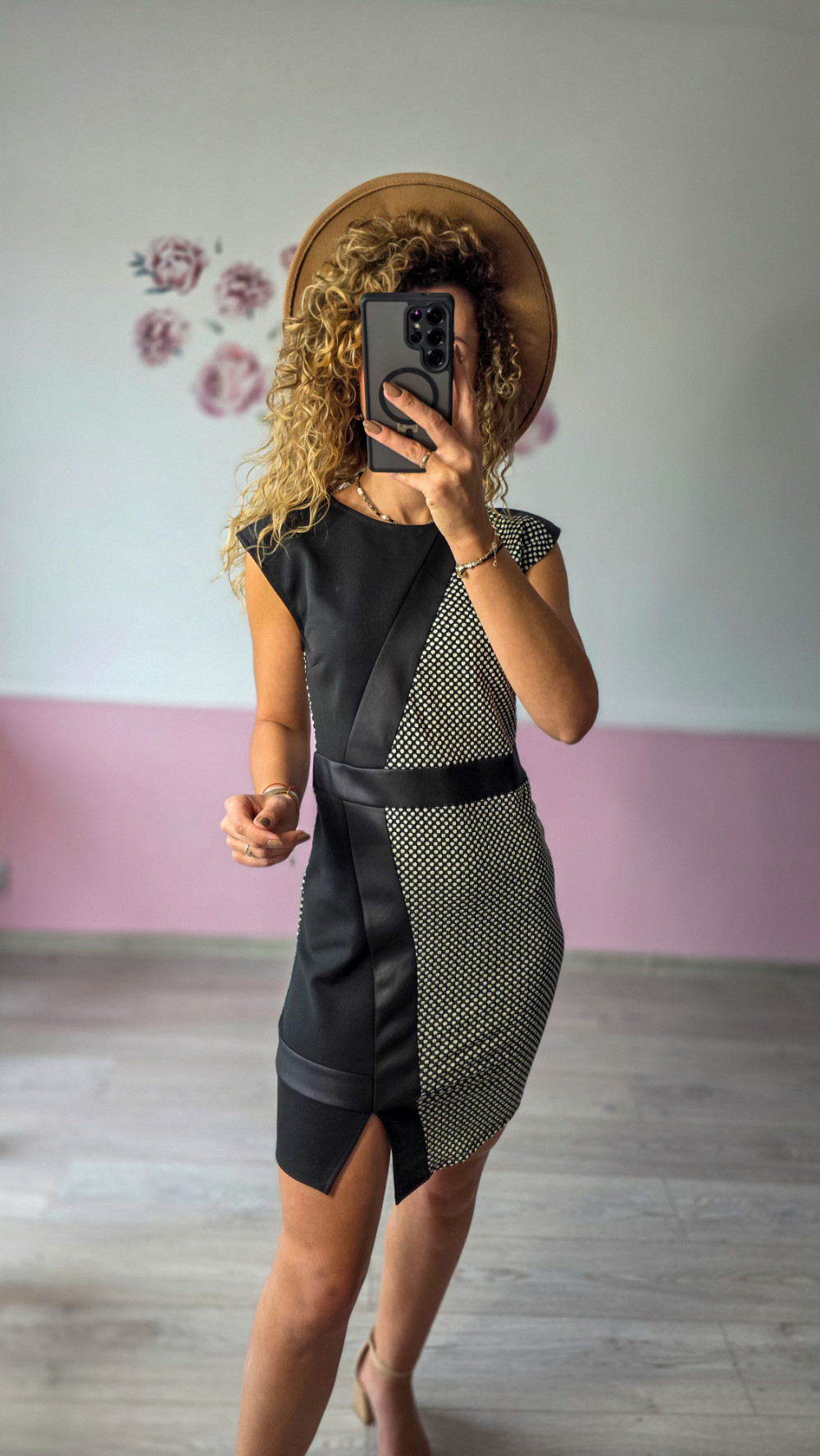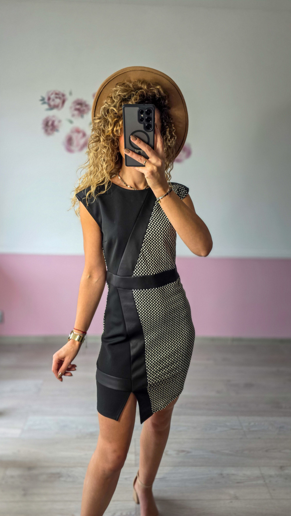 Stylowa sukienka o dopasowanym kroju, łącząca klasyczną czerń z białym, drobnym wzorem. Asymetryczne przeszycia i wstawki optycznie wysmuklają sylwetkę, podkreślając talię. Idealna propozycja dla kobiet ceniących elegancję z nutą nowoczesności. Sprawdzi się zarówno do biura, jak i na wyjątkowe okazje.