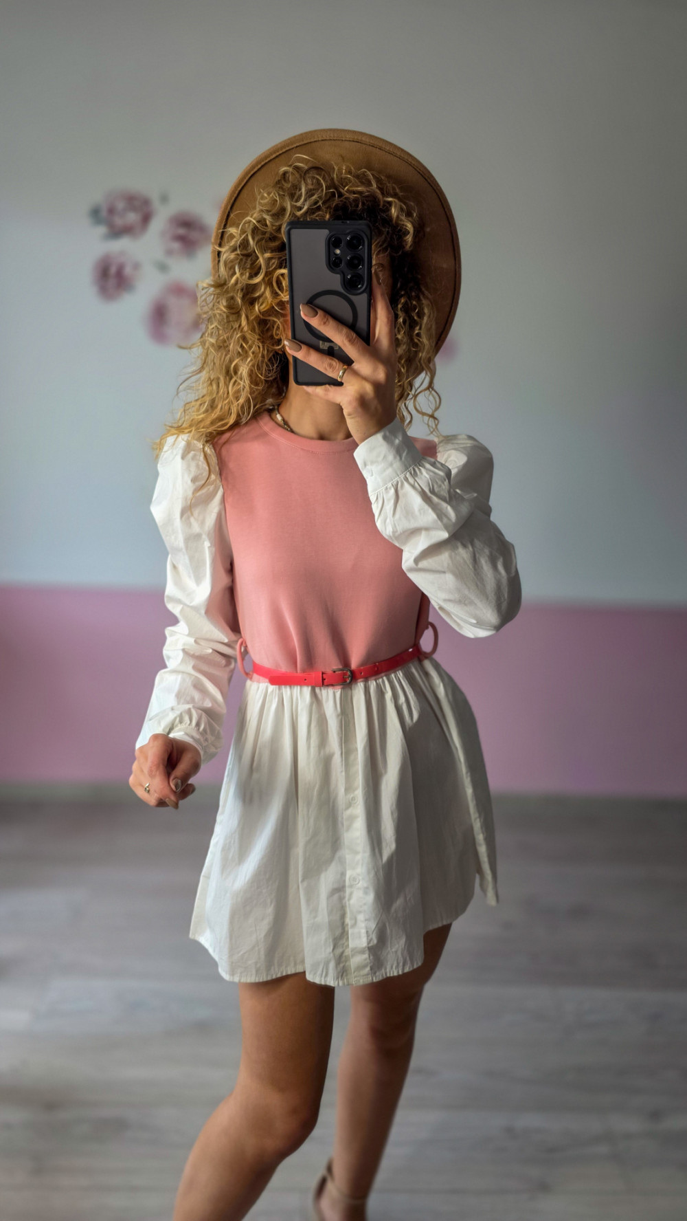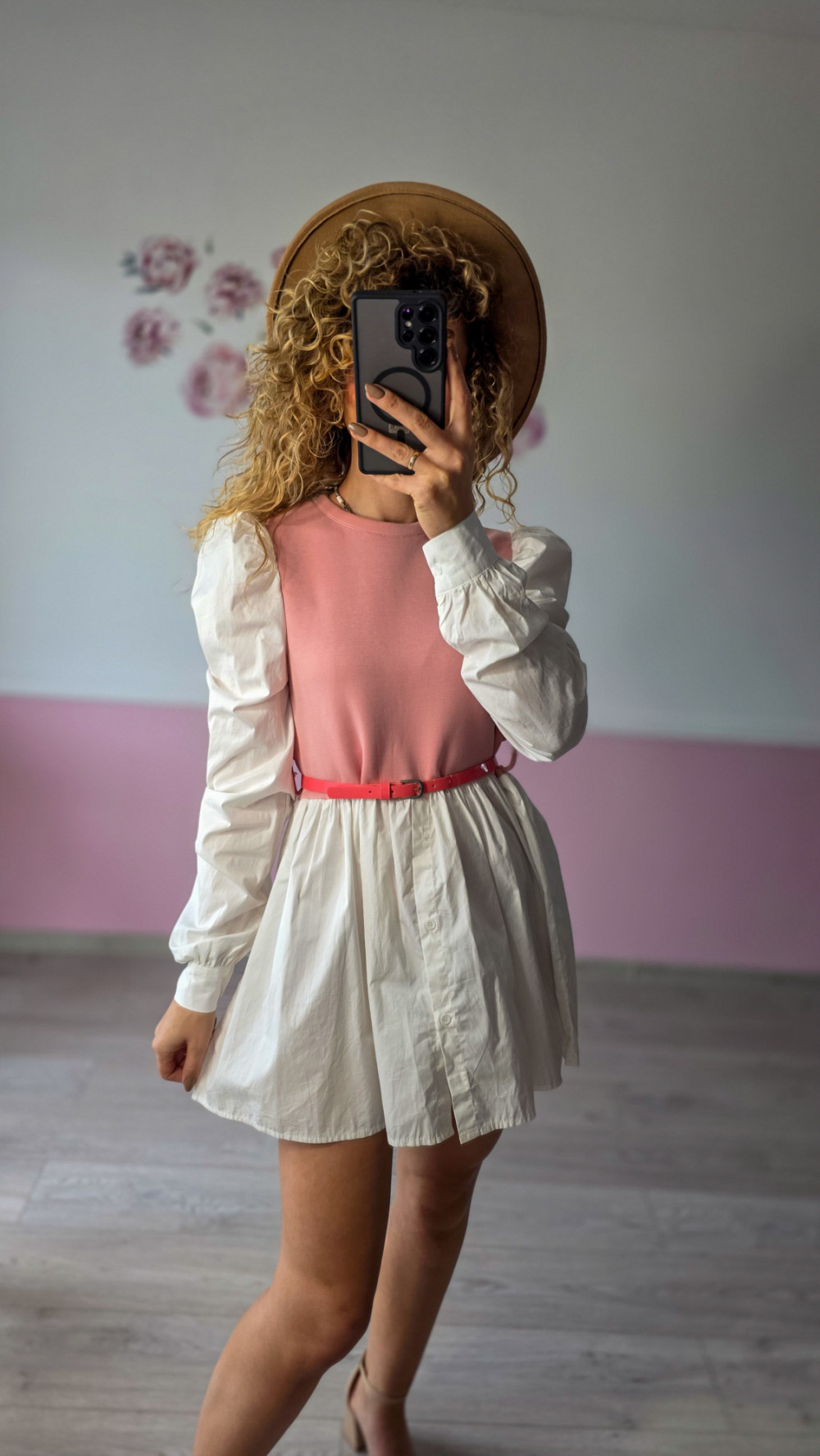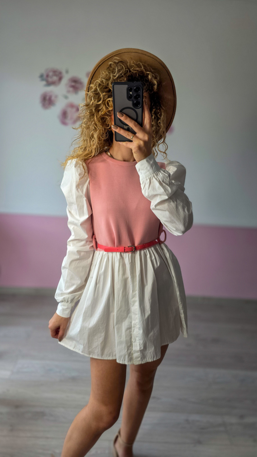 Urocza dwukolorowa sukienka łącząca różowy top z białym, rozkloszowanym dołem koszulowym. Długie bufiaste rękawy i cienki pasek w talii podkreślają kobiecą sylwetkę. Wykonana z lekkiego, oddychającego materiału, zapewnia komfort noszenia. Idealna na co dzień, do pracy lub spotkania ze znajomymi.
