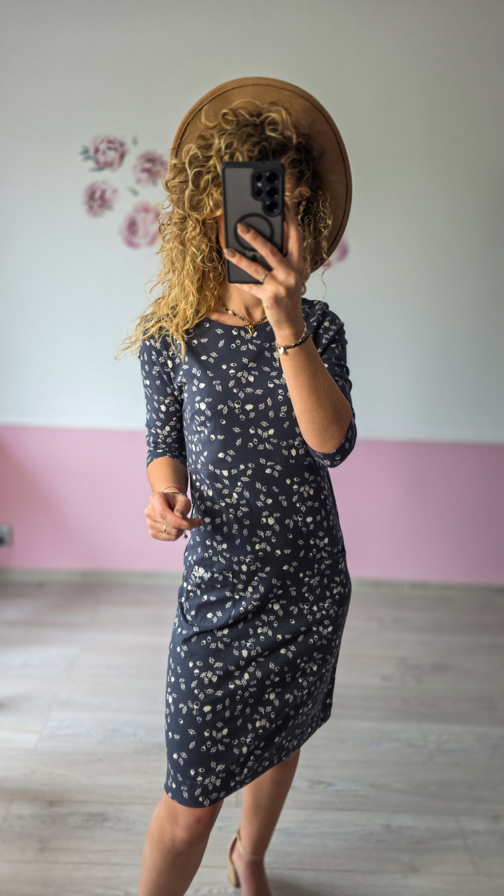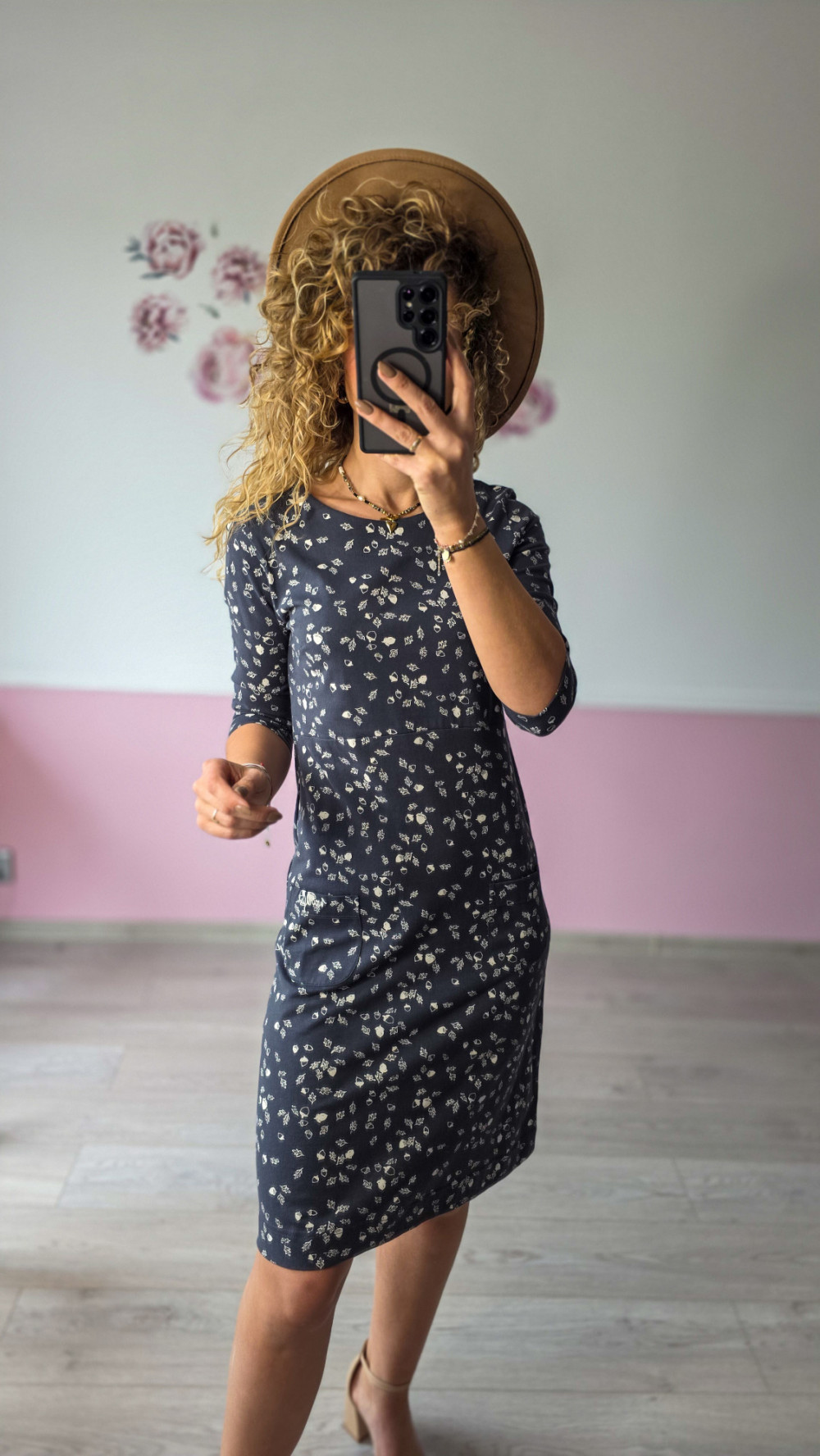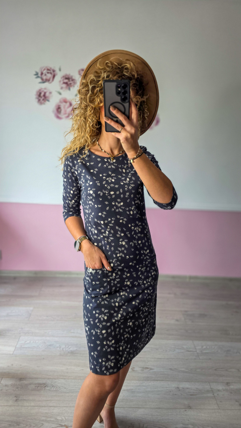 Granatowa sukienka w delikatny, beżowy wzór to idealny wybór na co dzień i do pracy. Prosty krój z rękawem ¾ zapewnia wygodę, a miękki, elastyczny materiał pięknie dopasowuje się do sylwetki. Długość przed kolano i praktyczne kieszenie dodają jej casualowego uroku. To ponadczasowy model, który sprawdzi się w każdej garderobie.