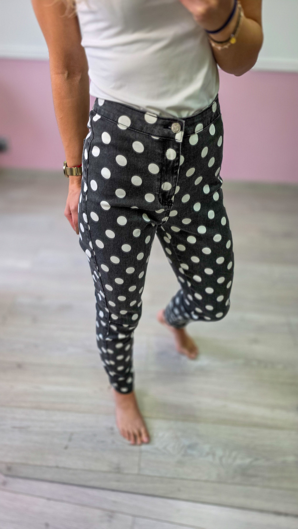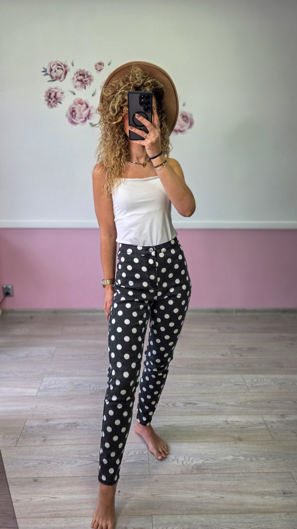 Stylowe czarne spodnie w duże białe grochy to połączenie klasyki i odwagi. Wysoki stan pięknie podkreśla talię, a dopasowany krój wysmukla sylwetkę. Ten model idealnie sprawdzi się zarówno w casualowych stylizacjach, jak i w eleganckim wydaniu z koszulą czy marynarką. Wykonane z miękkiego, elastycznego materiału, gwarantują komfort przez cały dzień. Postaw na ponadczasowy wzór, który nigdy nie wychodzi z mody!