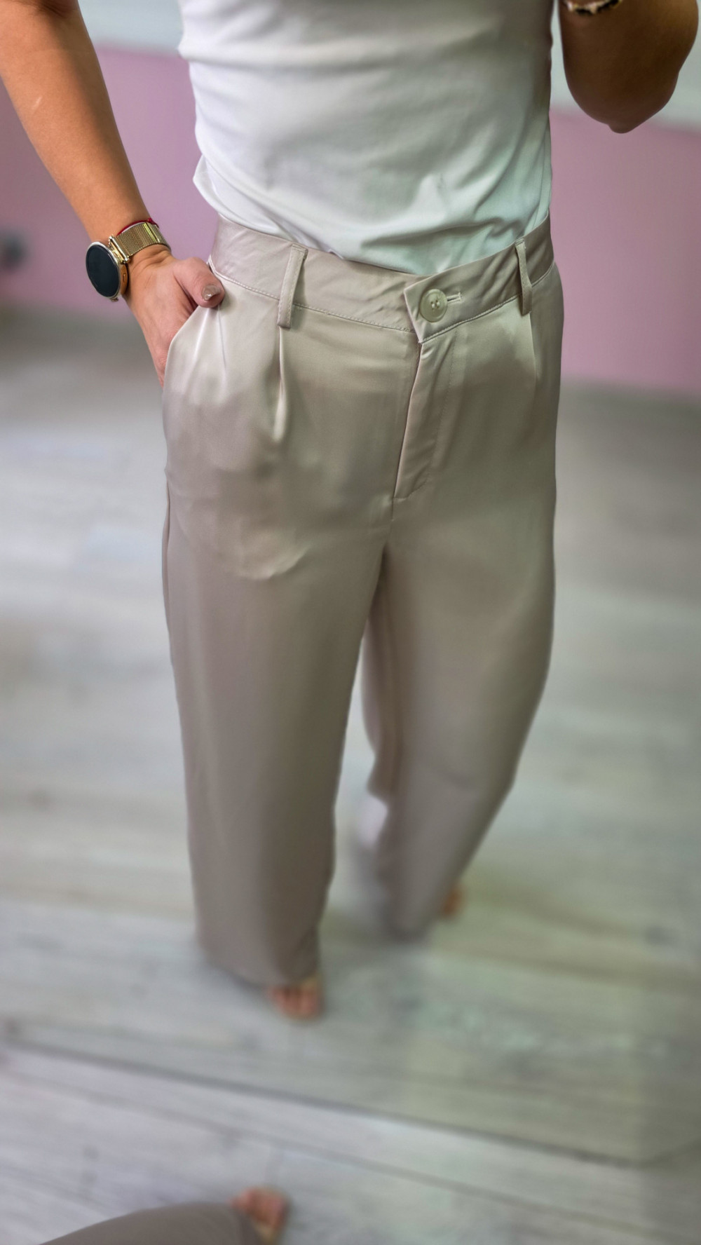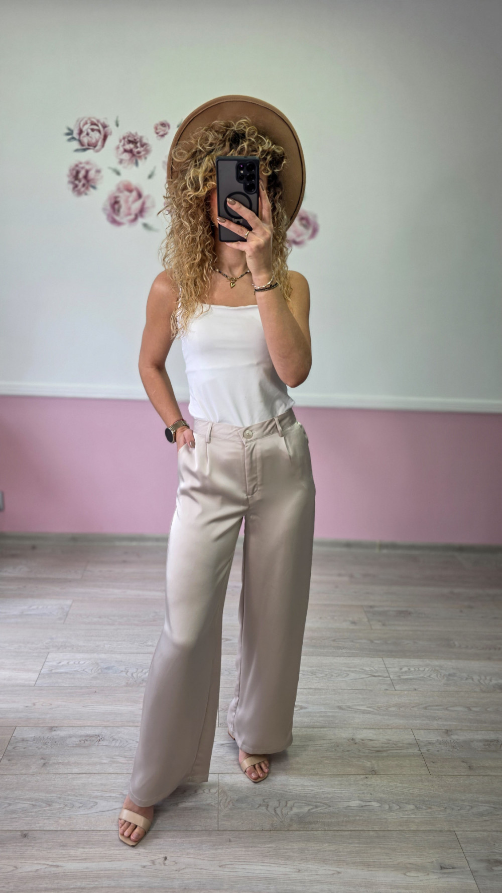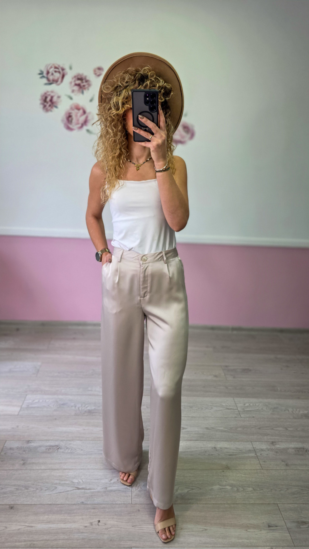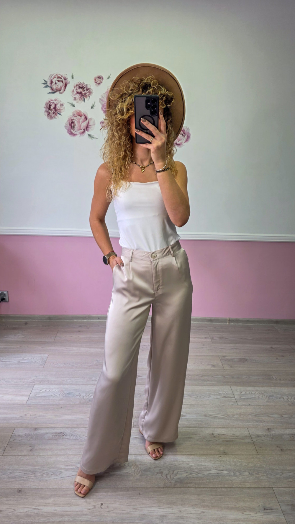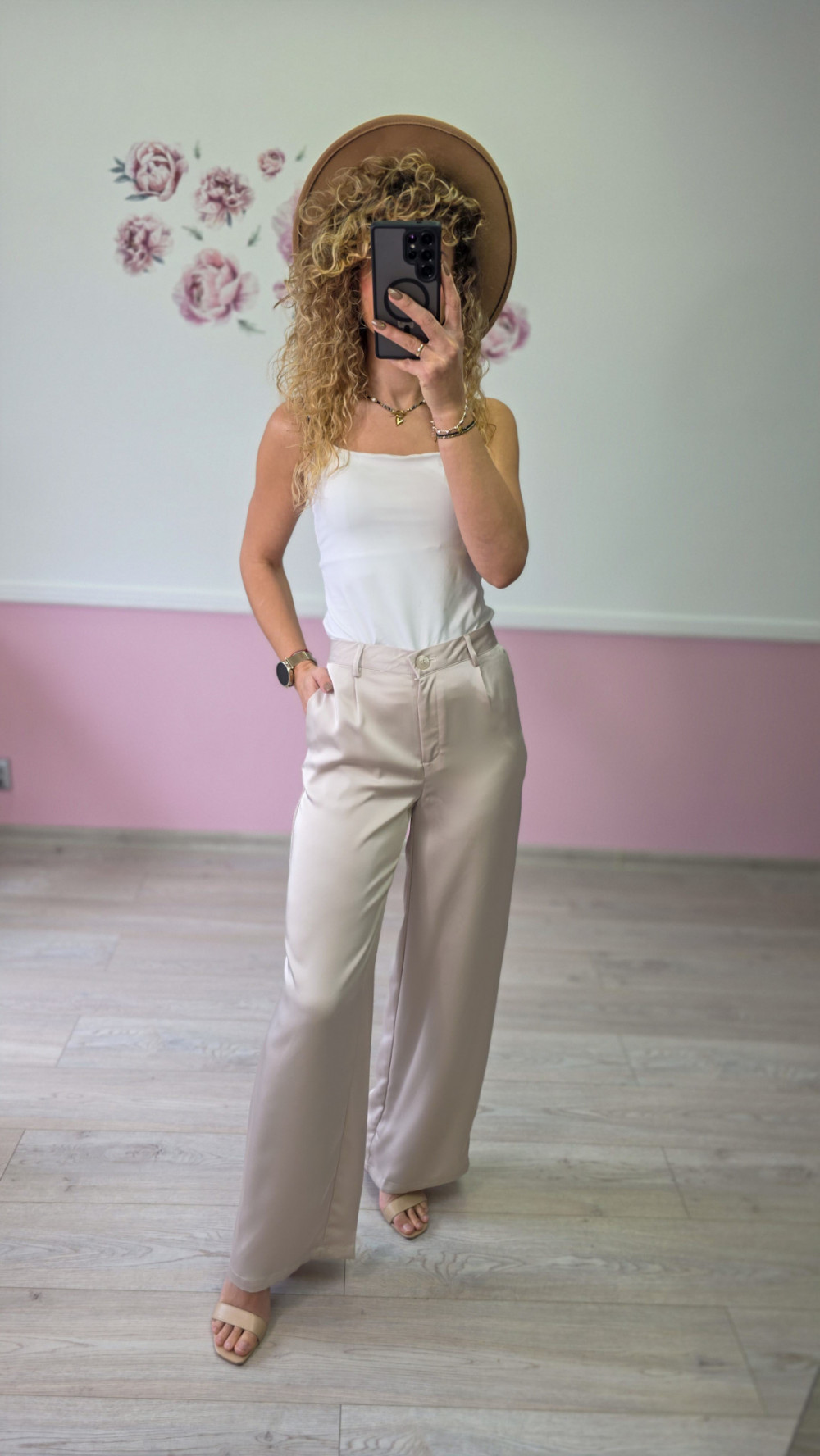 Beżowe, szerokie spodnie z satynowym połyskiem