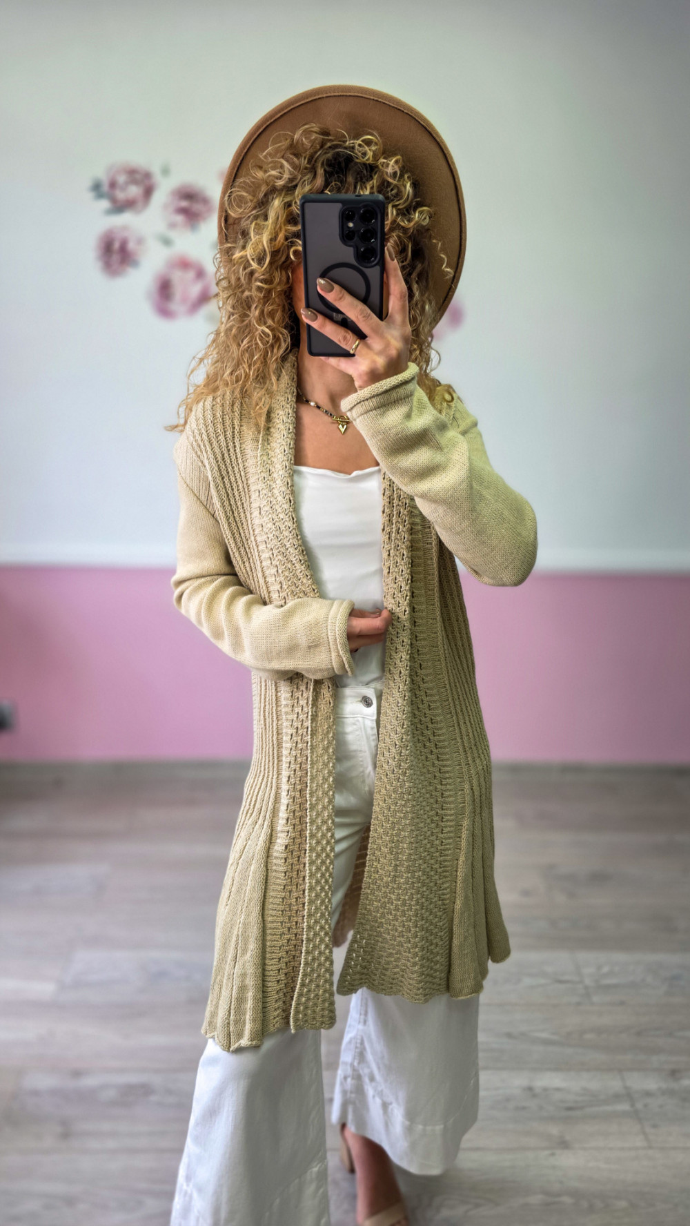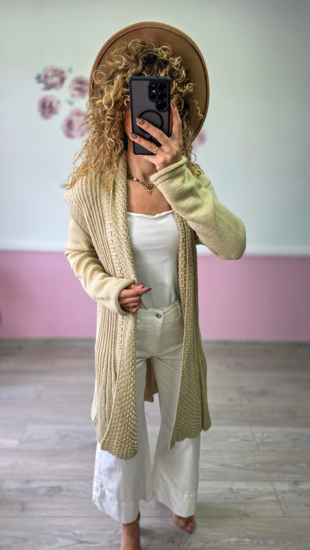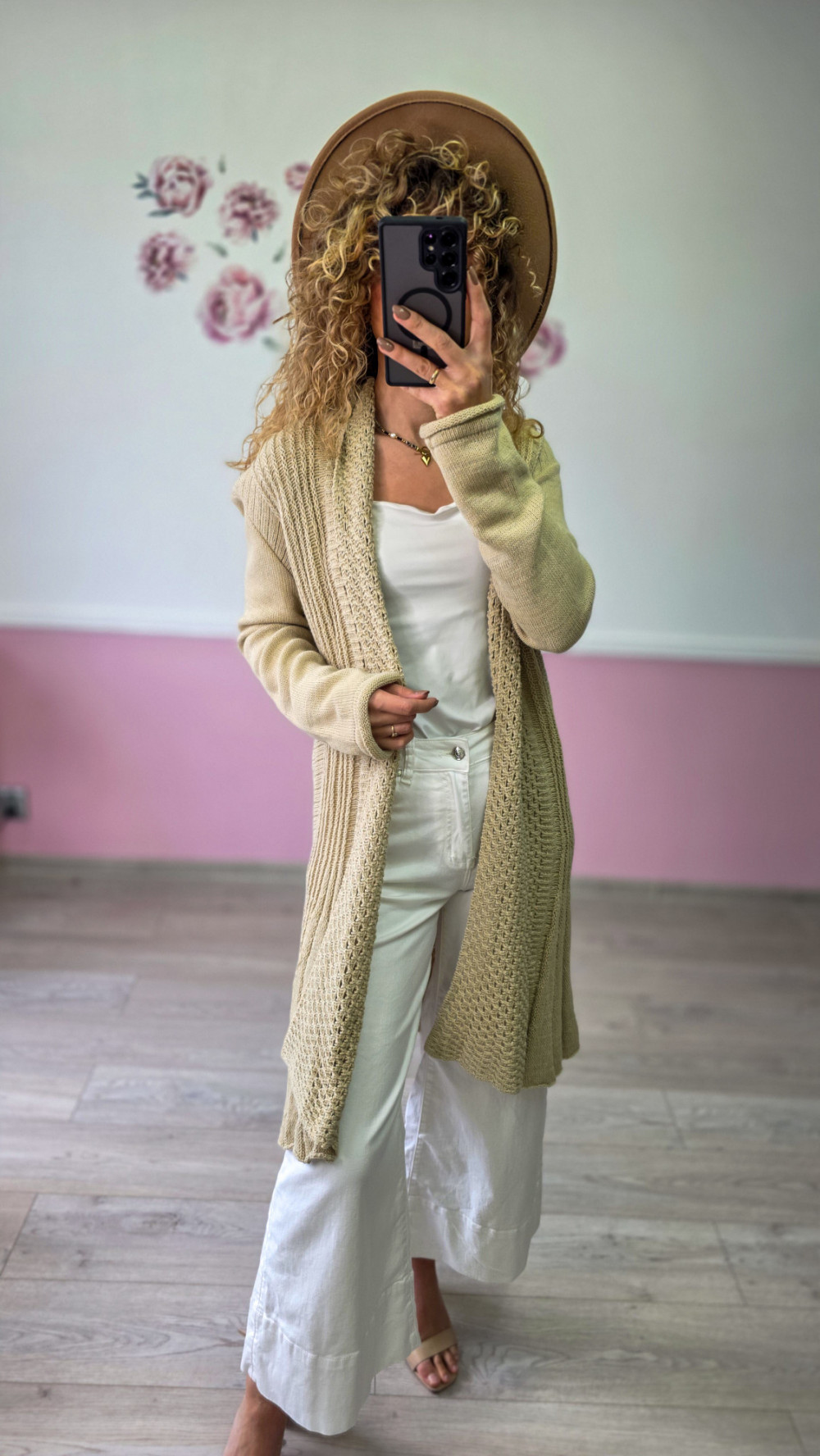 Beżowy kardigan to niezastąpiony element garderoby na chłodniejsze dni. Wykonany z miękkiej, przyjemnej dzianiny, zapewnia ciepło i wygodę. Długi krój i splot o grubym wzorze dodają mu przytulnego charakteru. Idealny do jeansów, sukienki lub legginsów.