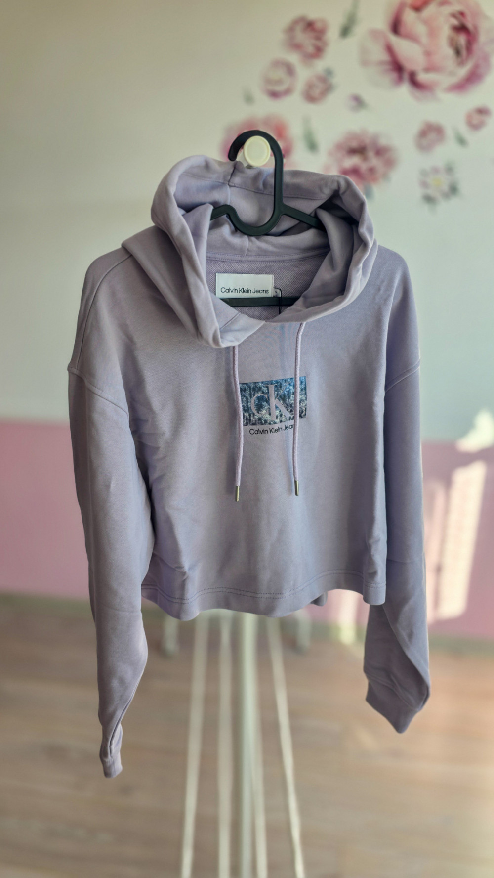 Model cropped hoodie – lekko skrócony krój, idealny do jeansów, legginsów lub spodni z wysokim stanem. Z przodu charakterystyczne logo CK Calvin Klein Jeans z ozdobną grafiką w odcieniach niebiesko-szarych.