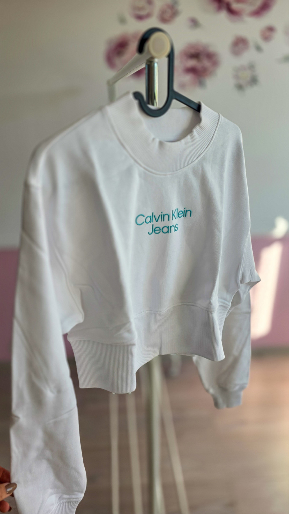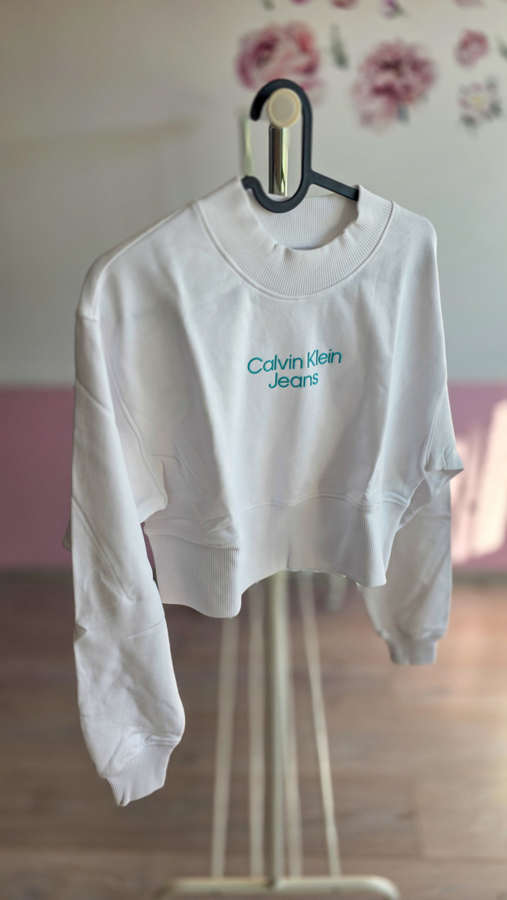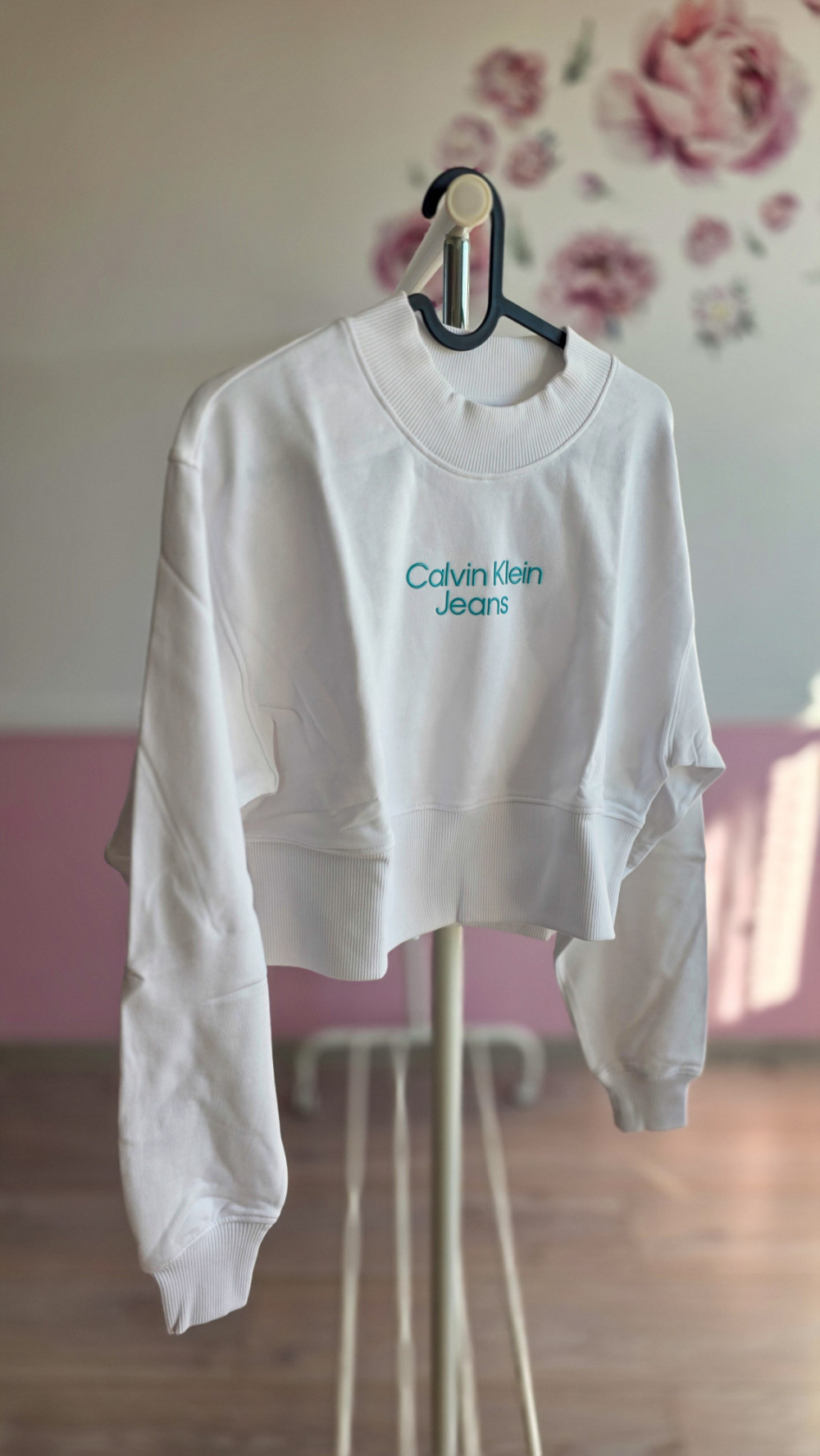 Calvin Klein Jeans – biała krótka bluza z turkusowym logo (oryginał, z metkami)