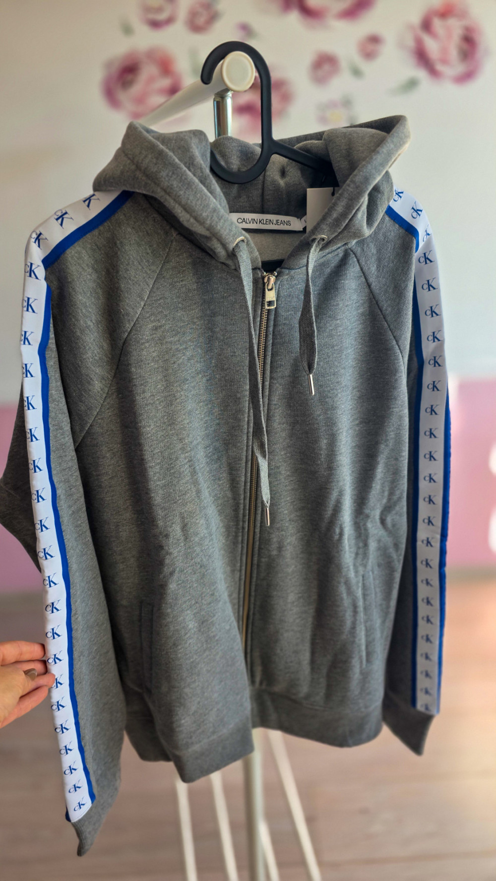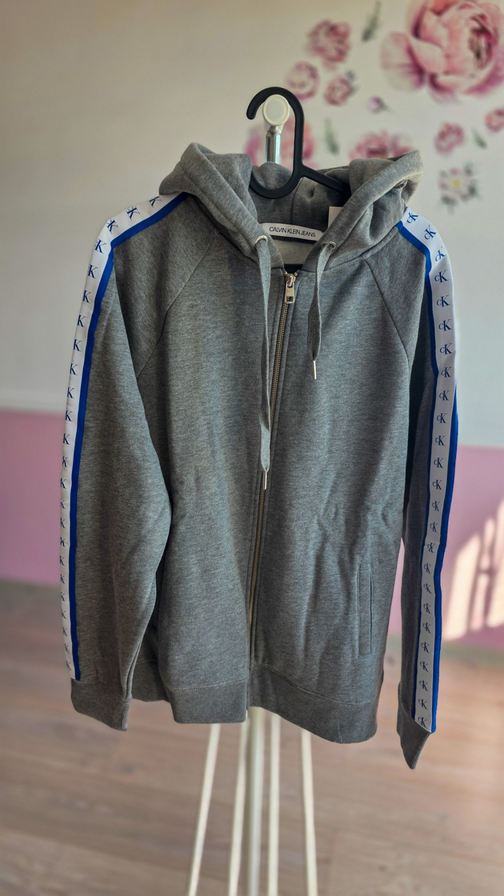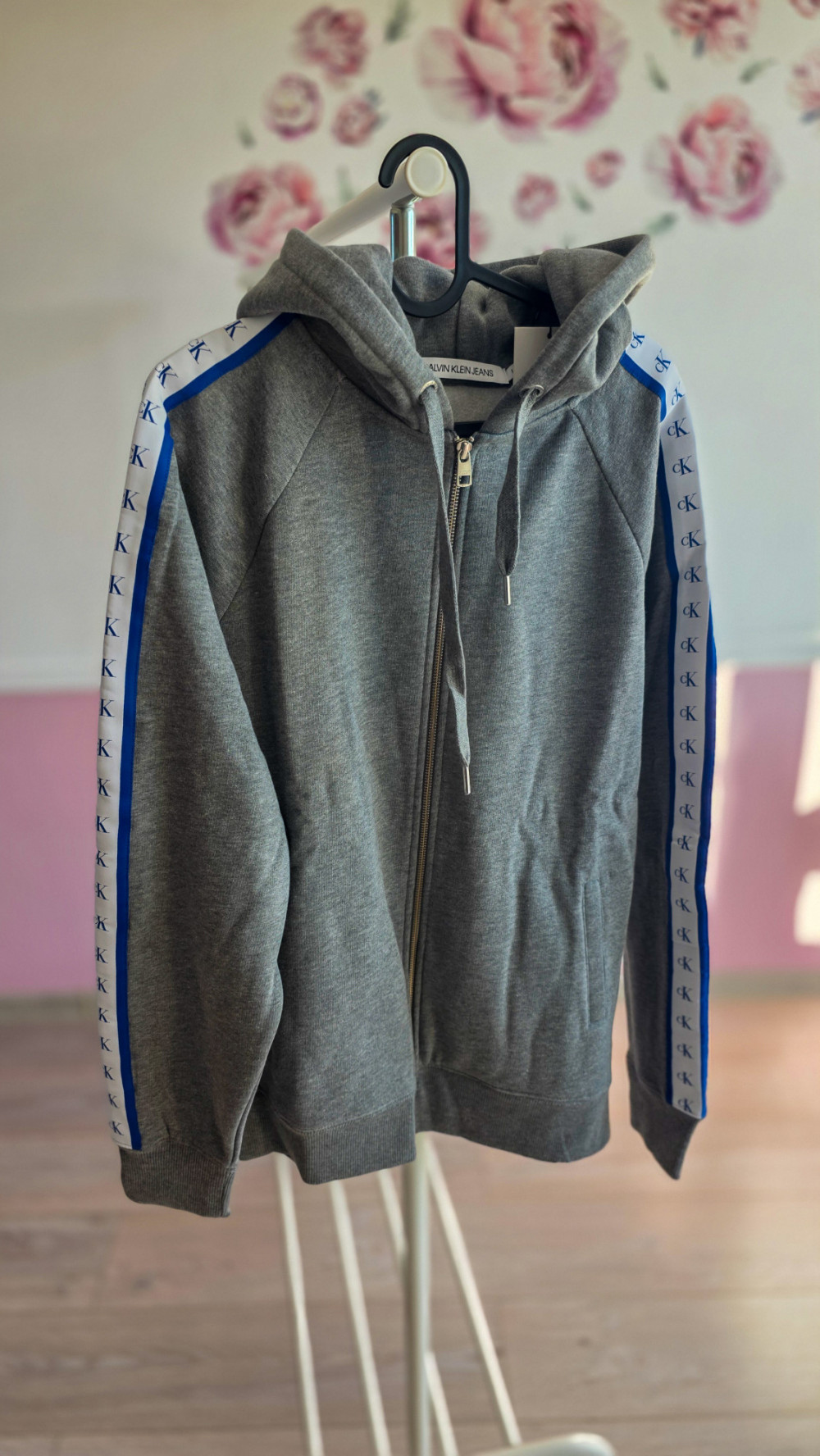 Calvin Klein Jeans – męska szara bluza z kapturem i zamkiem, taśmy z logo CK na rękawach (oryginał, z metkami)