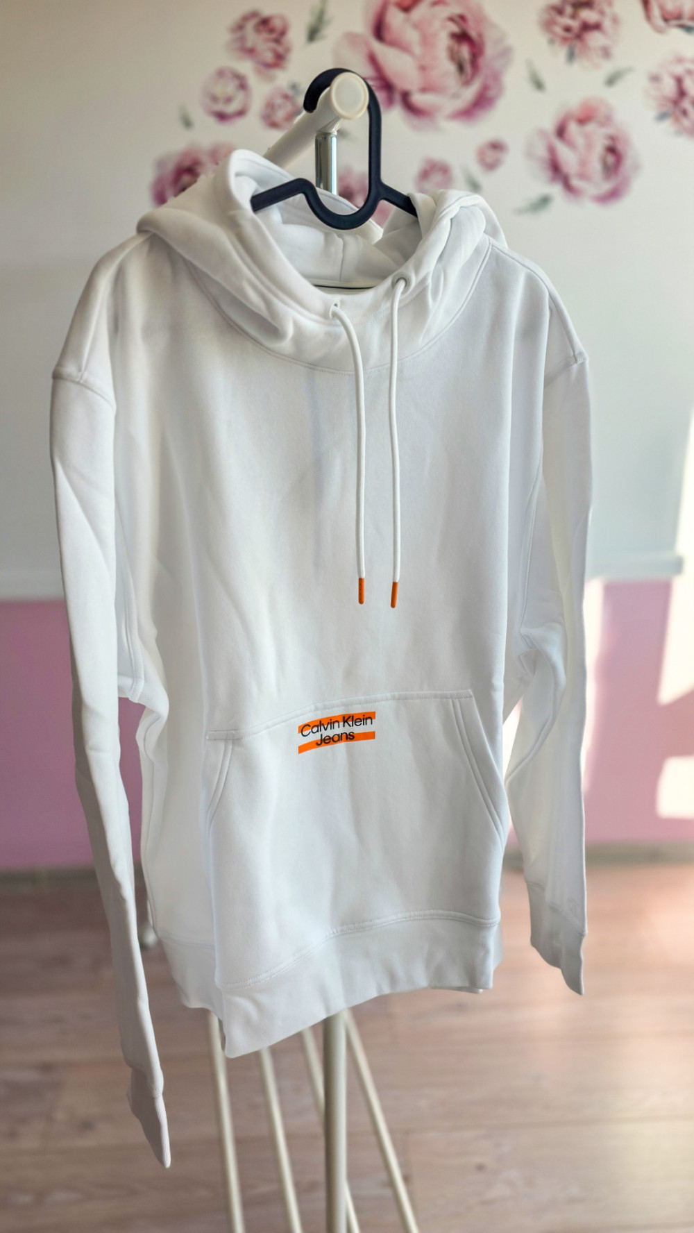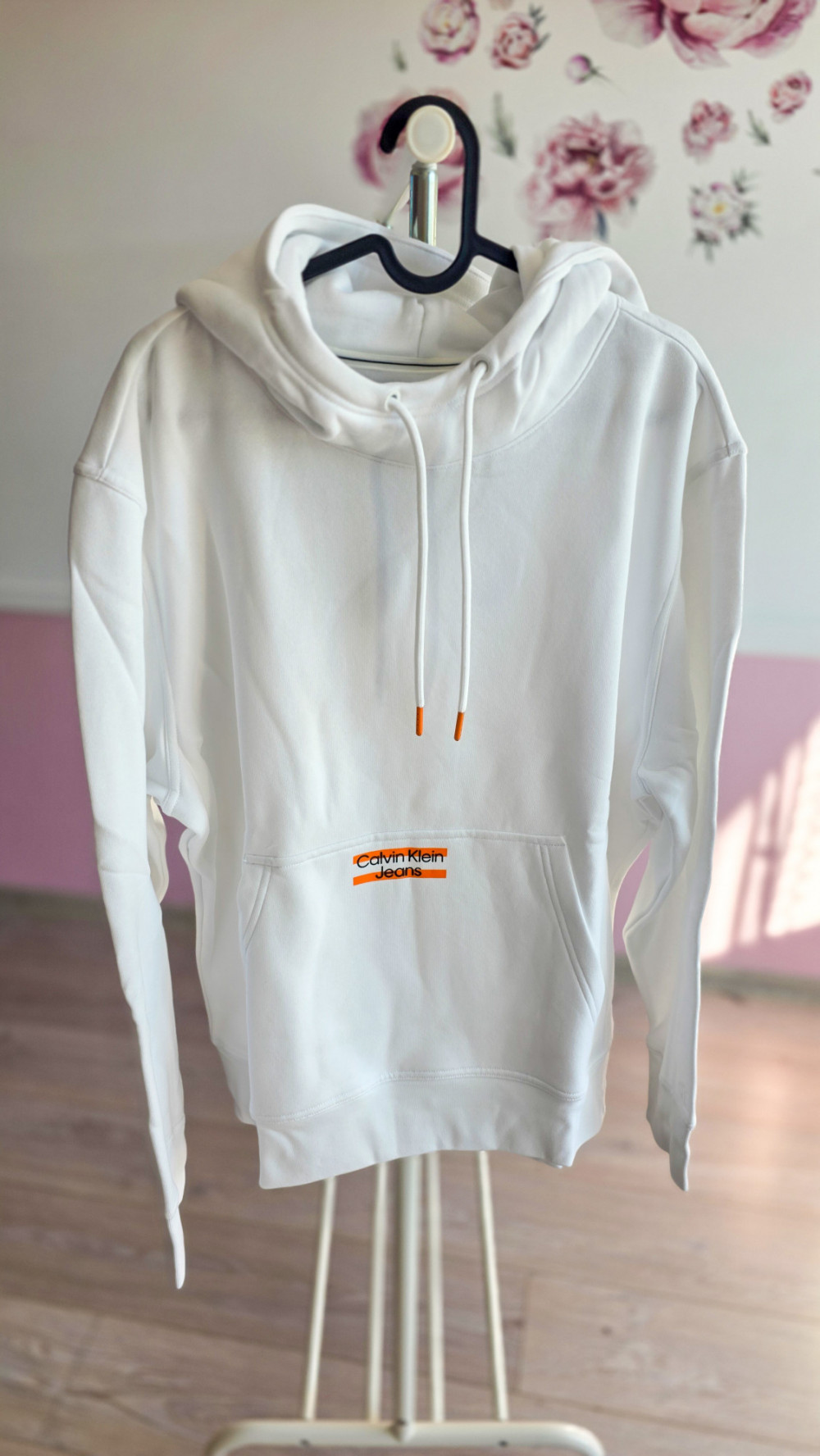 Calvin Klein Jeans – damska biała bluza z kapturem i pomarańczowym logo (oryginał, z metkami)