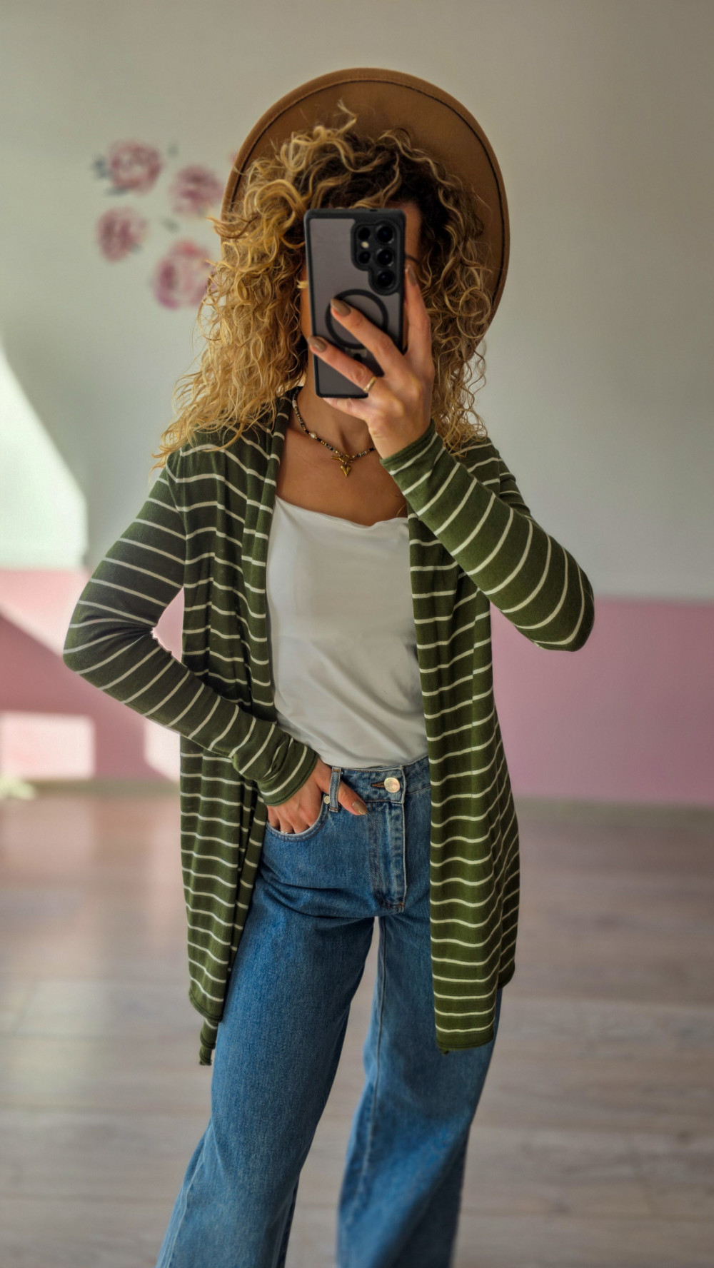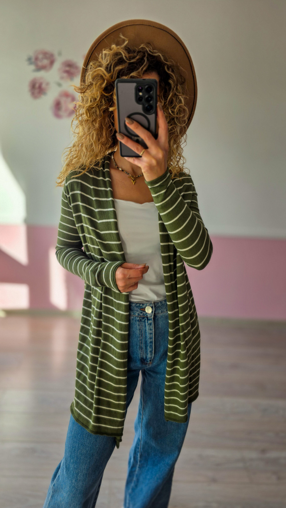 Ponadczasowy kardigan damski w zielone paski to doskonały wybór na co dzień. Delikatny, miękki materiał zapewnia wygodę, a wydłużony fason pięknie wydłuża sylwetkę. Kardigan świetnie komponuje się z basicowymi topami i jeansami, tworząc lekkie, kobiece stylizacje. To idealna propozycja dla kobiet, które szukają uniwersalnego okrycia wierzchniego na każdą porę roku — od wiosny po jesień.