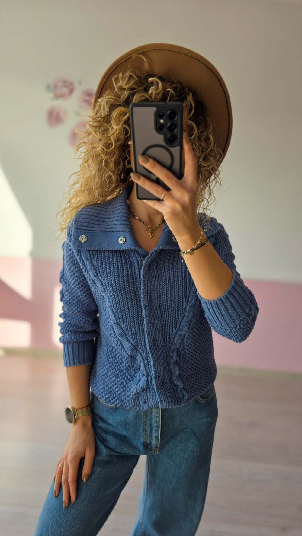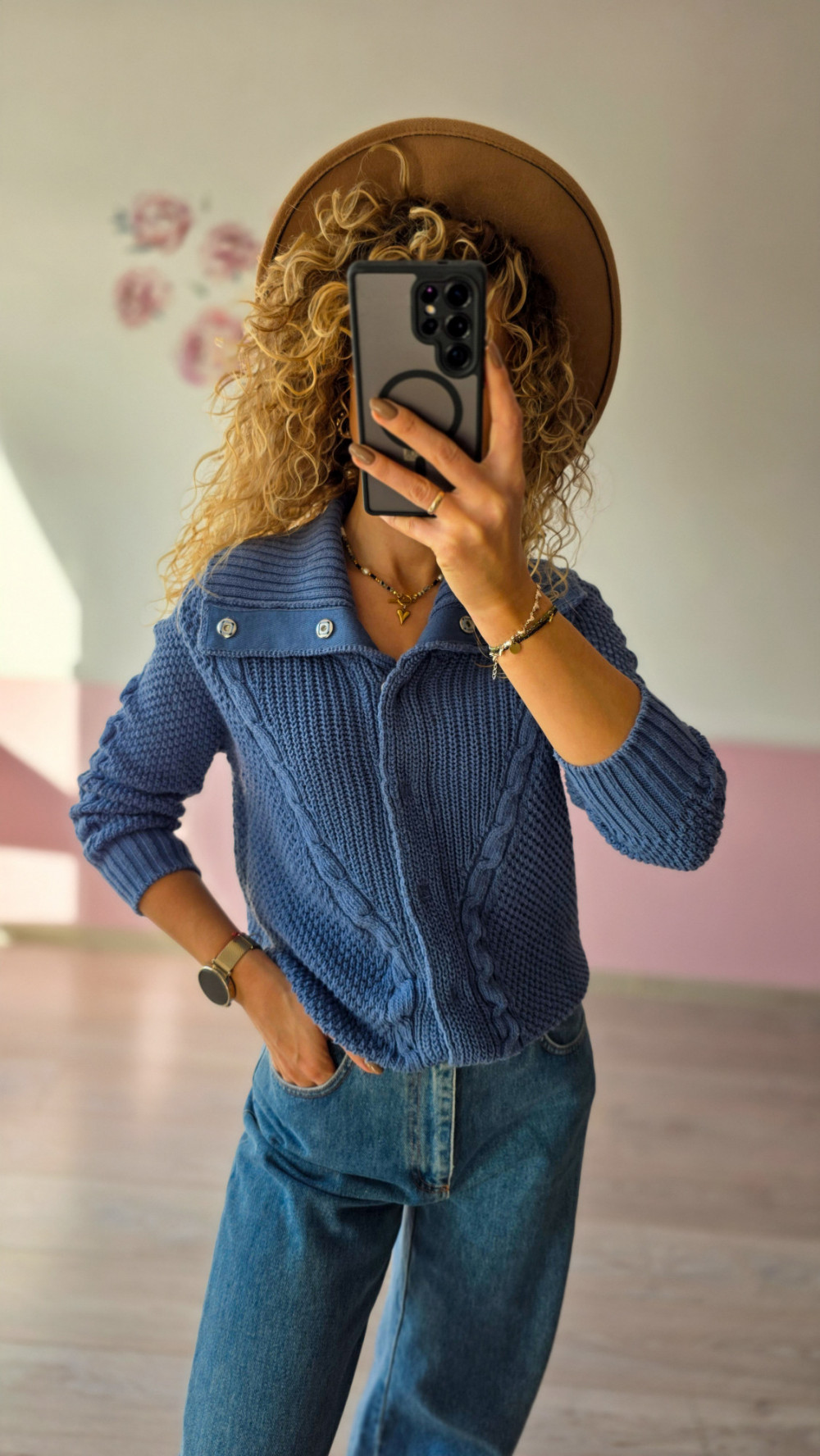 Ciepły, gruby sweter damski z szerokim kołnierzem i ozdobnymi splotami to obowiązkowy element garderoby na chłodniejsze dni. Wykonany z miękkiej, przyjemnej przędzy, zapewnia komfort noszenia i stylowy wygląd. Kołnierz zapinany na guziki dodaje mu elegancji, a klasyczny granatowy kolor sprawia, że pasuje do większości stylizacji. Idealny do jeansów, spodni z wysokim stanem czy spódnic — świetnie sprawdzi się w codziennych i smart casualowych outfitach.